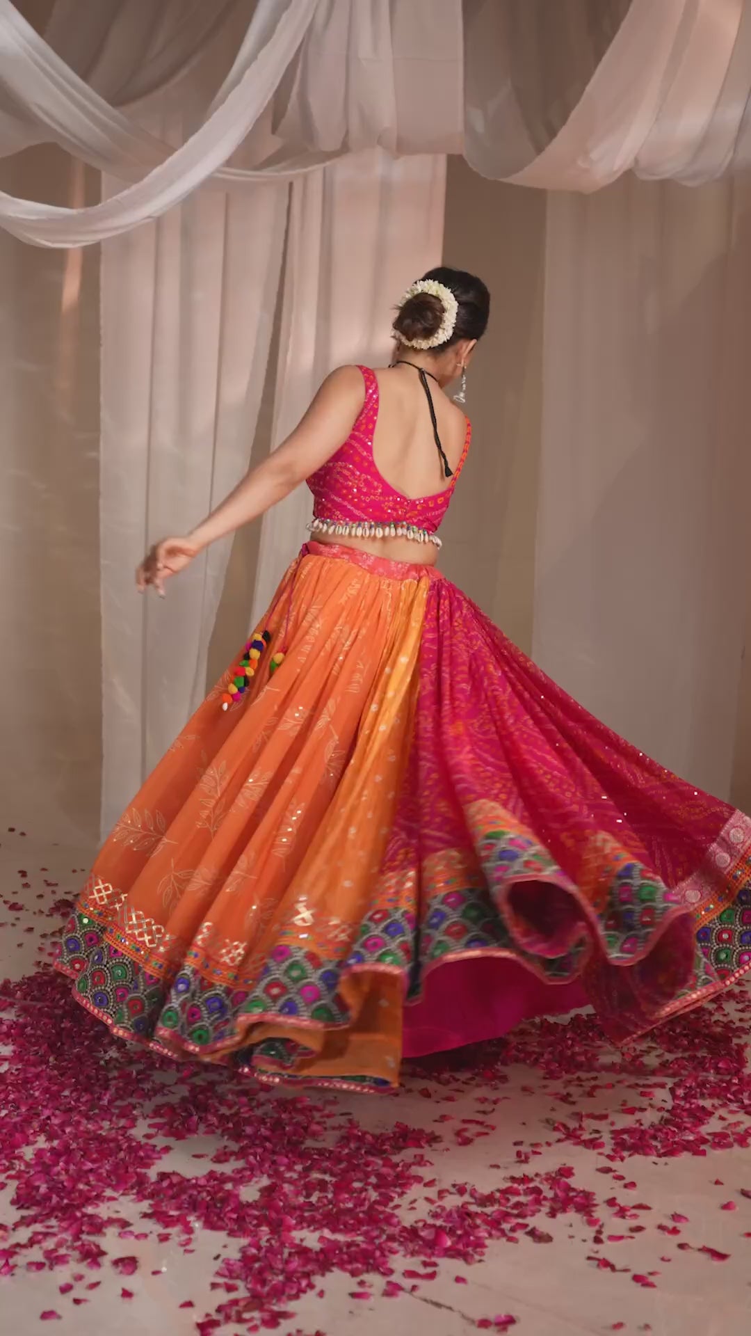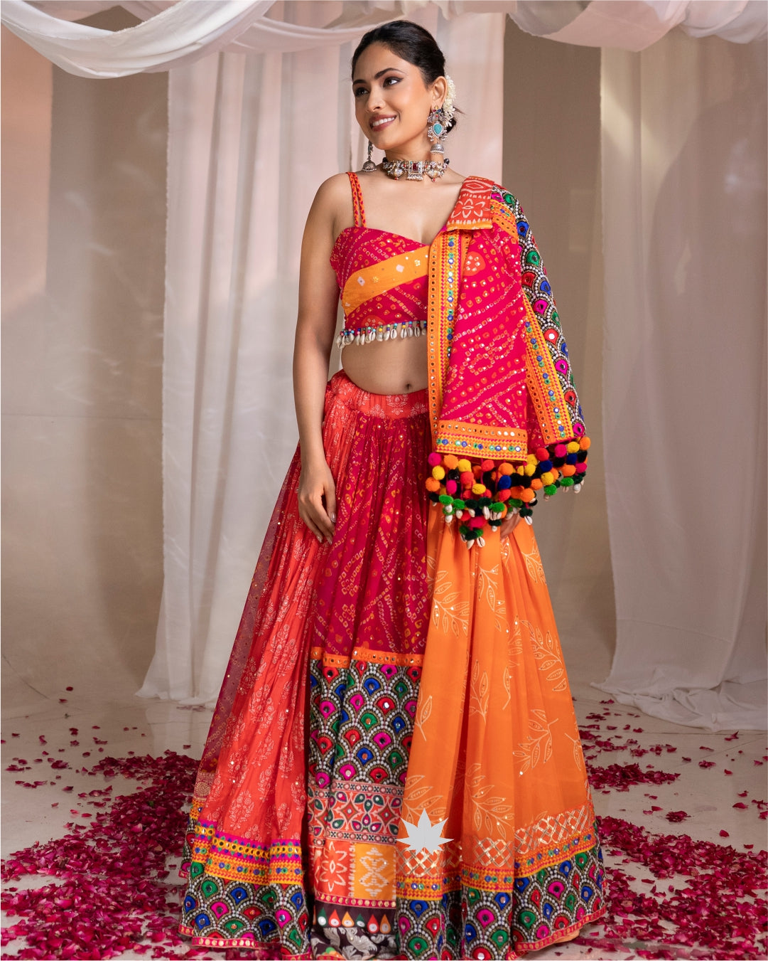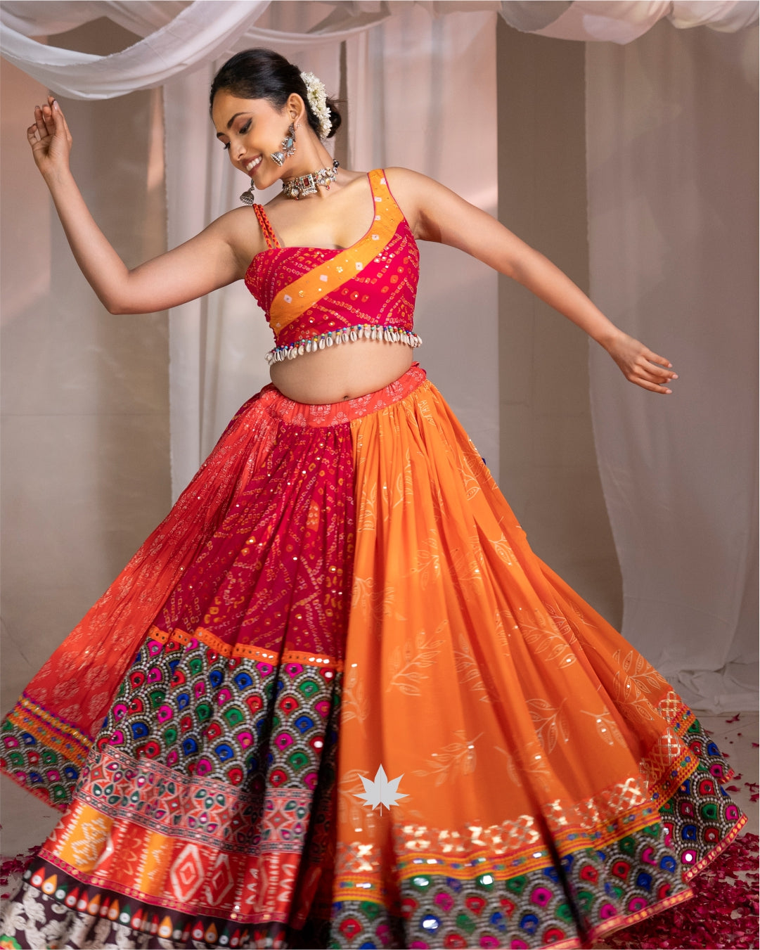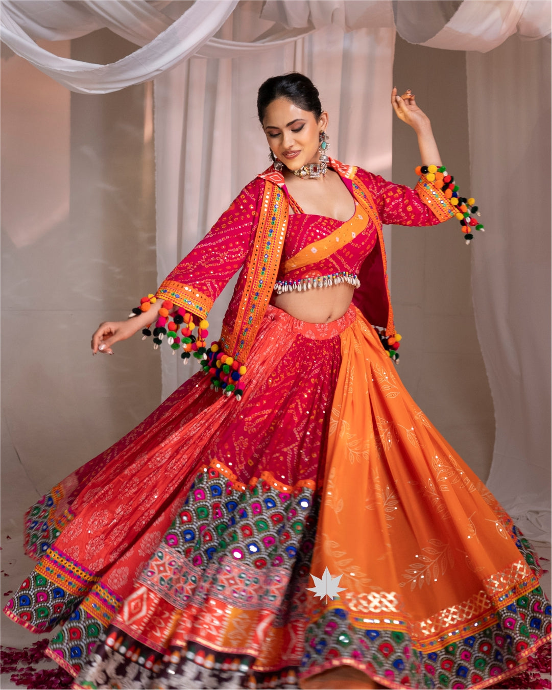 This vibrant chaniya choli is a celebration of traditional craft and festive spirit. The lehenga features a striking mix of red and orange bandhani-inspired patterns, beautifully contrasted with an Ajrakh-style printed border highlighted with mirror work. The blouse is designed with a modern cut yet rooted in tradition, finished with delicate shell tassels. Adding versatility and elegance, the set comes with a matching printed jacket that can be styled for different Navratri looks.