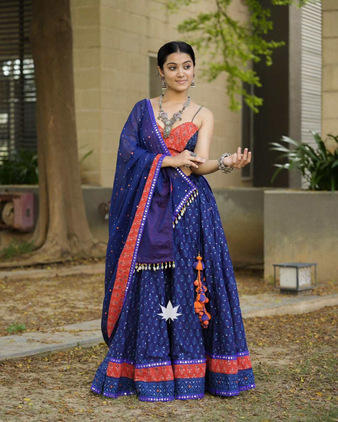 This Beautiful Blue Chaniya Has A Contrasting Orange Border To It Paired With A Patchwork Blouse And A Blue Dupatta Embellished With Mirrors And Sequins