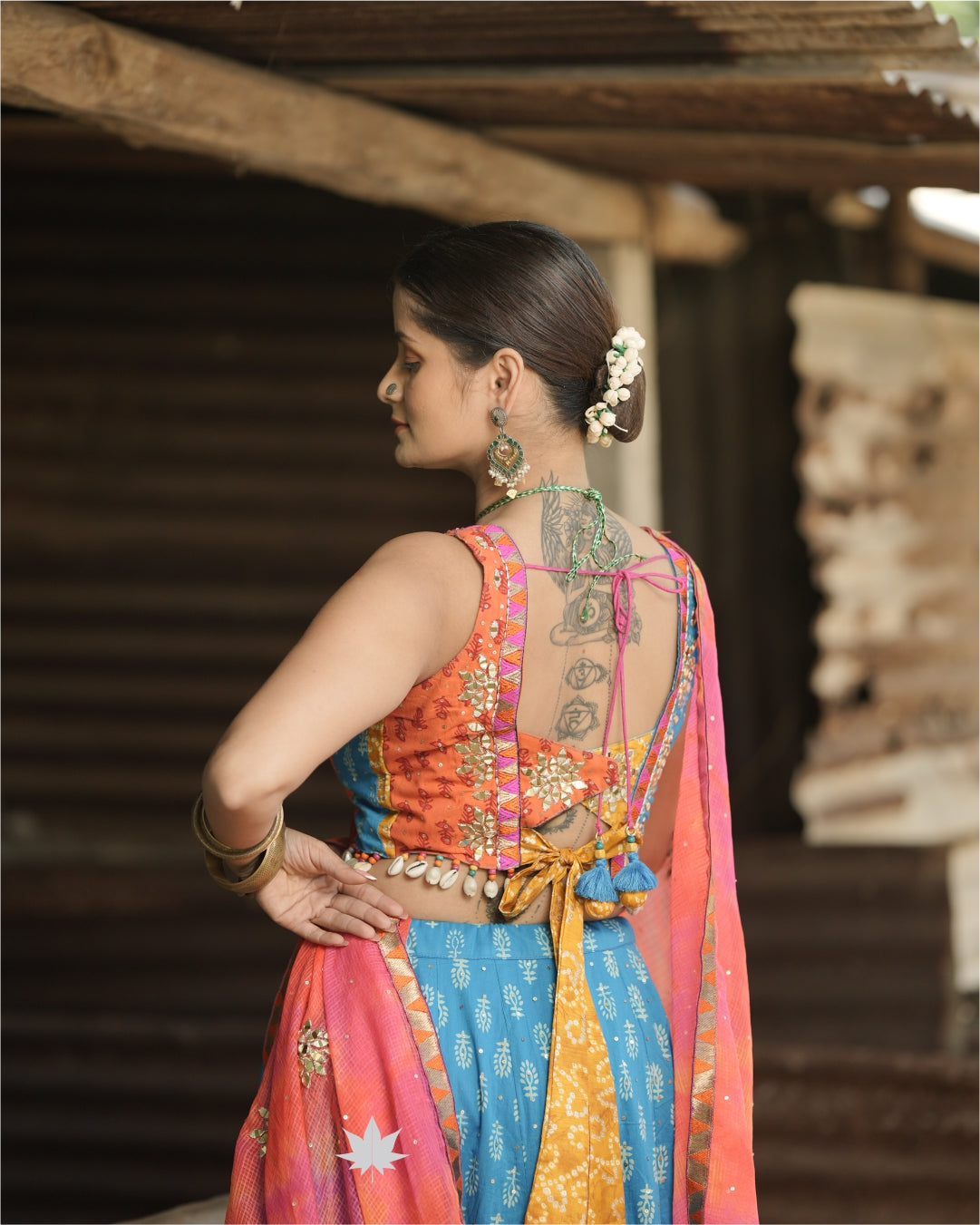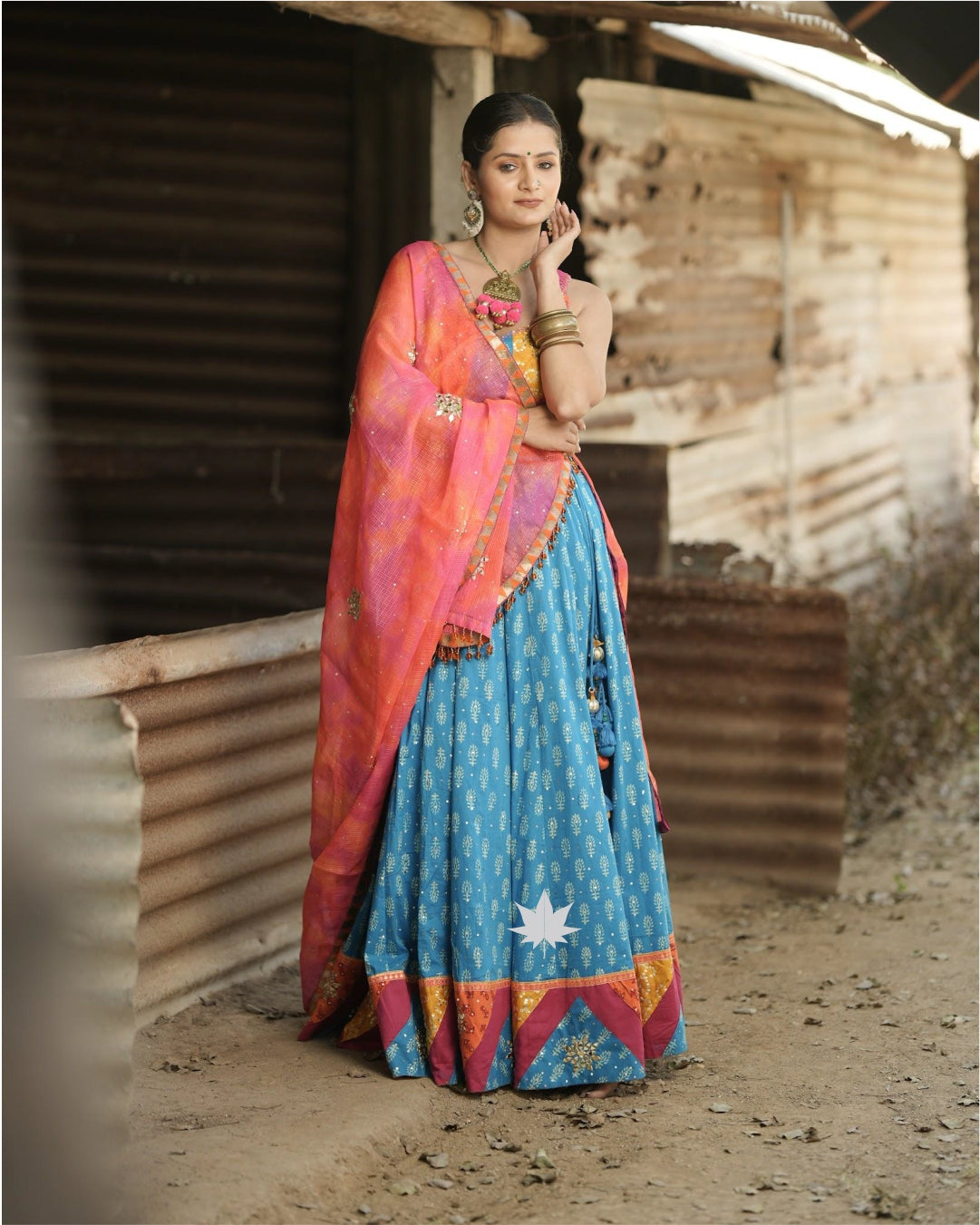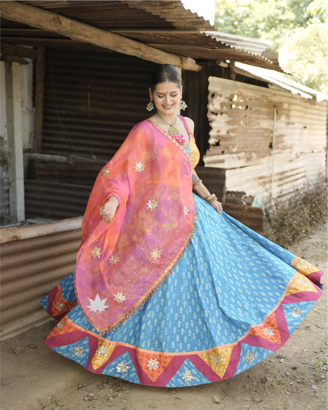 This blue and orange cotton chaniya choli set features a blue block print lehenga with patchwork and golden threadwork. The orange sleeveless blouse is detailed with mirror work, golden embroidery, shell trims, and tie-up tassels at the back. A pink and orange ombré dupatta with gota patti detailing and scattered mirror work completes the look—ideal for Garba nights, Navratri twirls, or traditional festivities.