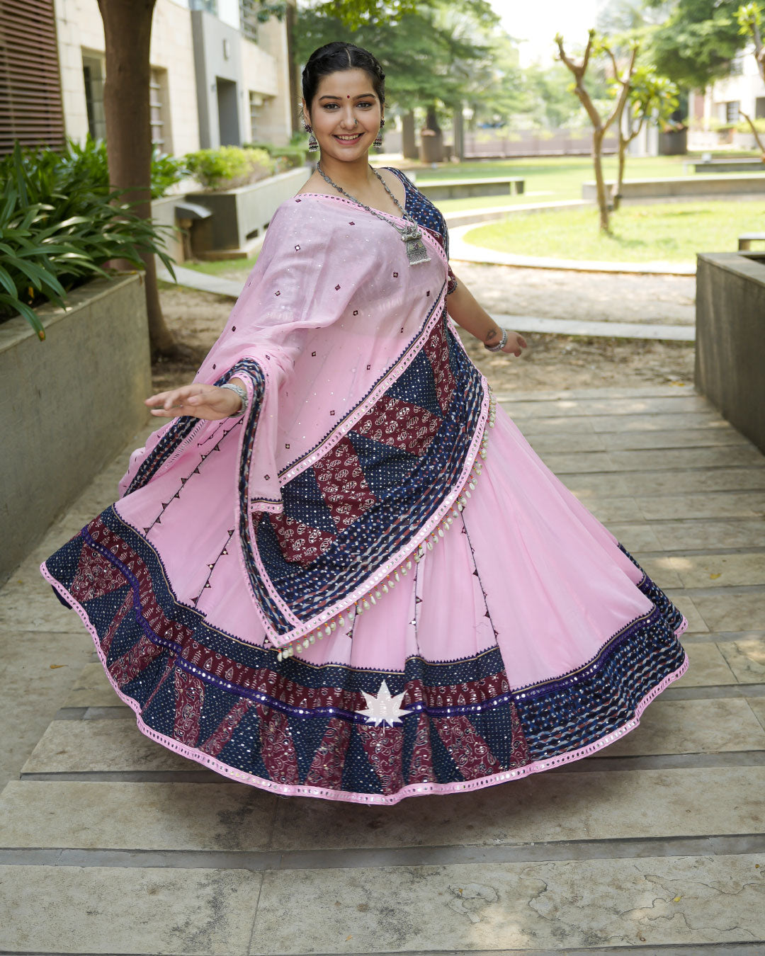 This Pink Chaniya Has A Beaustiful Contrasting Patchwork Border To It With An Asymmetrical Design Paired With A Contrasting Blue Blouse And A Matching Pink Patchwork Dupatta
