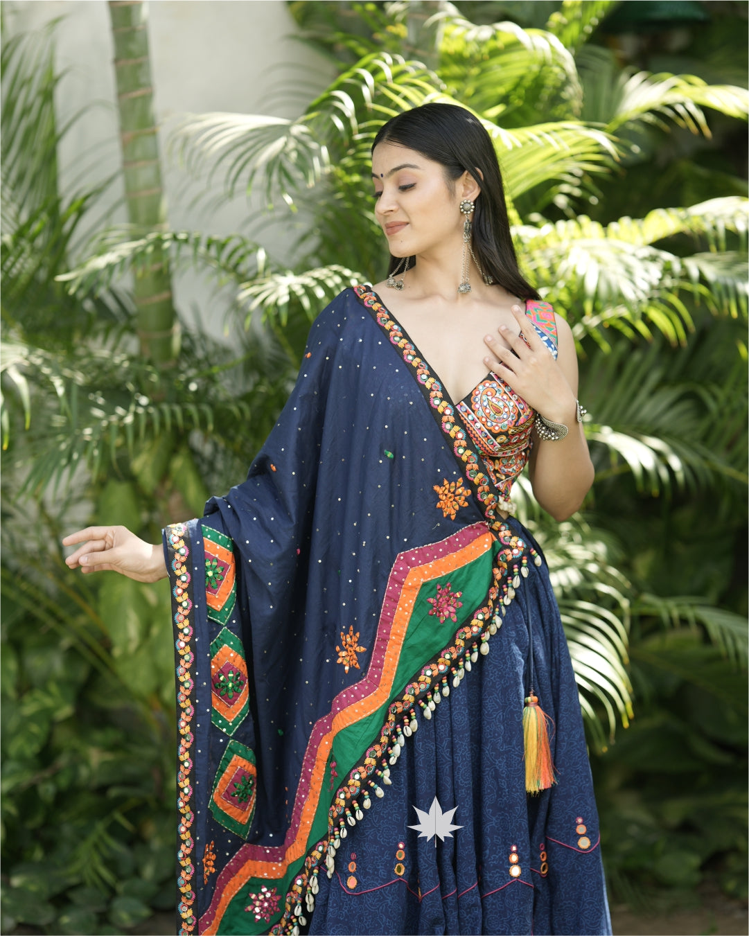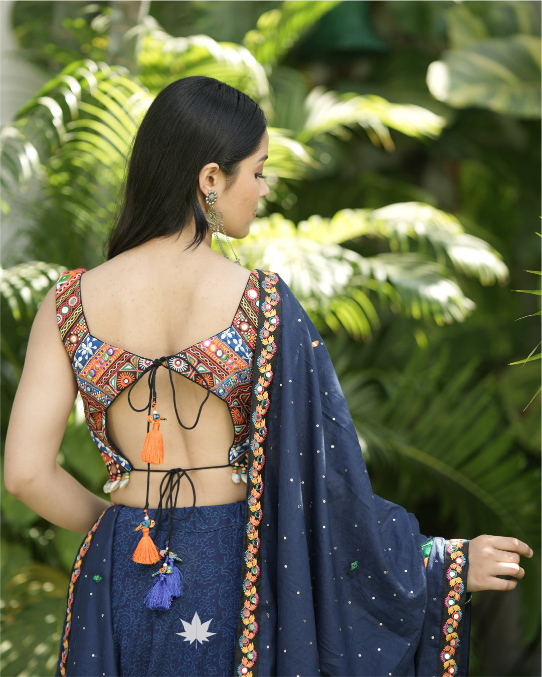 This blue chaniya choli set is crafted from breathable cotton with a traditional block print pattern. Both the chaniya and dupatta are adorned with mirrorwork detailing, threadwork, and a multicolor embroidered border. It is paired with a colorful patchwork blouse, making it a perfect choice for Navratri and festive occasions.