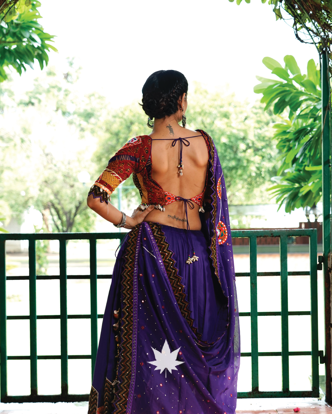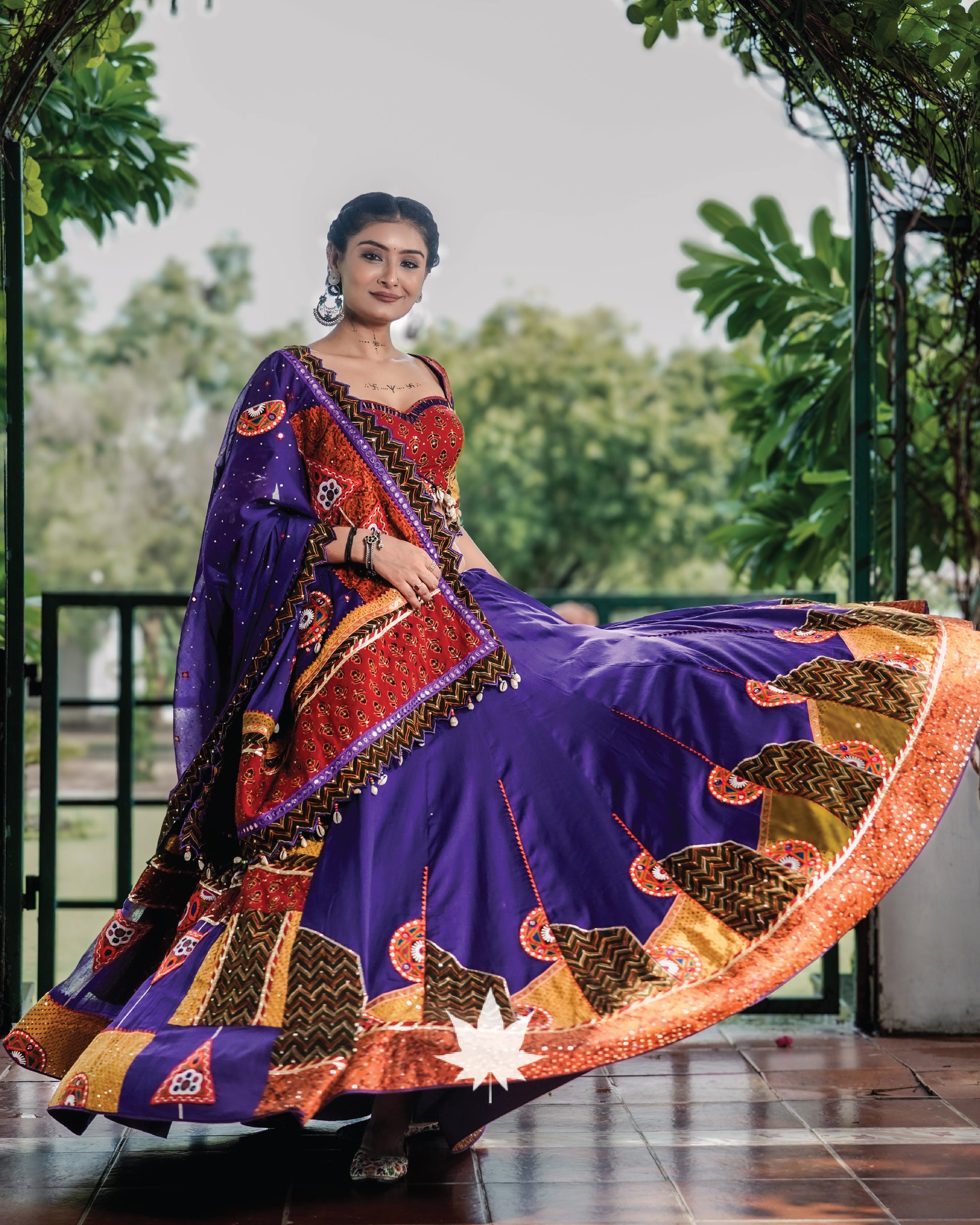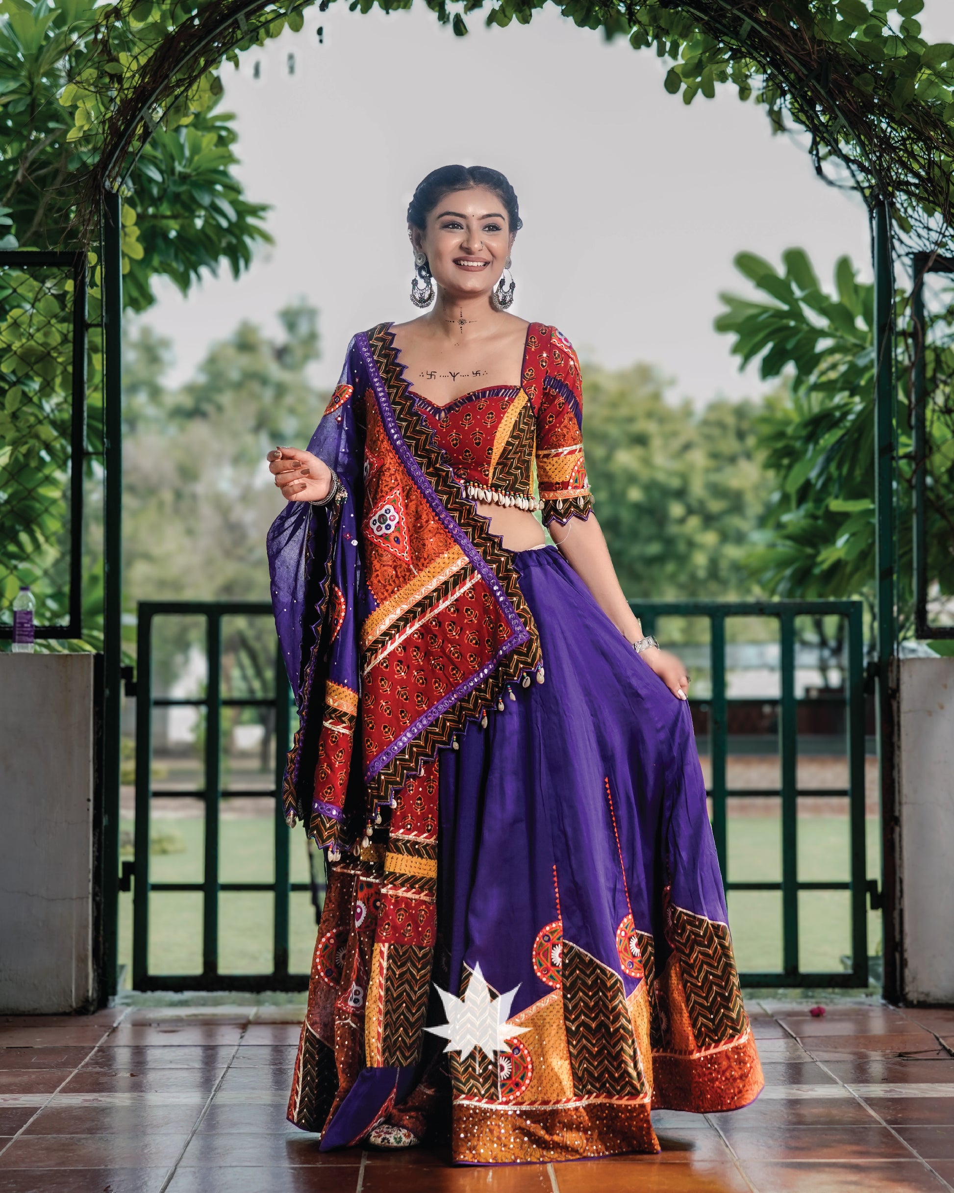 Blue Multicolor Patchwork Chaniya With Matching Patchwotk Mirror Work Gamthi Dupatta Paired With Patchwork Blouse