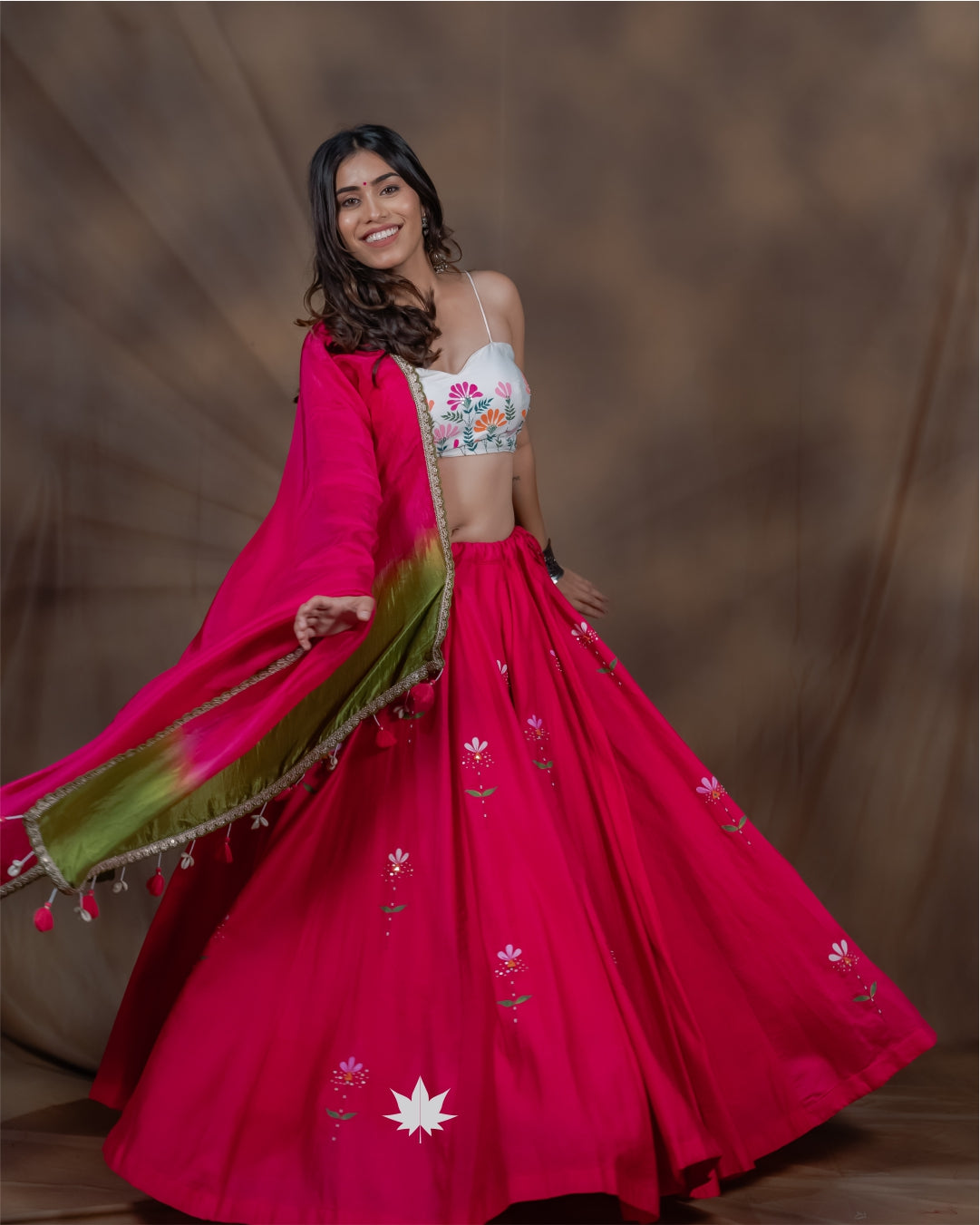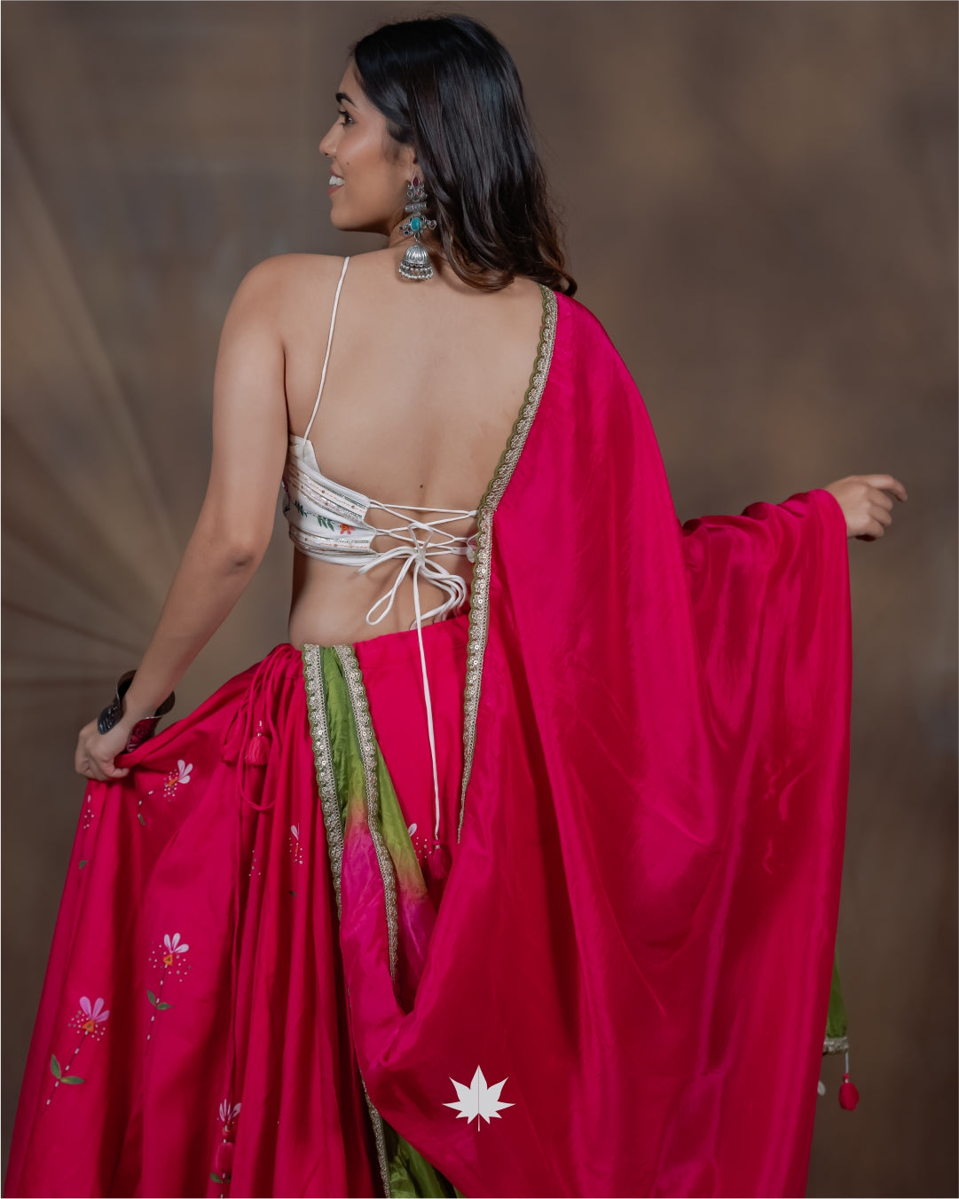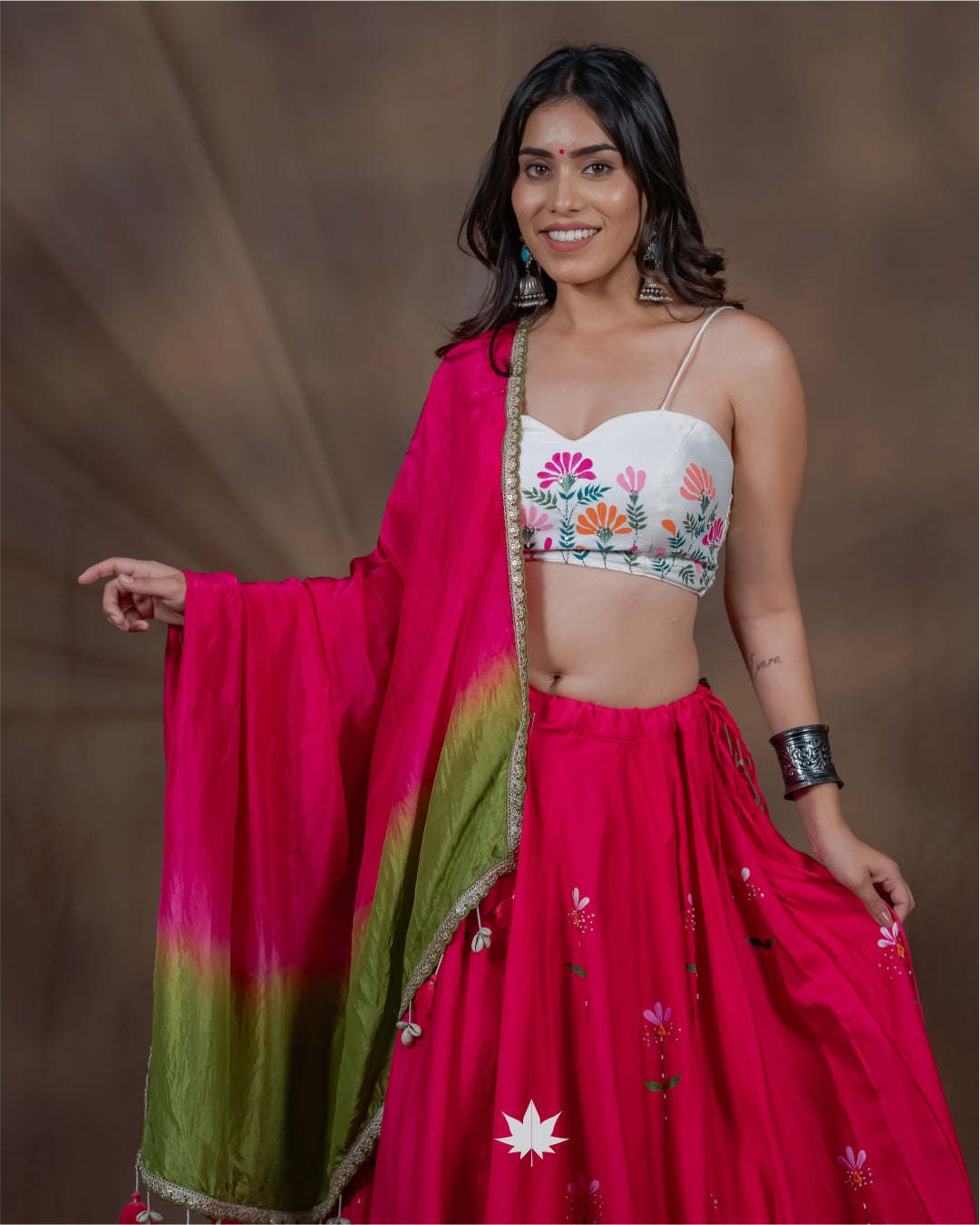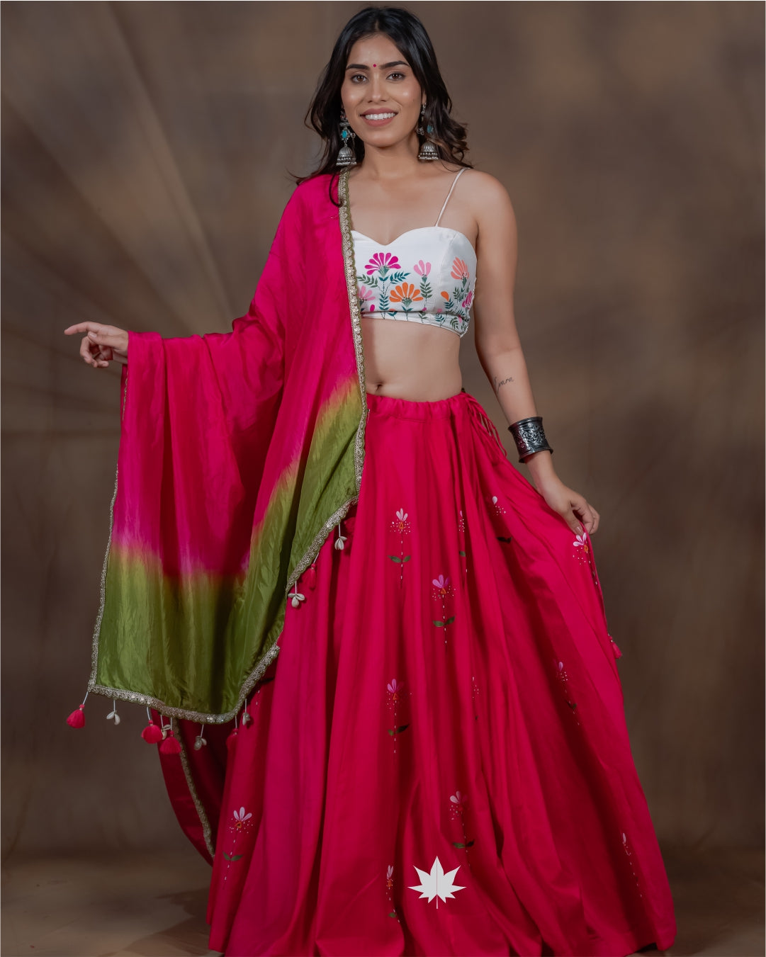 Unveil artistic elegance with our Blush Hand-Painted Grace chaniya choli. Crafted in breathable pure cotton, this stunning ensemble pairs soft white and pink tones with delicate hand-painted detailing, making each piece truly one-of-a-kind. The flowing ghera adds a graceful twirl, while the artisanal touches bring a blend of tradition and creativity. Perfect for Navratri nights, festive gatherings, or special cultural occasions, this chaniya choli is a masterpiece of wearable art.