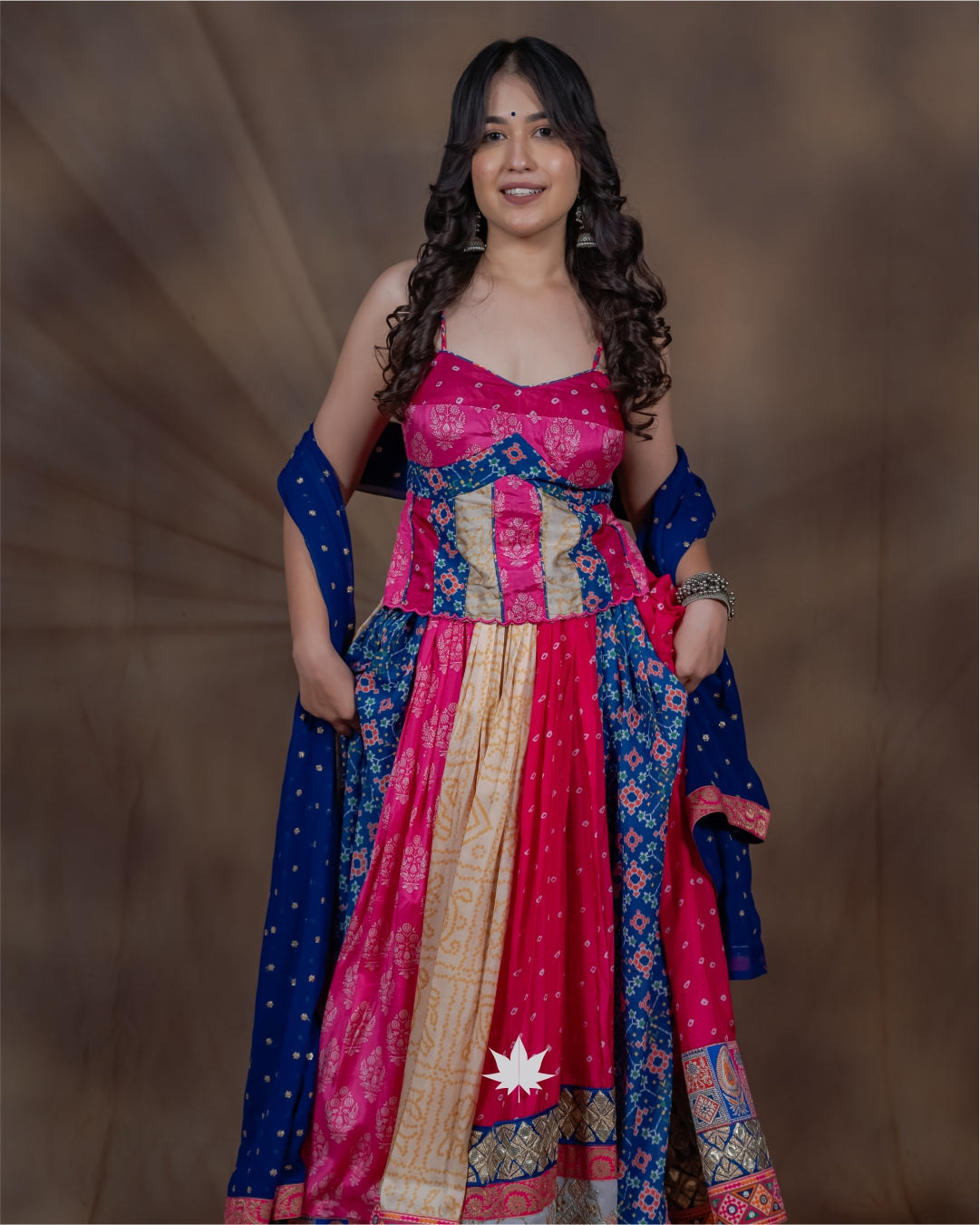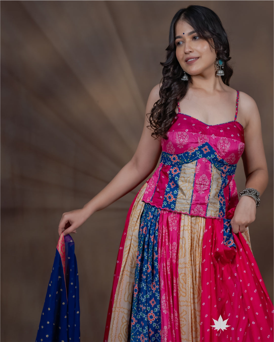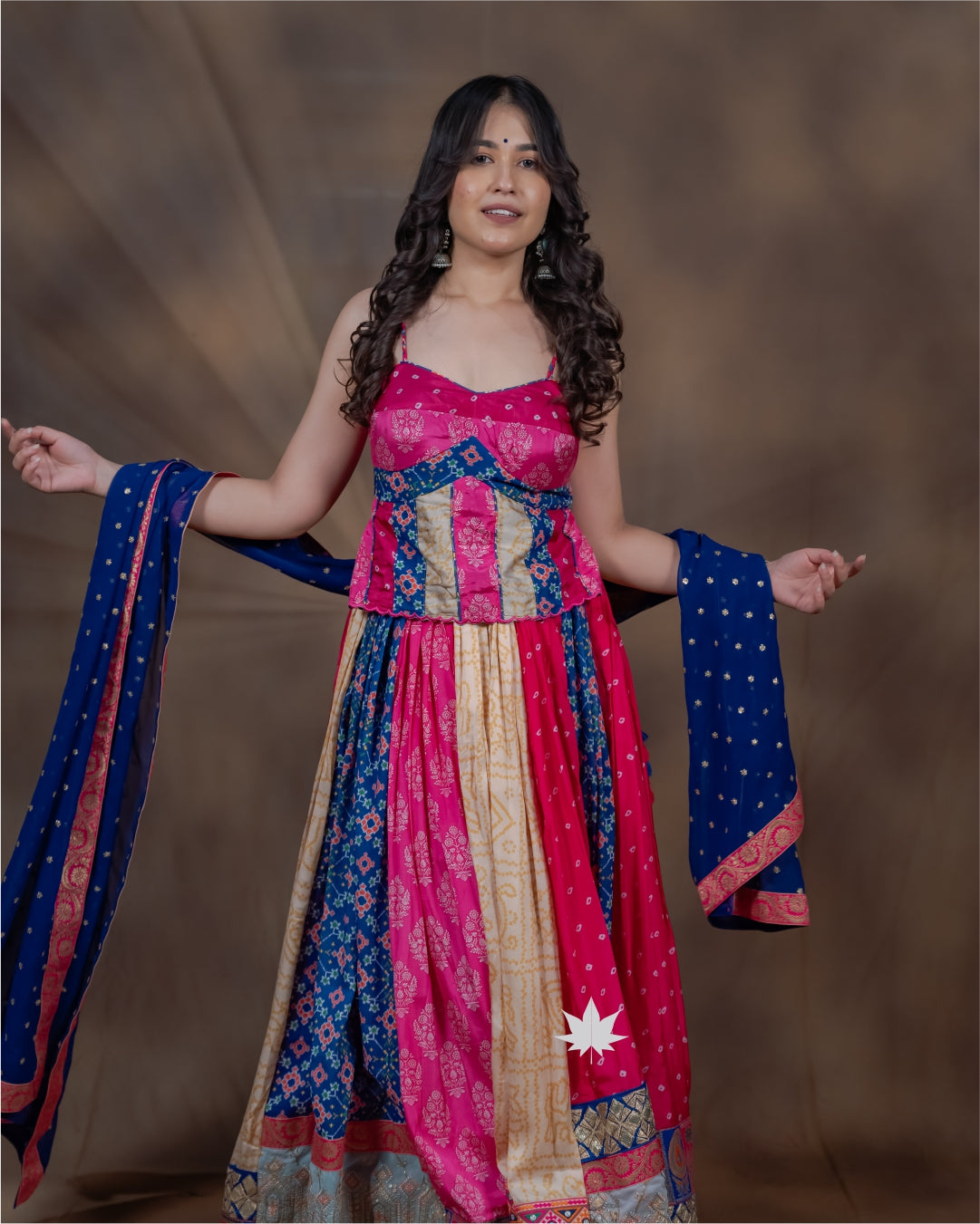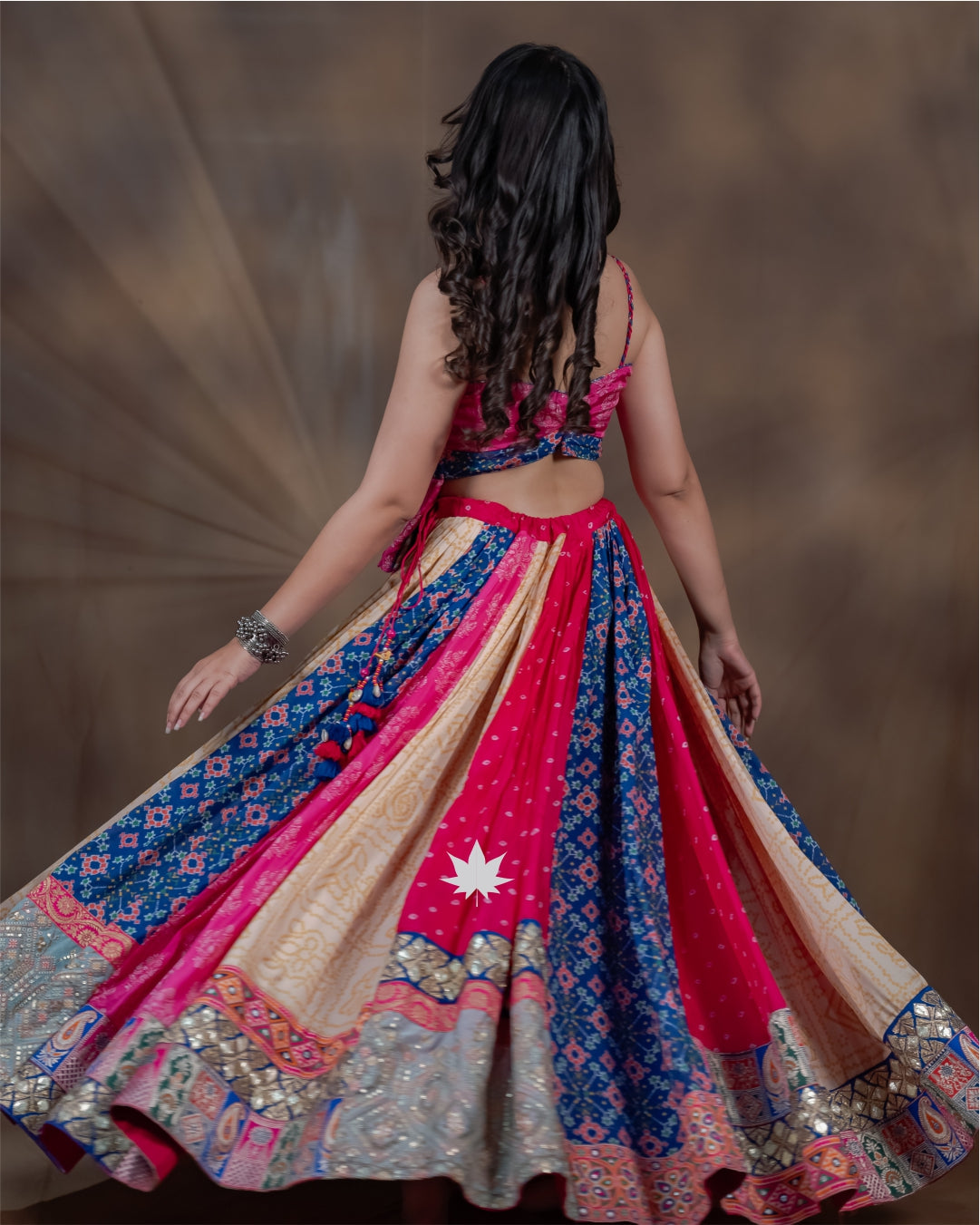 Turn heads this festive season with our Boho Multi-Colour Charm chaniya choli. Crafted in vibrant multi-colour tones, this playful ensemble comes with a chic top-style blouse that adds a modern twist to traditional wear. The full ghera chaniya bursts with festive energy, making it perfect for Navratri, Garba nights, and cultural celebrations. Designed for comfort and style, this piece brings together bold colours, effortless movement, and contemporary flair—a must-have for your festive wardrobe.
