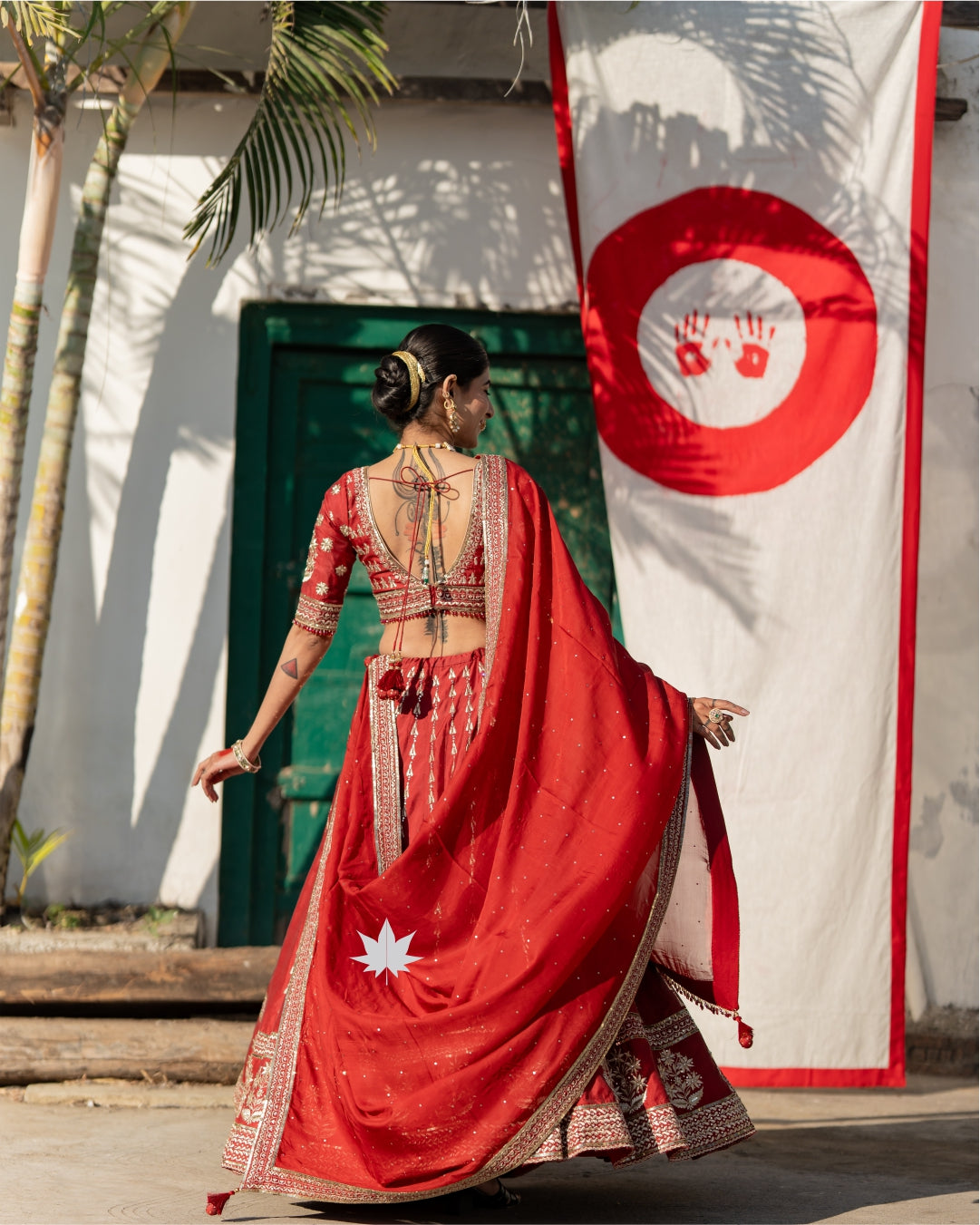 Draped in tradition yet designed for the contemporary bride, our ‘Burgundy Bliss’ Bridal Lehenga is an ode to timeless elegance. The deep burgundy hue, a symbol of prosperity and passion, is adorned with intricate golden embroidery, reflecting the grandeur of royal heritage.
