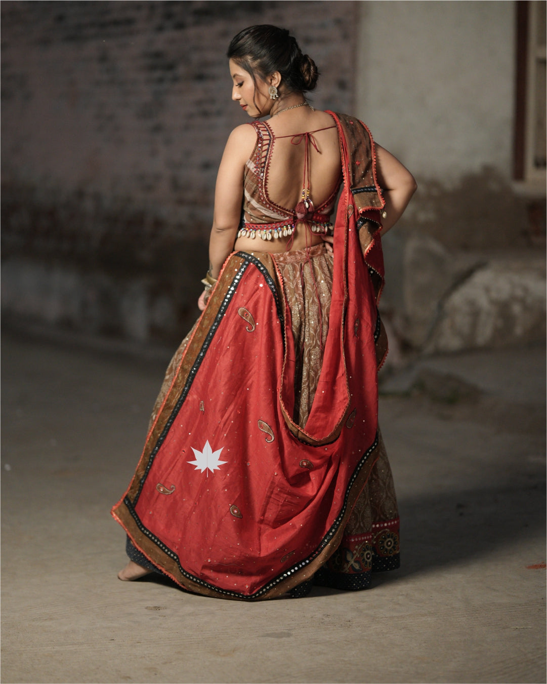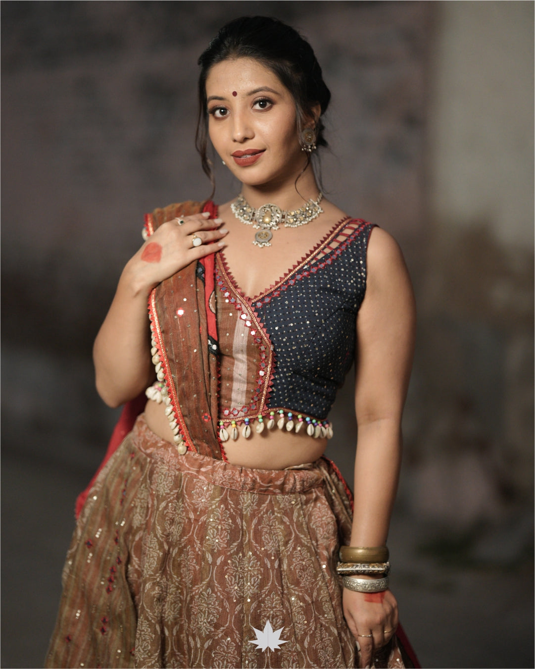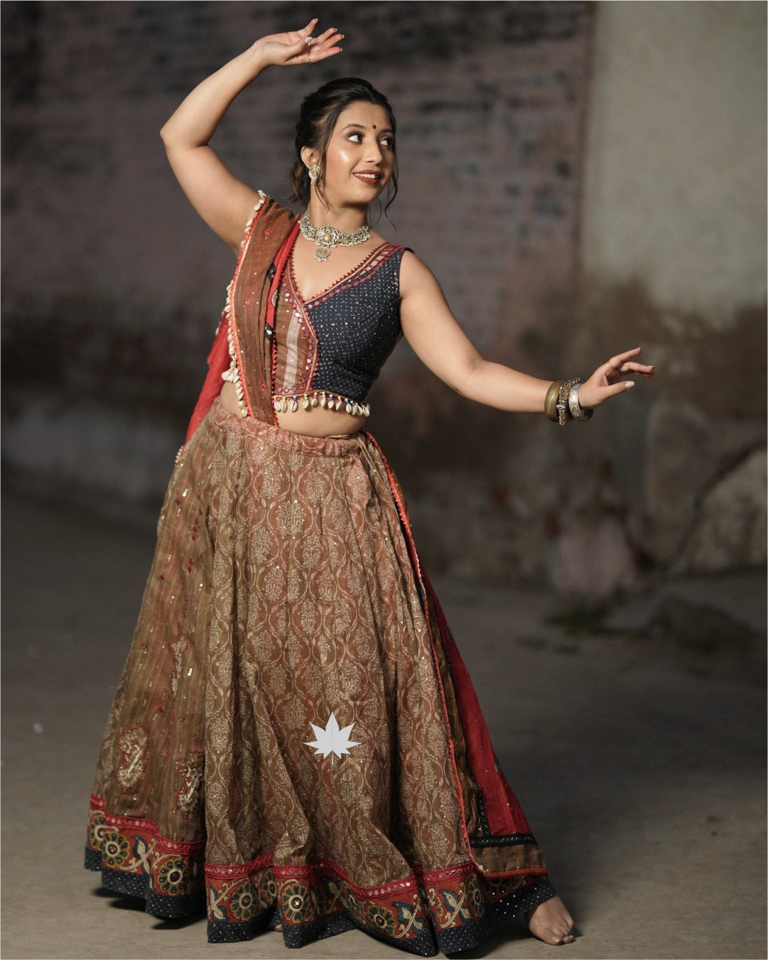 This coffee brown chaniya is crafted in breathable cotton, featuring traditional block prints, mirror work, and a Gamthi-style border. It is paired with a navy blue blouse and a matching coffee brown dupatta, both adorned with deity mirror work and a shell lace border—perfect for Navratri and festive celebrations.