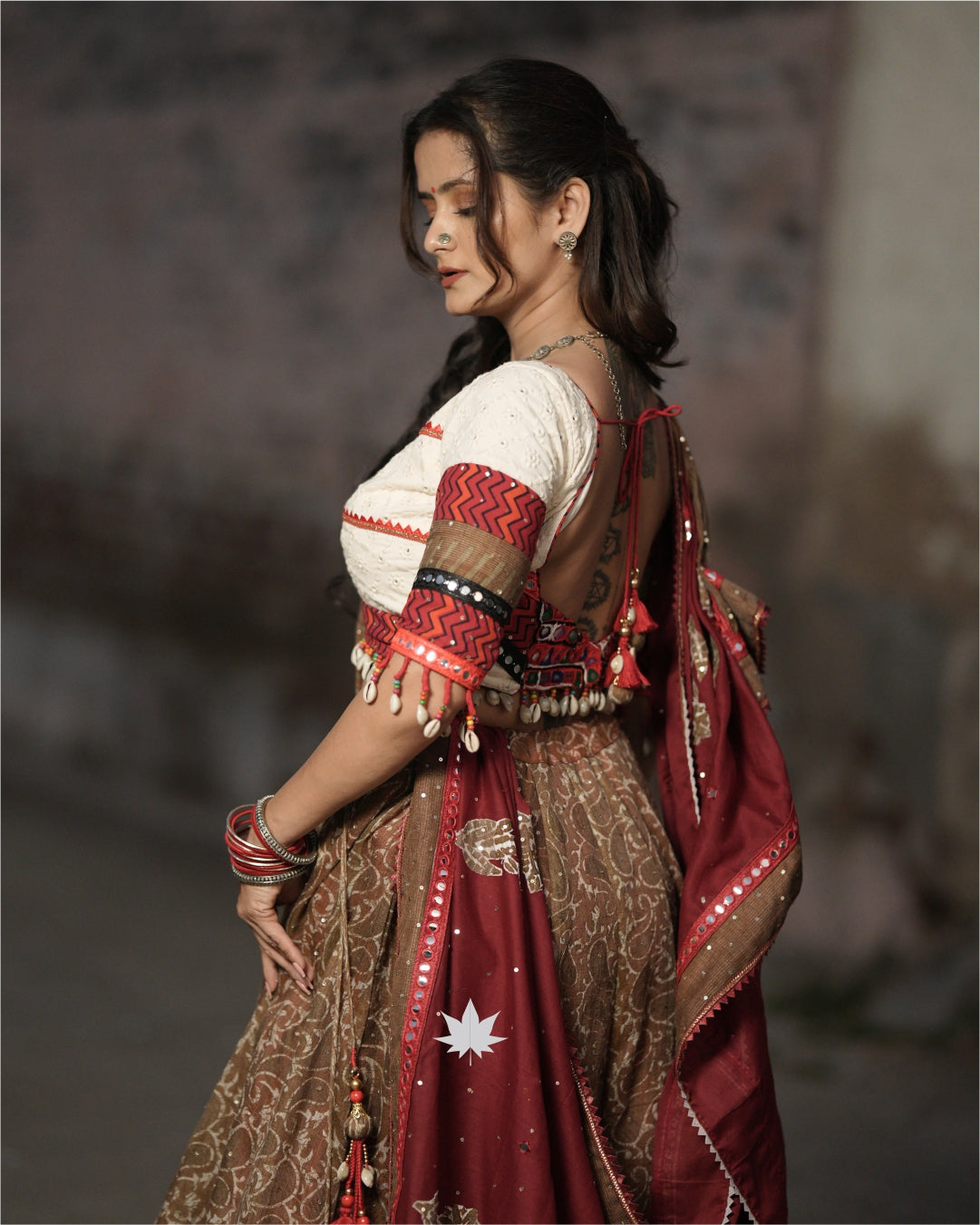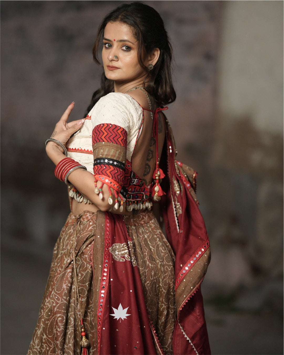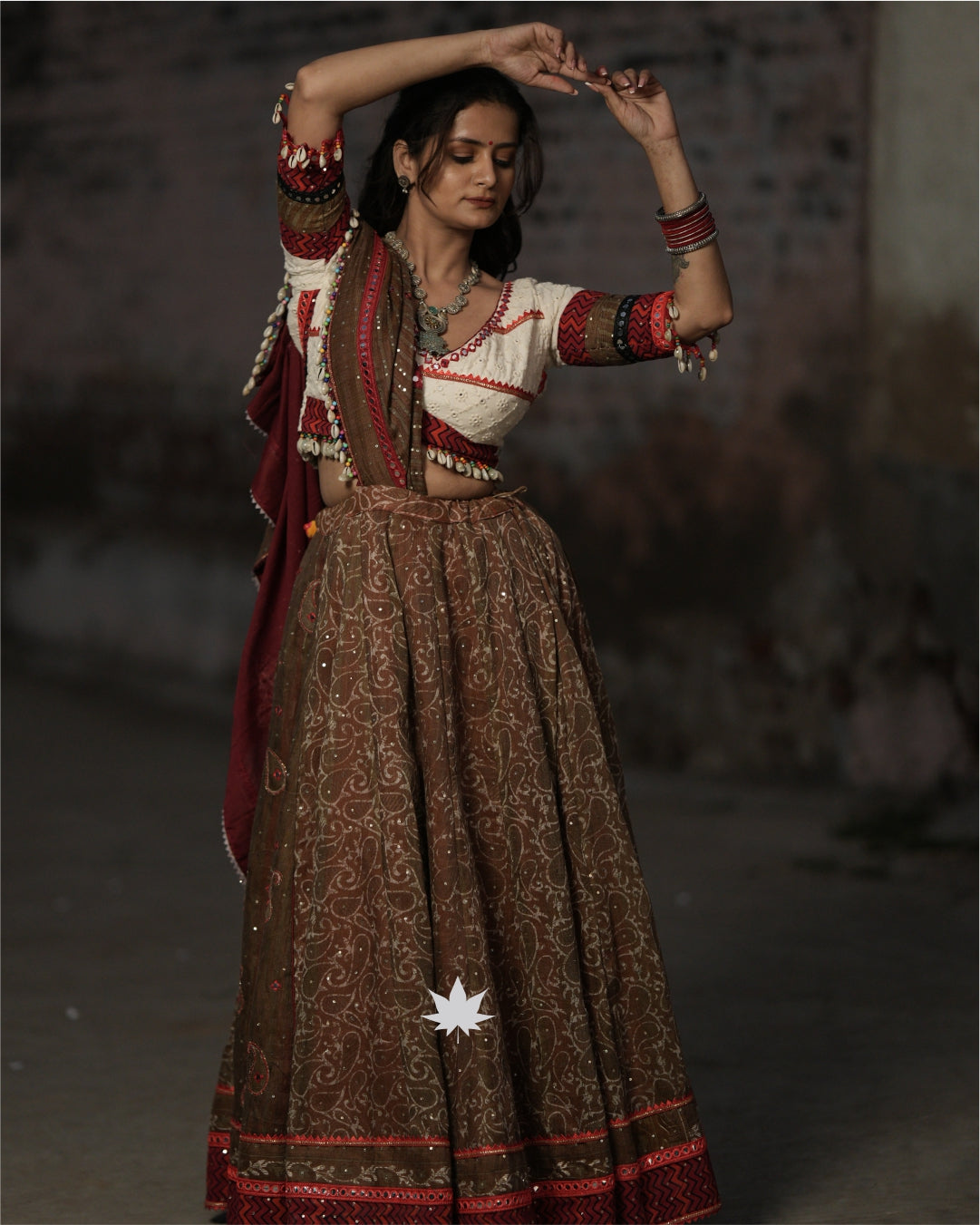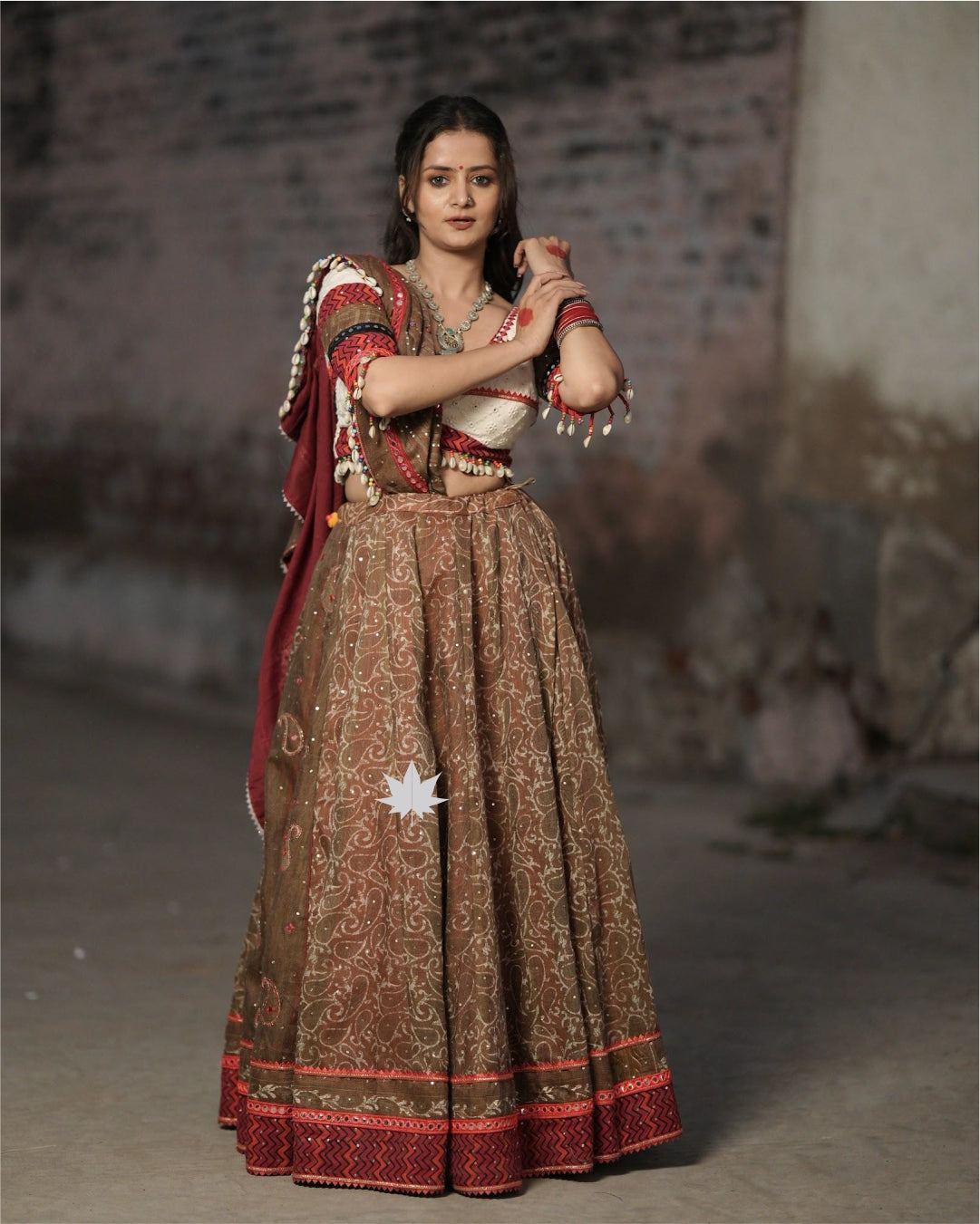 This coffee brown chaniya is crafted in breathable cotton, featuring an intricate pattern, mirror work detailing, and a contrasting red border. It is paired with a white Chikankari blouse and a matching coffee brown dupatta, both adorned with deity mirror work and a shell lace border—perfect for Navratri and cultural celebrations.₹8,900