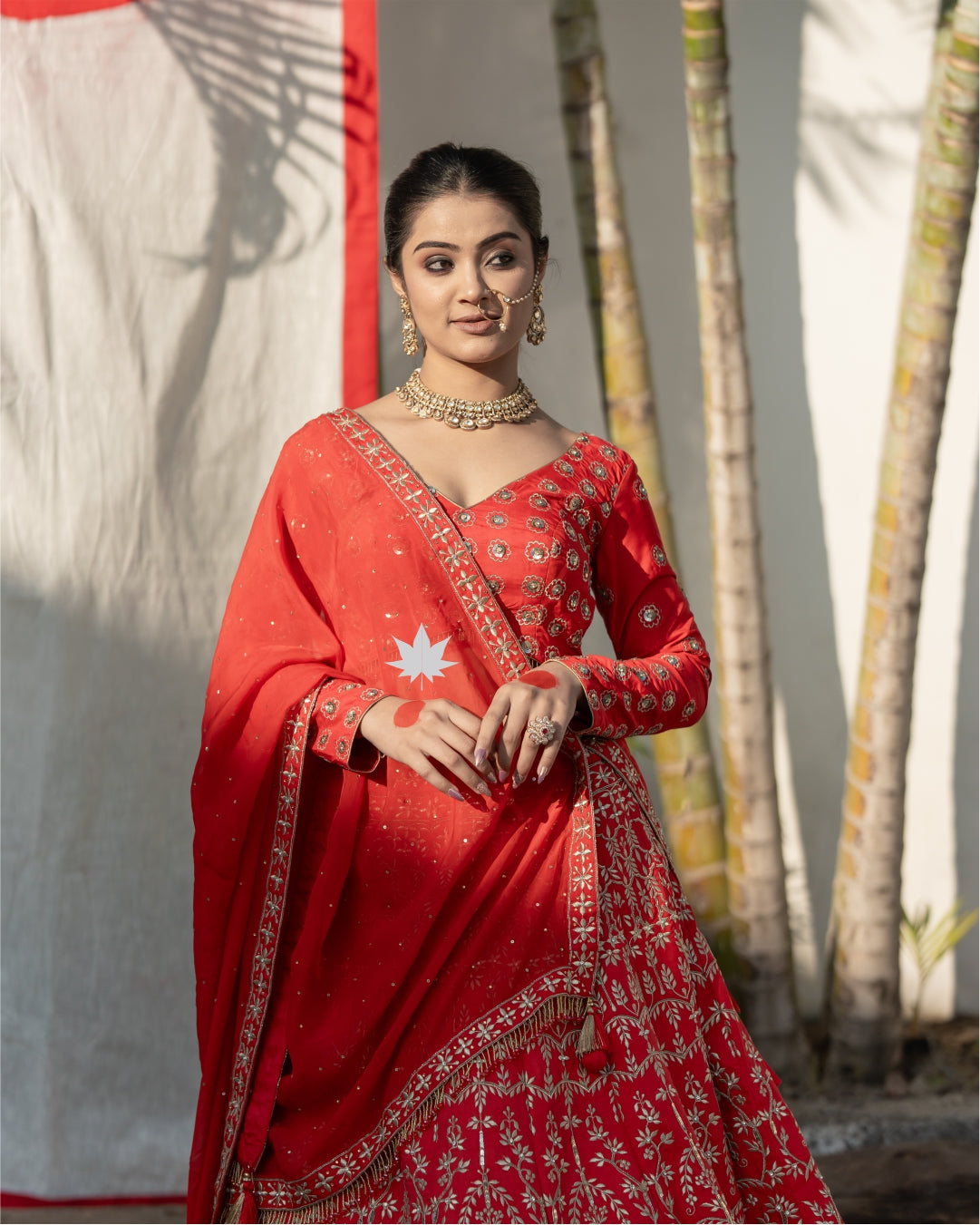 Ignite the spirit of celebration with our ‘Flame of Love’ Red Lehenga, a masterpiece of elegance and tradition. This radiant ensemble is adorned with intricate golden embroidery, symbolizing grace, grandeur, and romance. The fiery red hue, representing love and new beginnings, makes it a breathtaking choice for brides and wedding festivities.