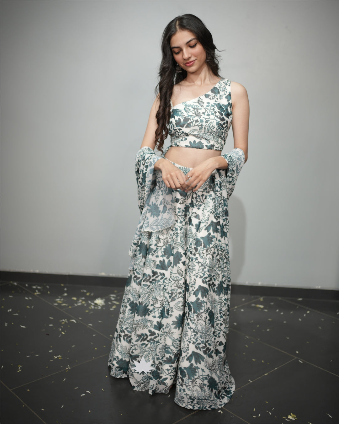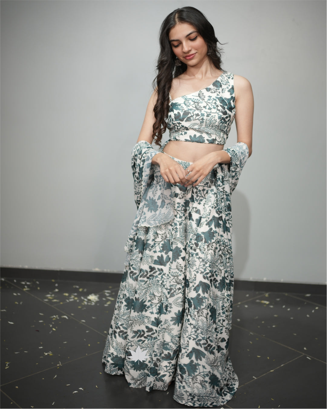 This Floral Printed Co-ord Set Has An Assyemteric Blouse With Spaghetti Staps On One Side Paired With Plazzo Pants And A Dupatta