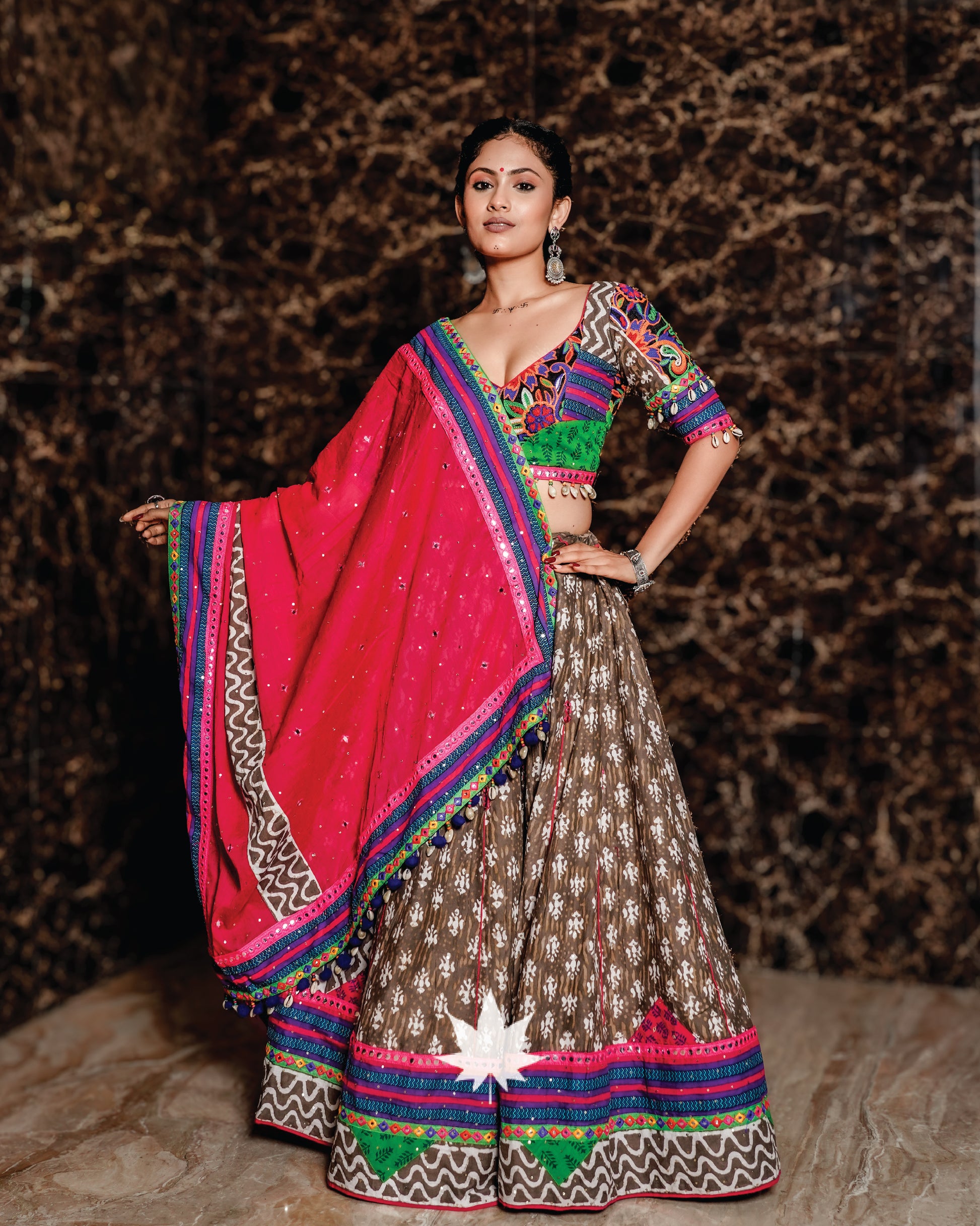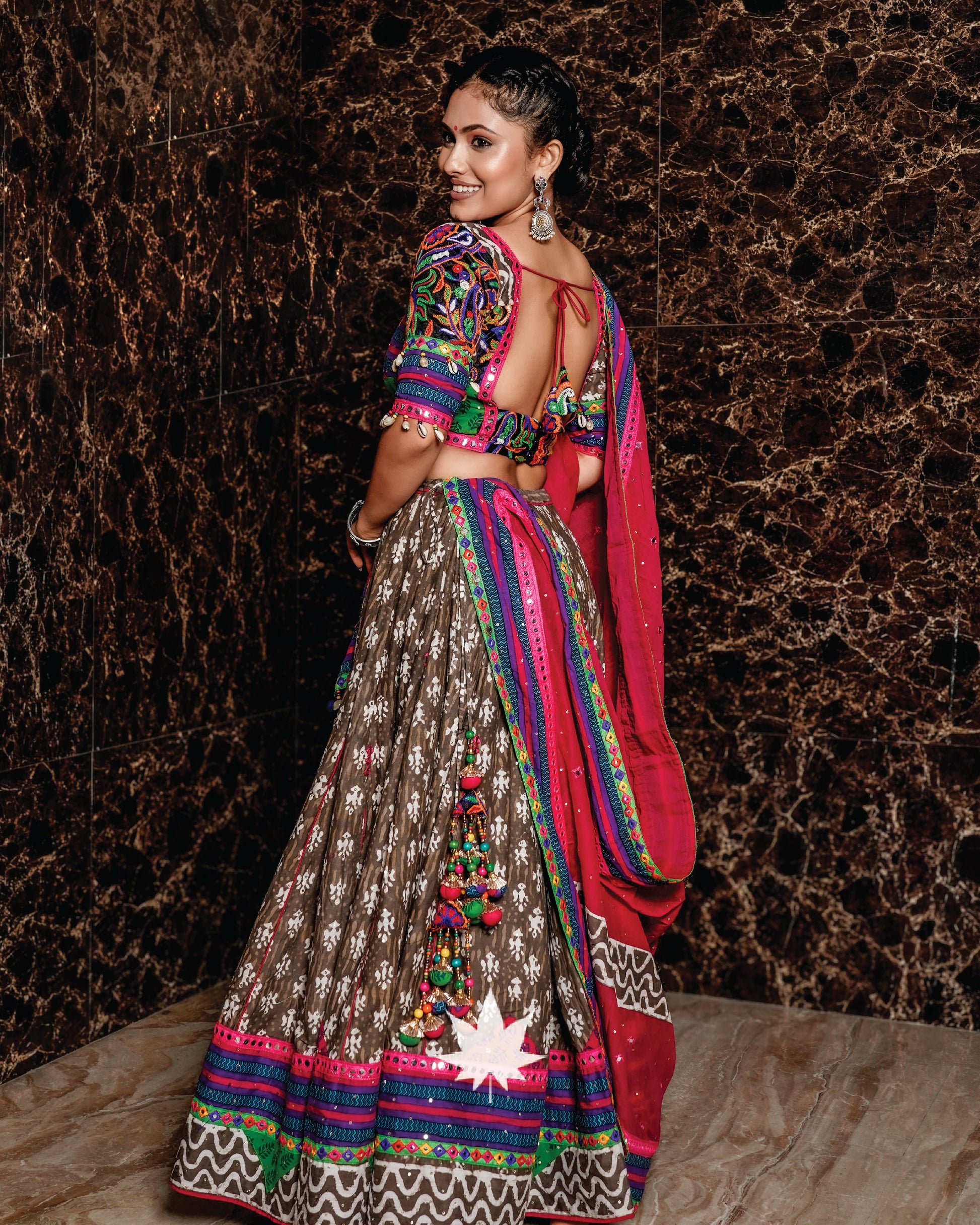 Gamthi Multicolor Chaniya With Heavy Border And Patchwork Gamthi Blouse Draped With Pink Mirrorwork Dupatta