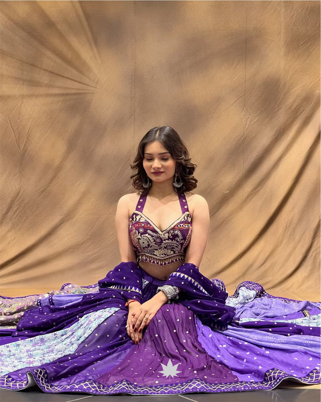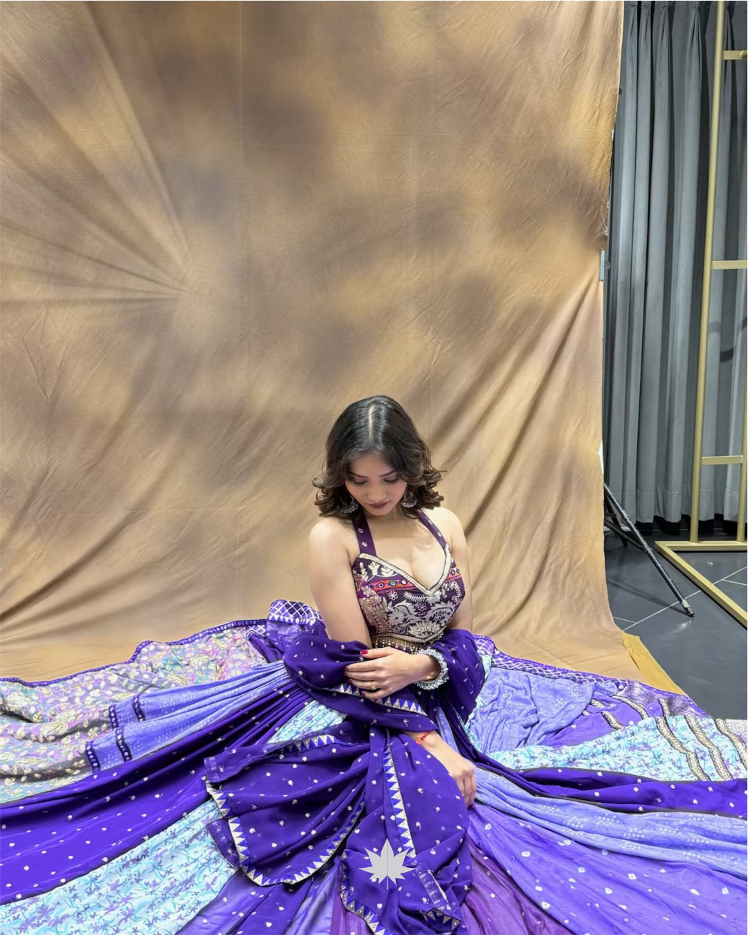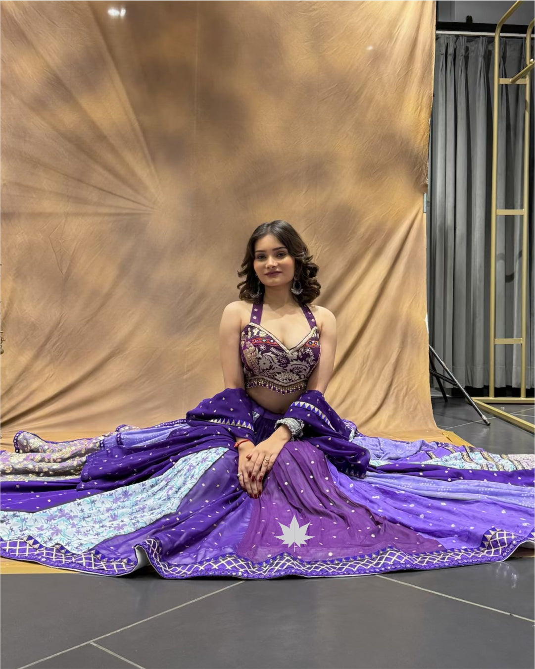 Drape yourself in regal elegance with our Amethyst Glow Georgette Ghagra Choli. Crafted in rich purple georgette, this ensemble brings a luxurious flow and graceful fall, perfect for festive nights and wedding celebrations. The lightweight fabric ensures comfort while the royal shade of purple adds sophistication and charm. Designed to make you stand out, this ghagra choli is a statement piece for every special occasion.