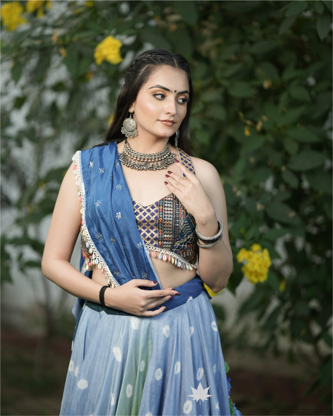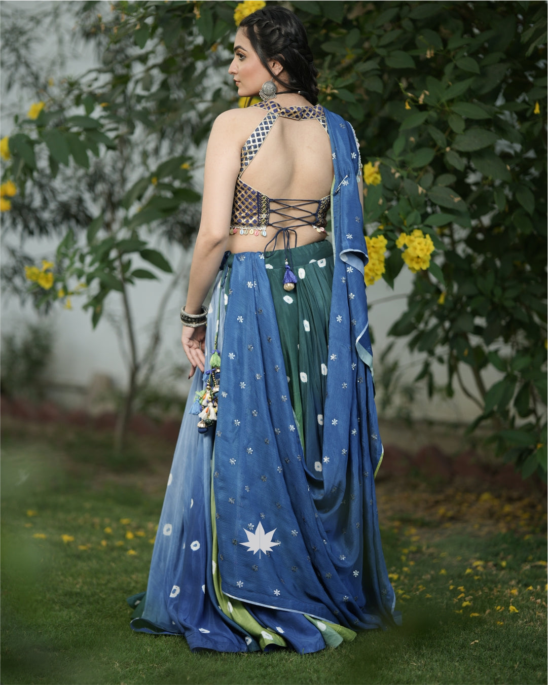 This blue and green ombré Bandhani lehenga choli is crafted in soft silk and paired with a vibrant patchwork blouse. It comes with a matching blue dupatta, both featuring a delicate shell lace border—a perfect choice for navratri, festive occasions and any cultural celebrations.