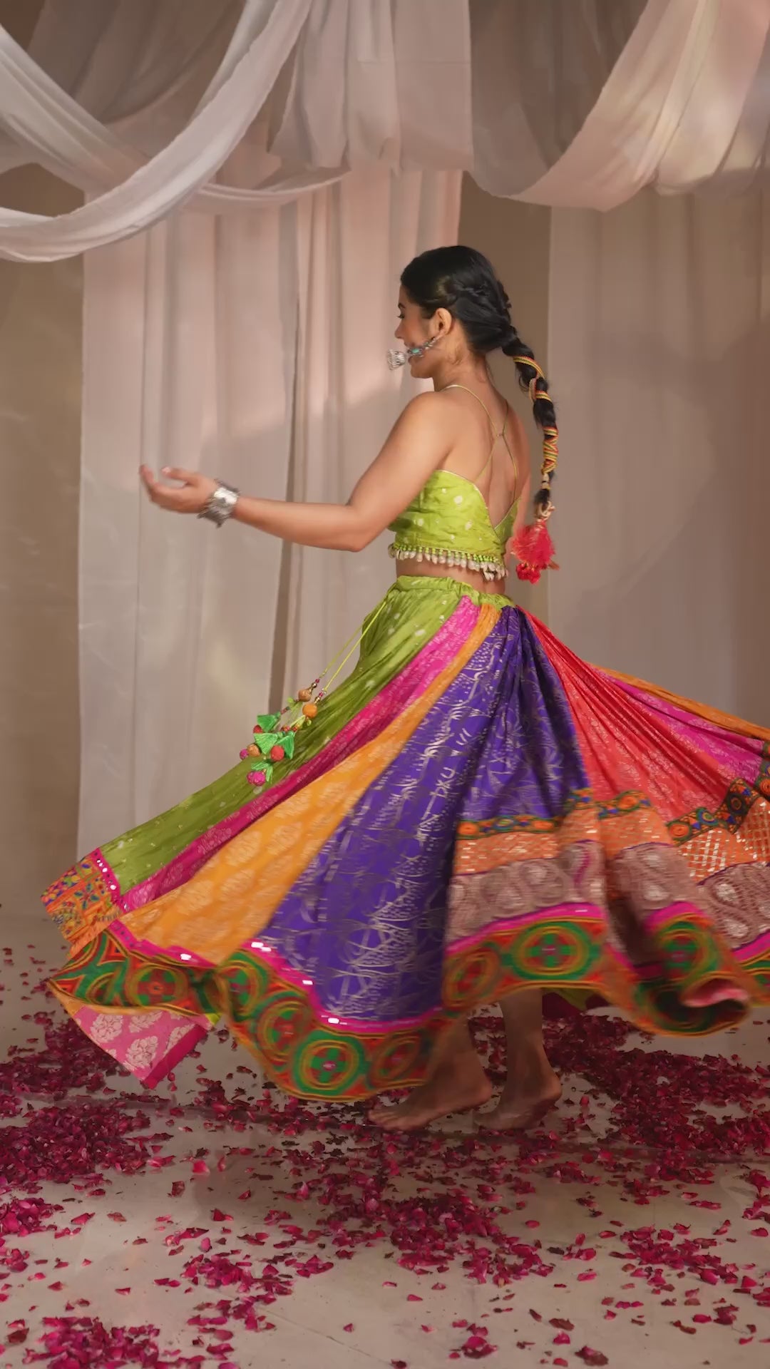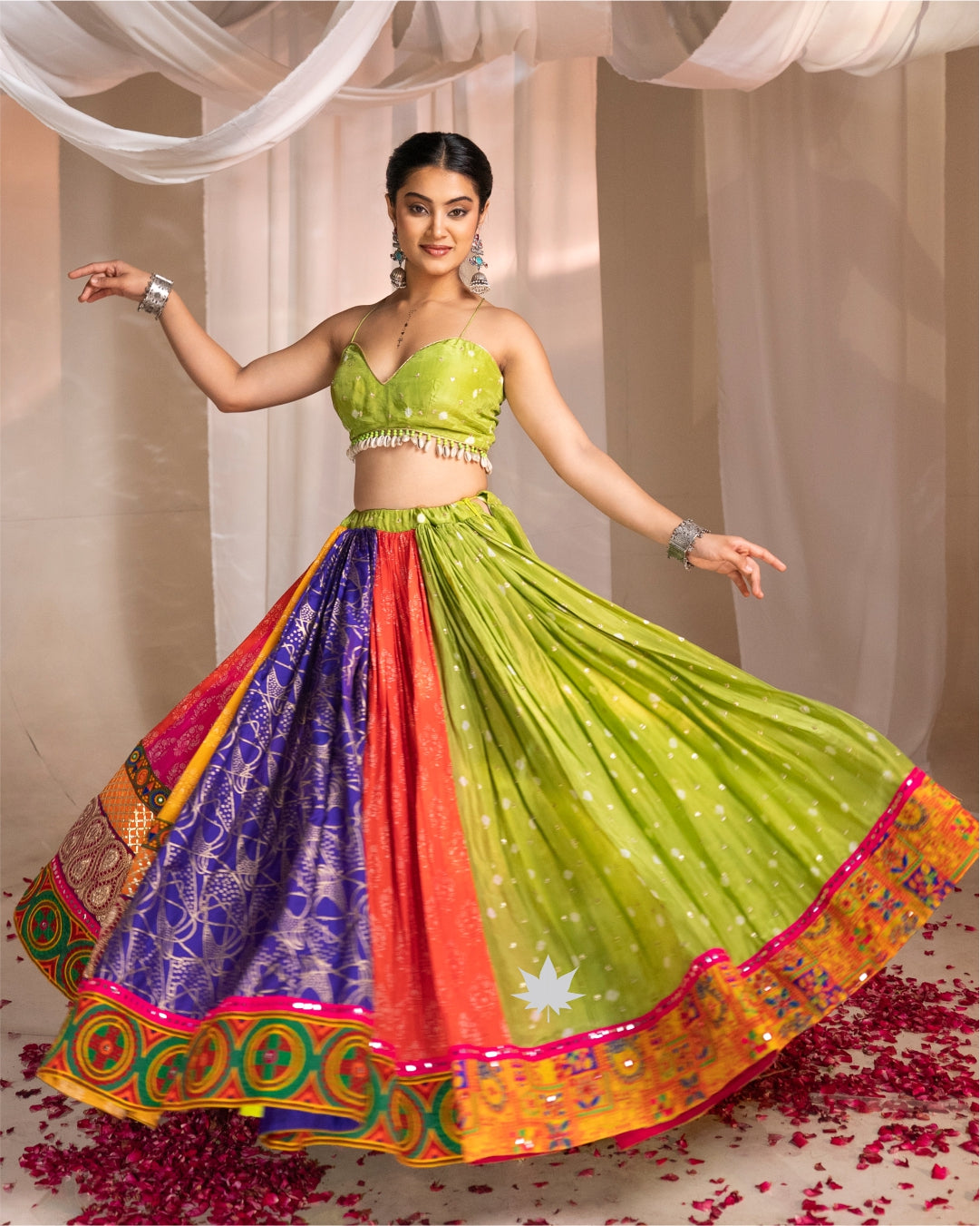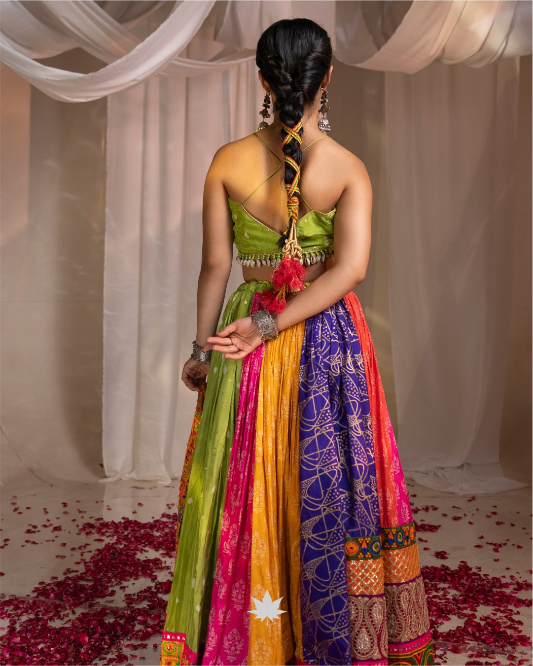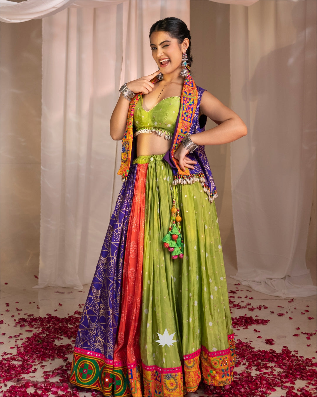 This vibrant chaniya choli is a celebration of traditional craft and festive spirit. The lehenga features a striking mix of red and orange bandhani-inspired patterns, beautifully contrasted with an Ajrakh-style printed border highlighted with mirror work. The blouse is designed with a modern cut yet rooted in tradition, finished with delicate shell tassels. Adding versatility and elegance, the set comes with a matching printed jacket that can be styled for different Navratri looks.
