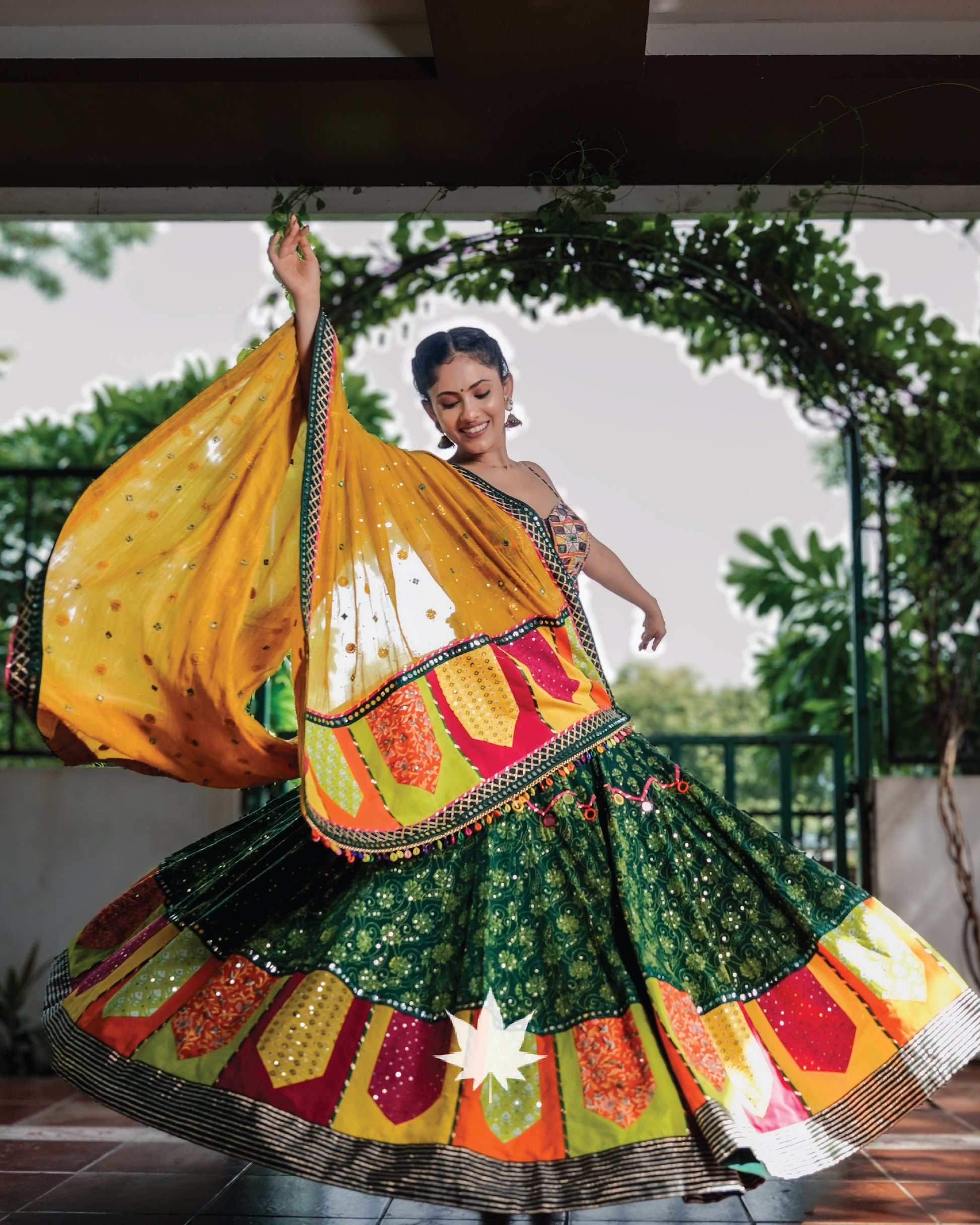 Multicolor Patchwork Green Chaniya With Real Gamthi Blouse Han Been Paired With Yellow Patchwork Mirror Work Dupatta