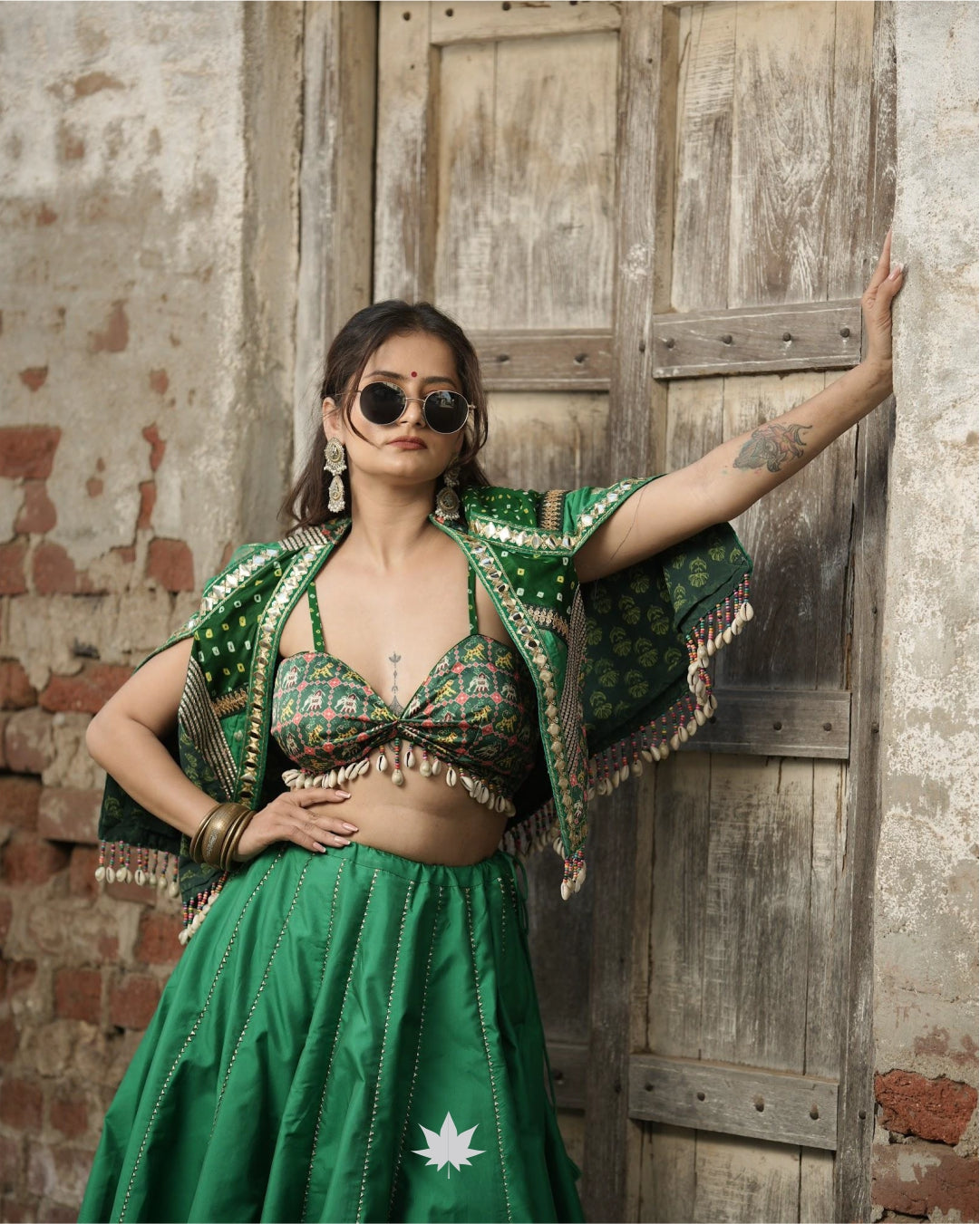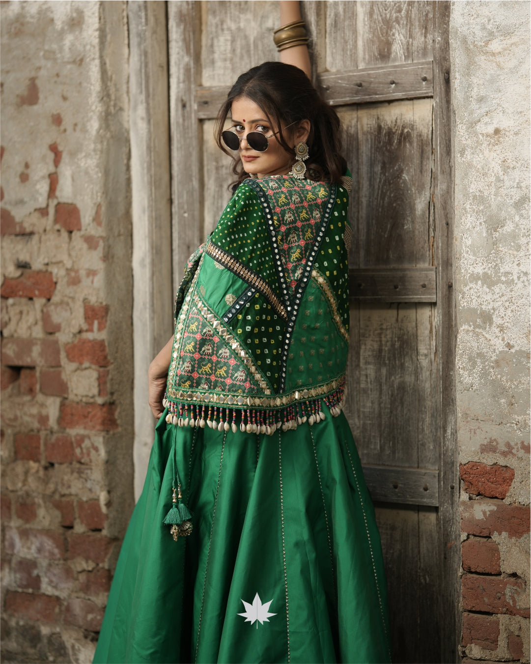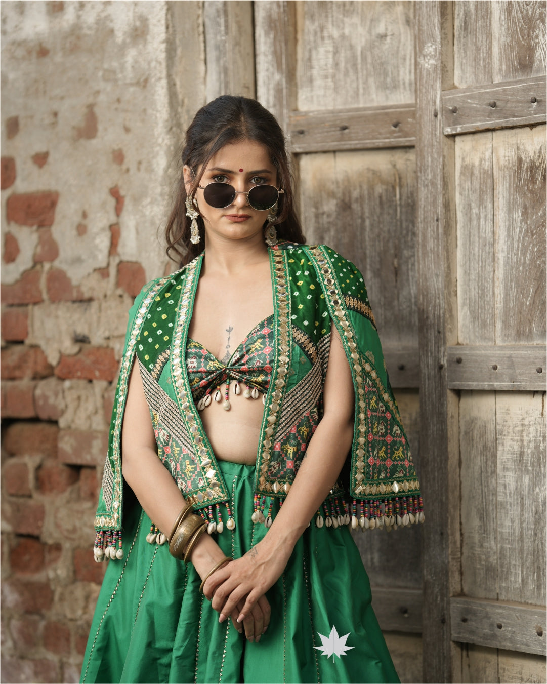 This vibrant chaniya choli set features a green raw silk lehenga detailed with delicate mirror lines and a gotta patti border. It is paired with a patola print blouse adorned with mirrorwork and shell tassels. Completing the look is a unique cape-style jacket with bandhej and patola print, mirror accents, and a shell border. A bold fusion look perfect for Navratri nights, festive events, and modern traditional celebrations.