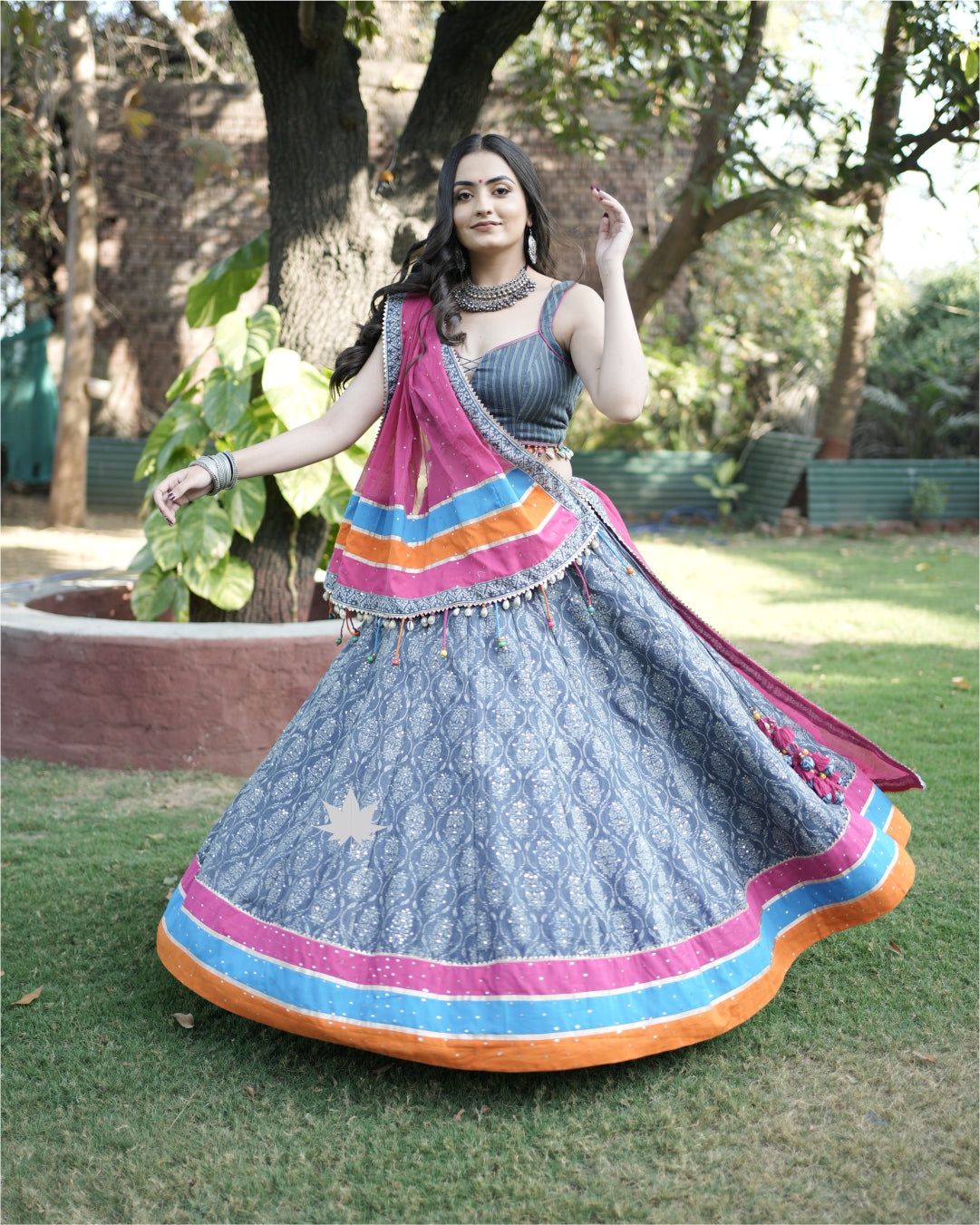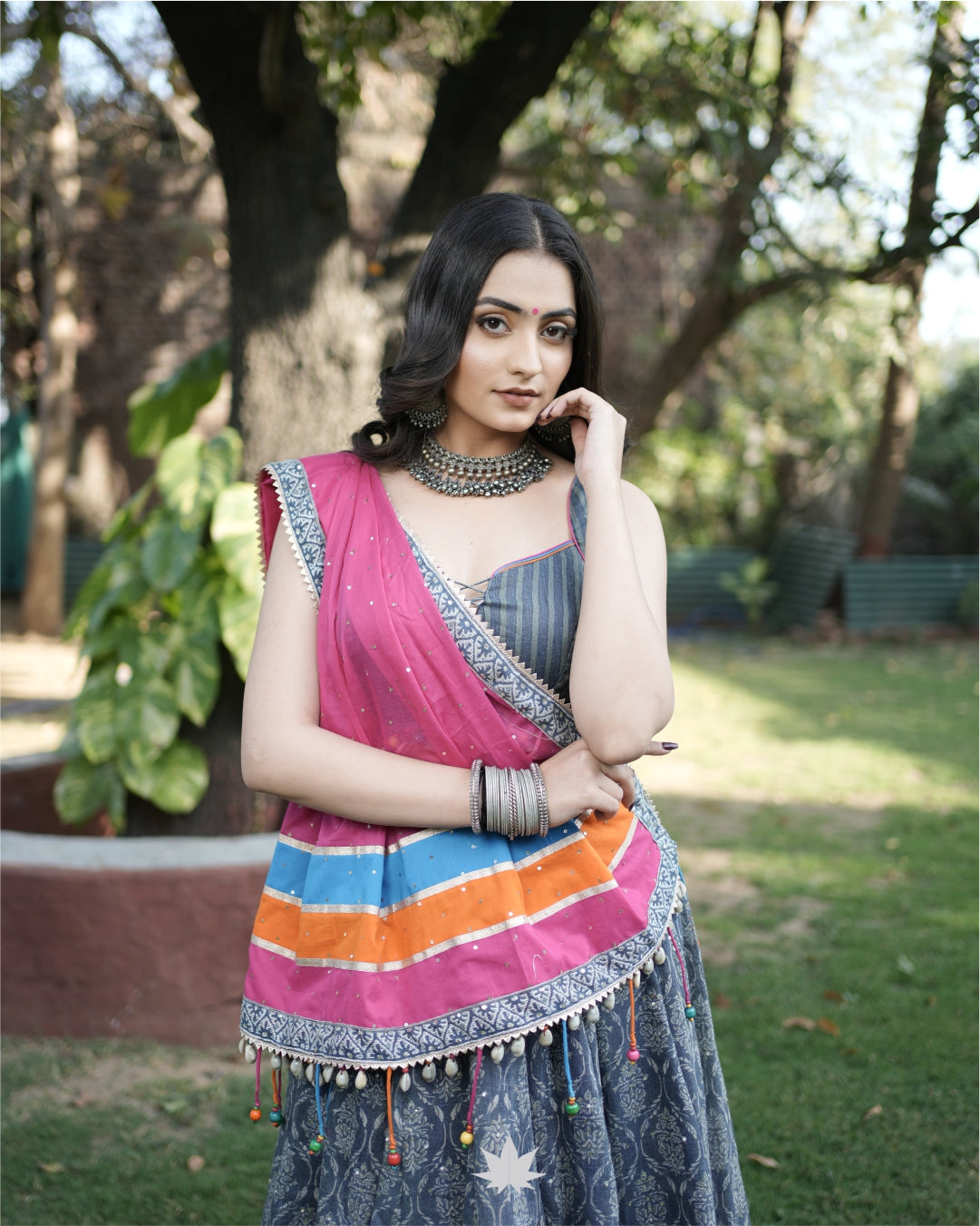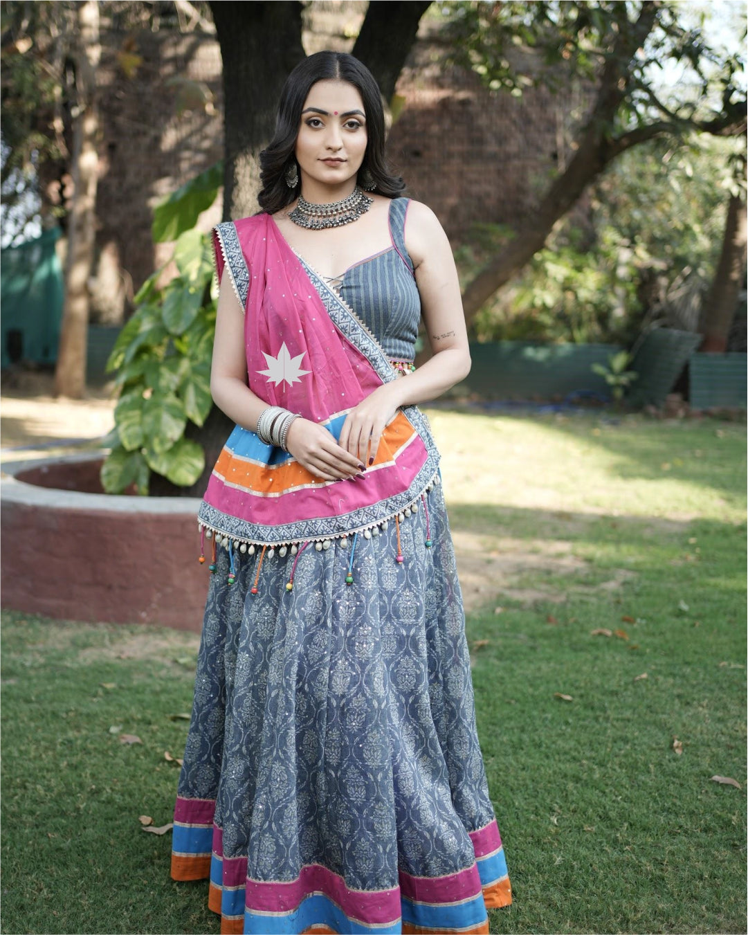 This chaniya choli set features a grey Ajrakh-inspired flared skirt accented with a vibrant border in pink, blue, and orange. The pinstripe blouse adds a contemporary touch with its clean silhouette and structured neckline. Paired with a pink dupatta embellished with mirror work and cowrie shell lace, this set is perfect for Navratri, festive brunches, and cultural celebrations.