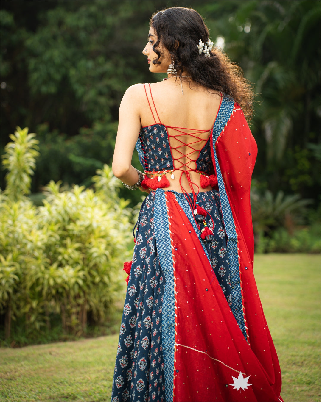 Make everytwirl unforgettable in this stunning Indigo Chaniya Choli featuring bold red accents and traditional Ajrakh-inspired patterns. The contrast red dupatta with pom-pom detailing adds a vibrant pop, while the deep blue flare lehenga offers timeless charm.Ideal for Navratri nights, cultural event, or wedding festivities-this set is a true blend of power and poise