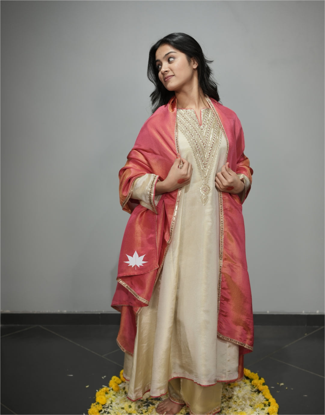 This Rich Ivoryu Kurta Has A Delicately Handworked Neckline Paired With A Mathing Pants And A Contrasting Peach Dupatta