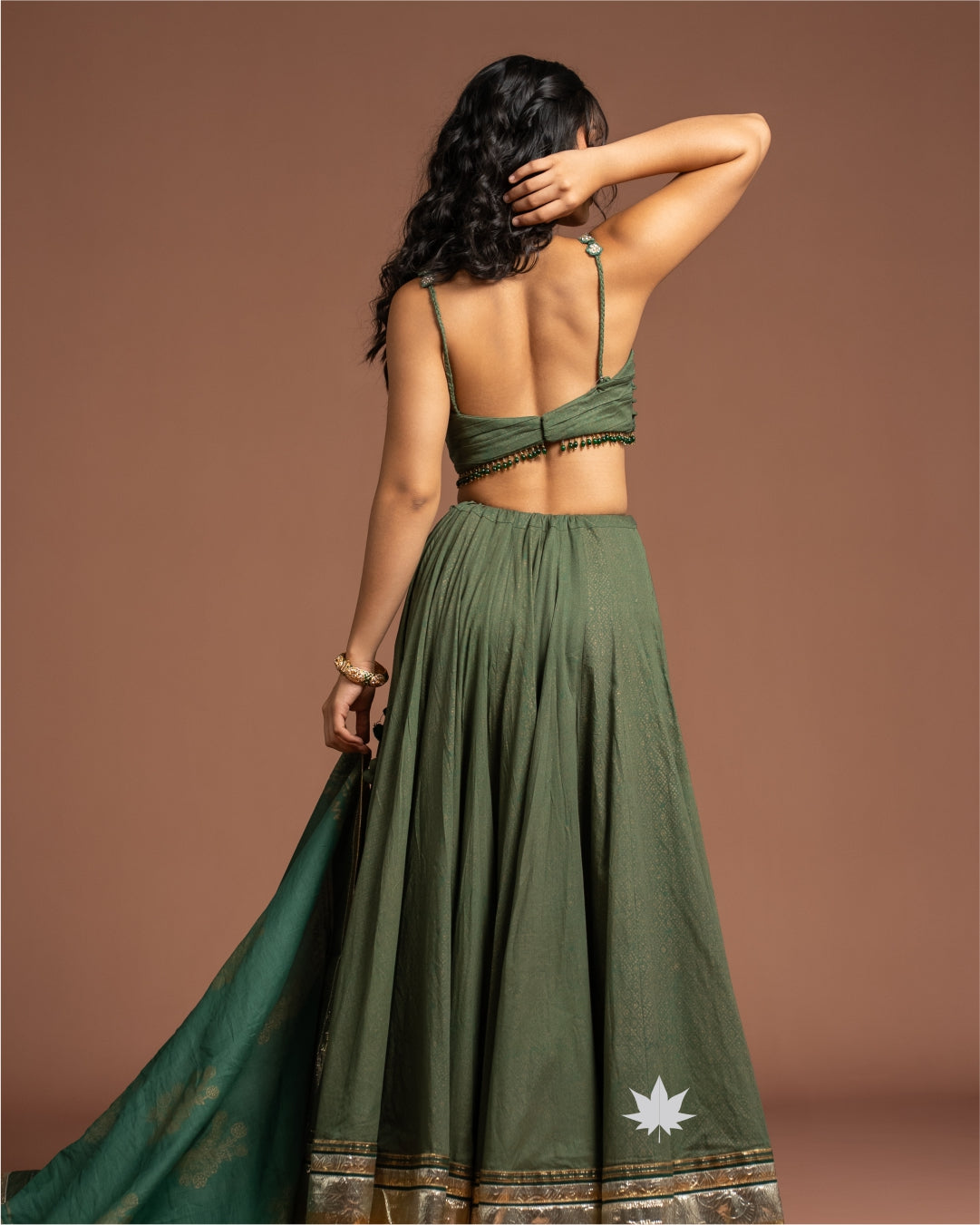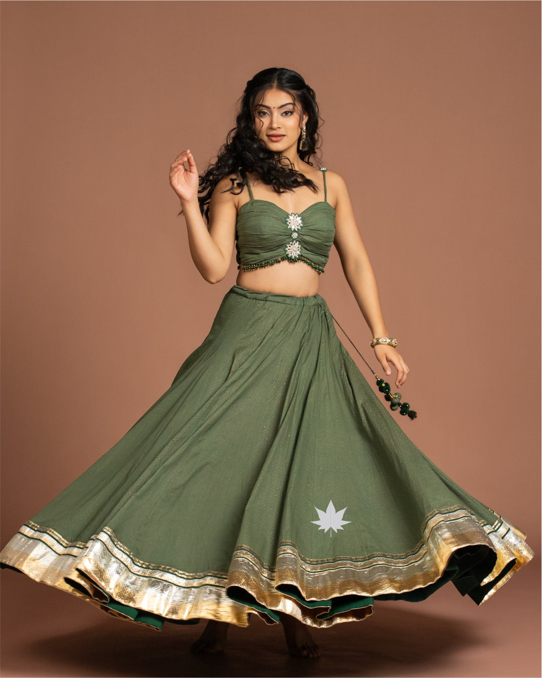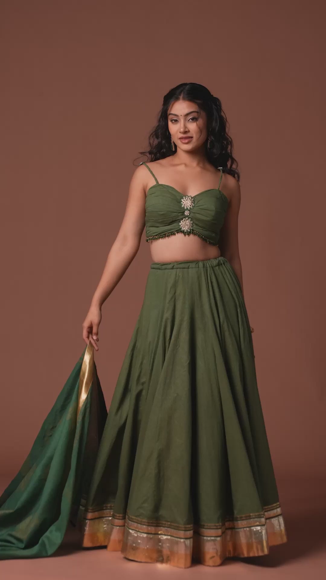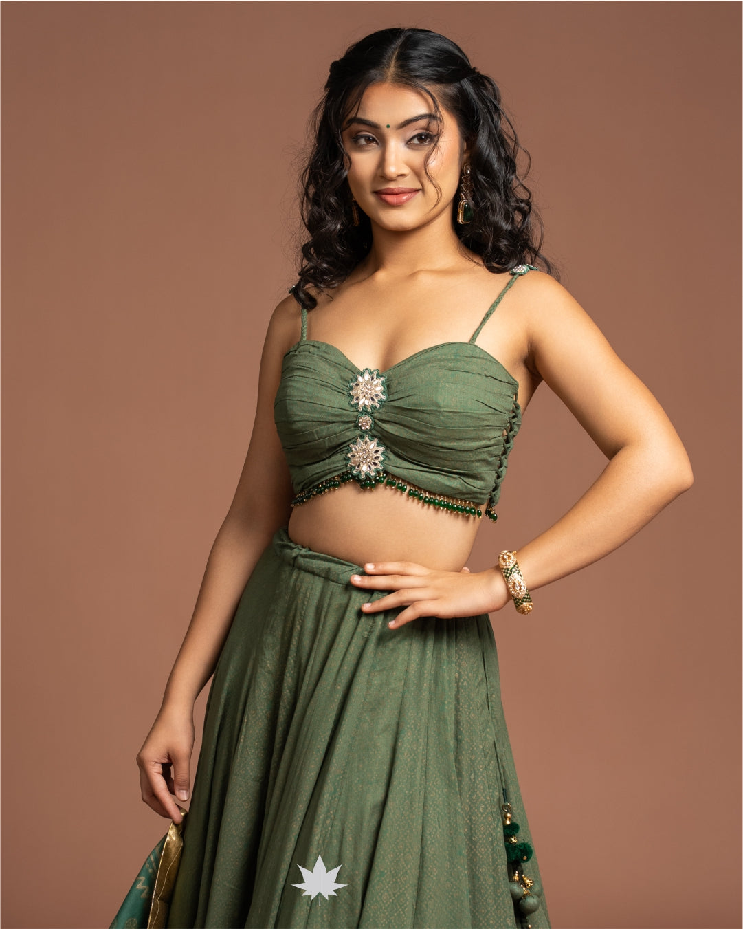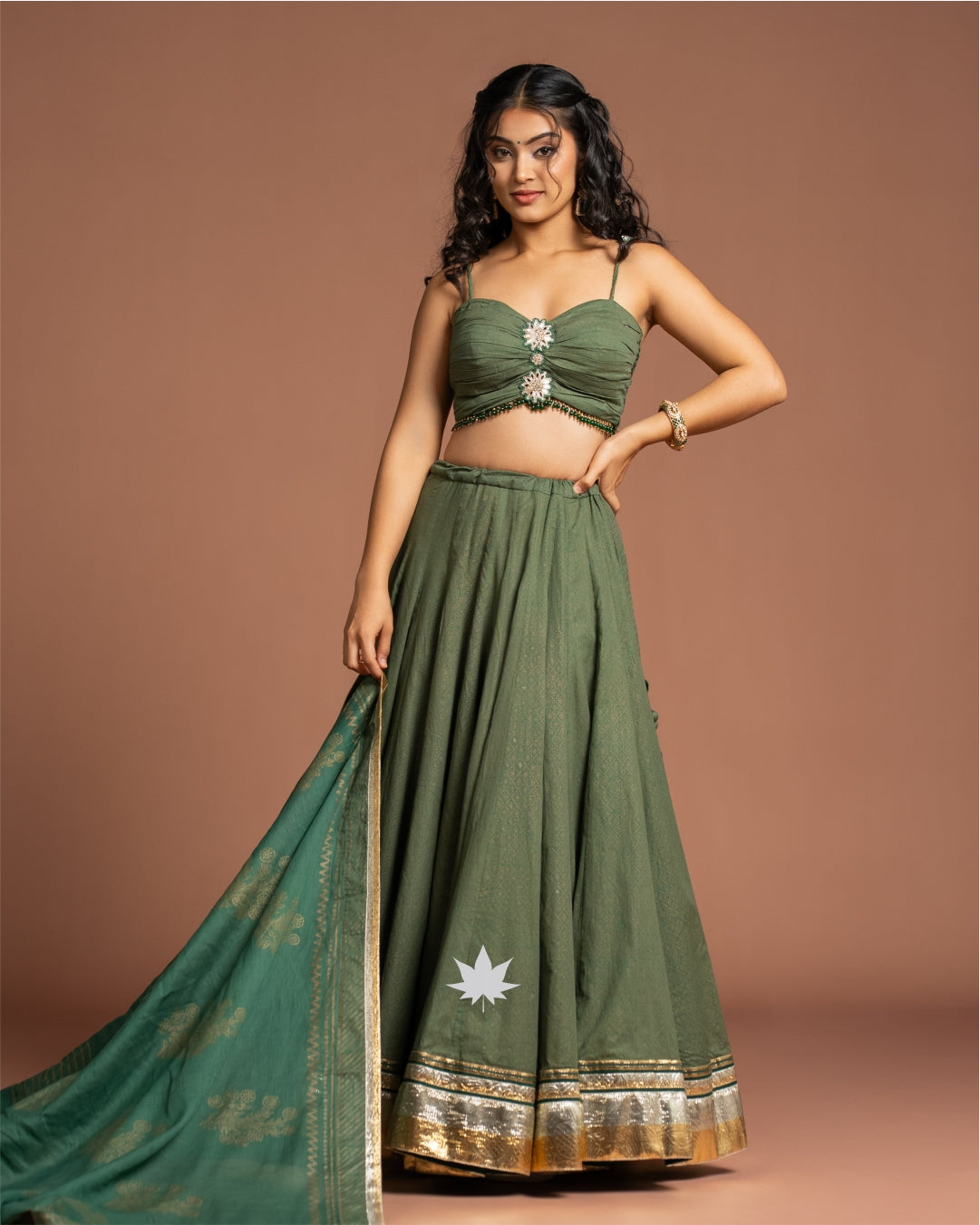 The Vulcal Kavya Green Chaniya Choli is a timeless festive ensemble that radiates understated elegance. Crafted in a rich green hue, the lehenga features a flared silhouette finished with golden zari borders for a regal touch. The strappy blouse is beautifully detailed with ruched styling and floral embellishments at the center, adding a delicate yet striking charm. A coordinated dupatta with woven golden motifs completes the look, making it perfect for traditional occasions.