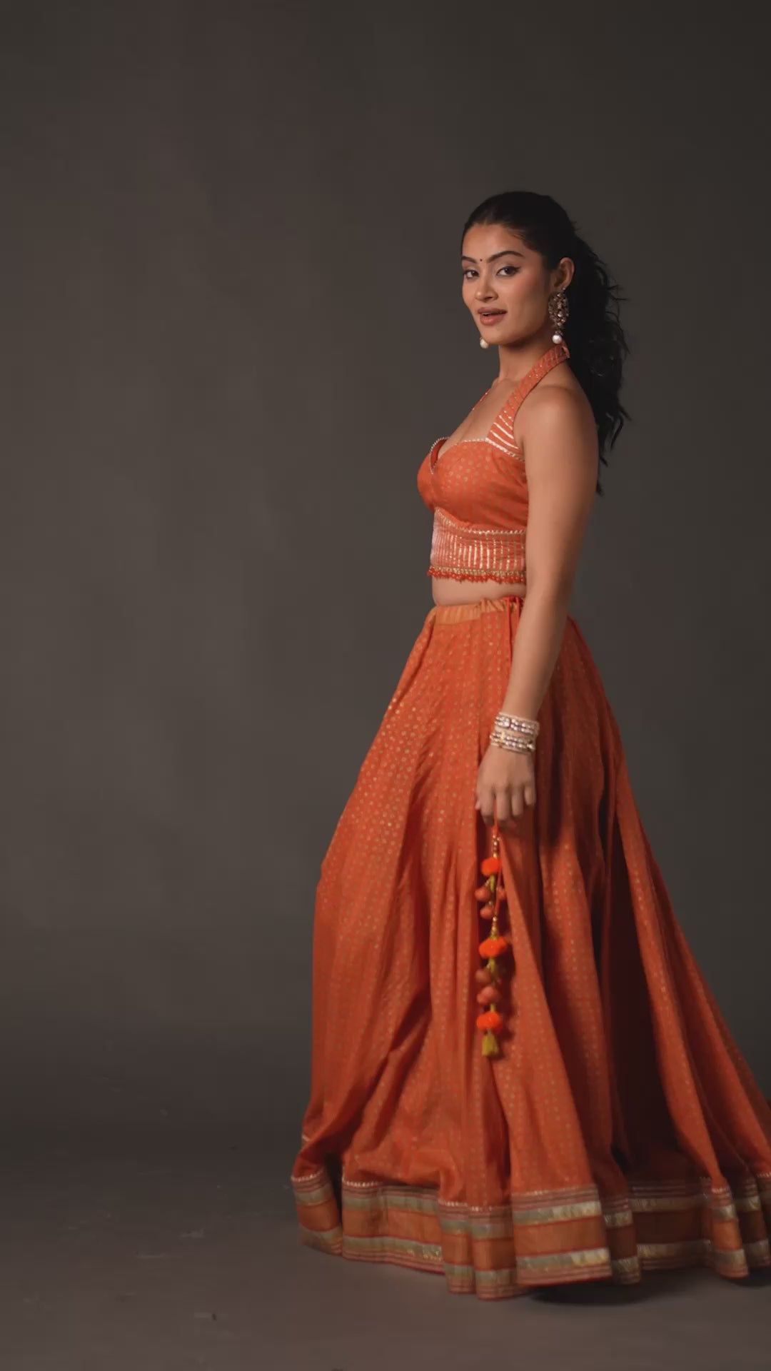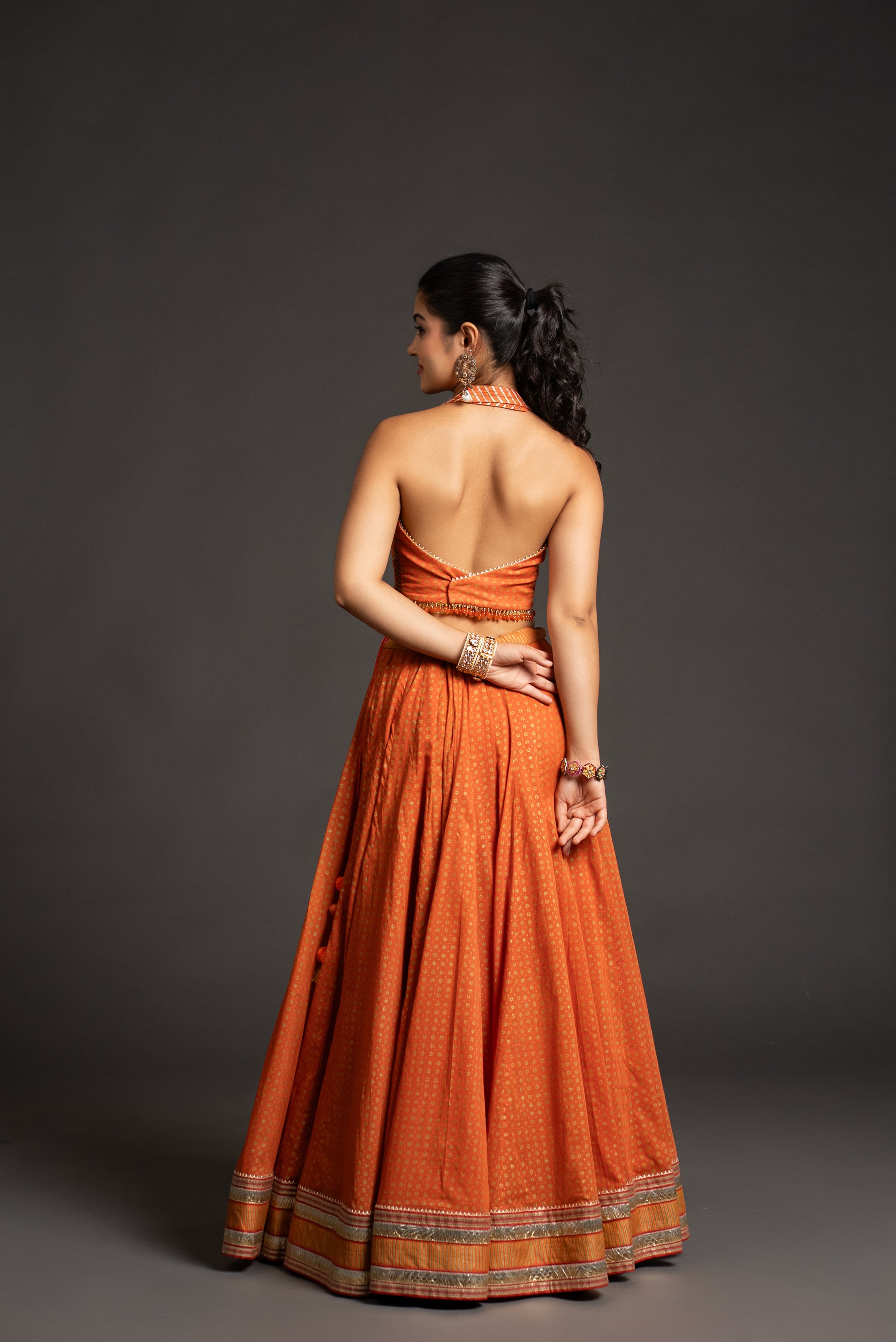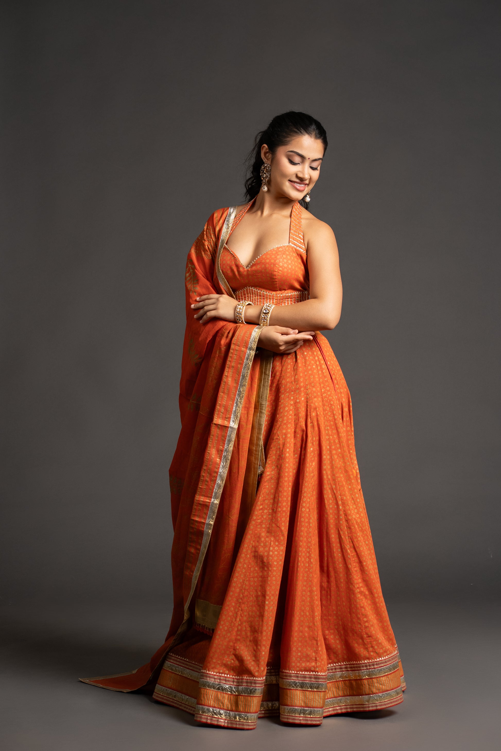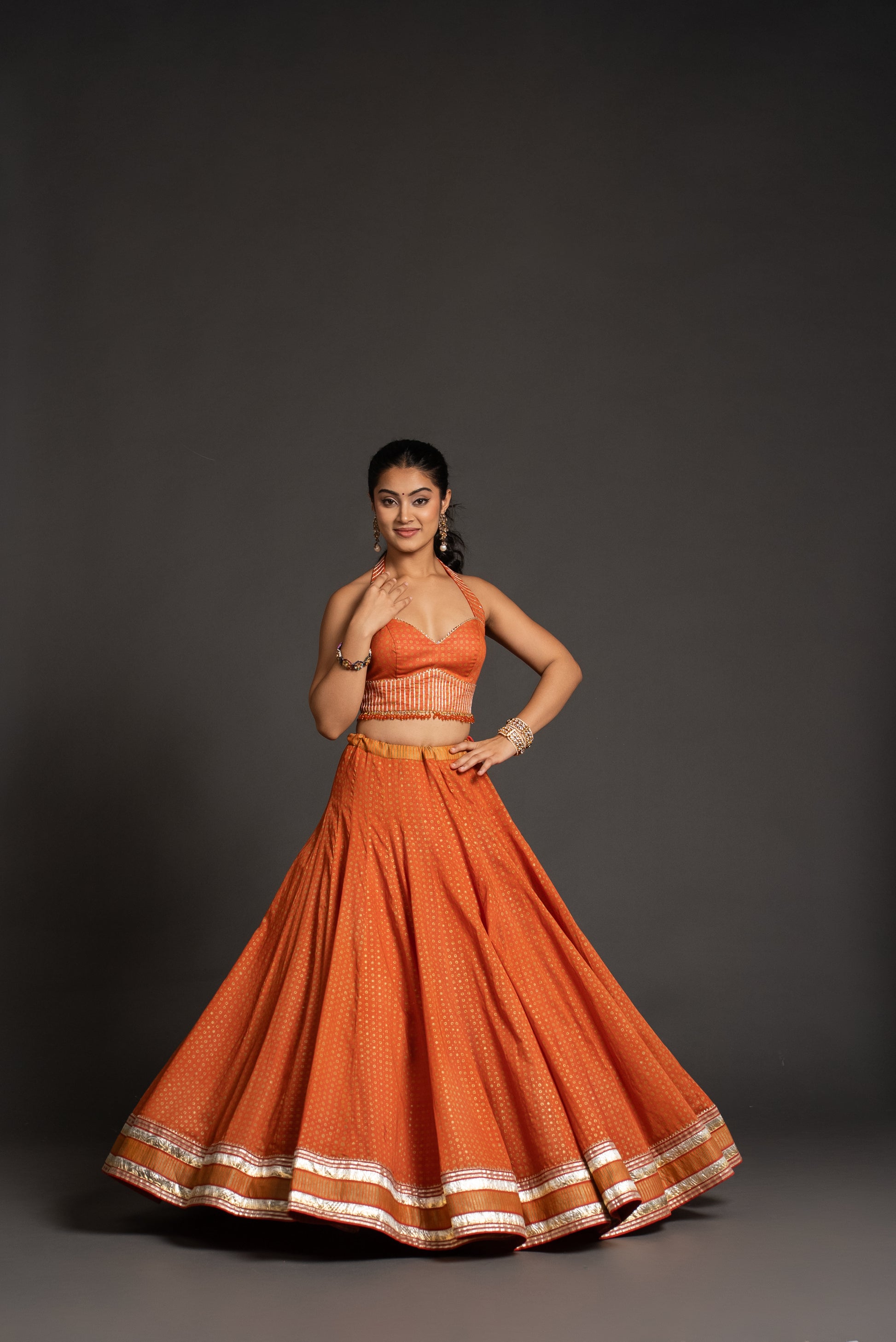 • Striking orange chaniya with golden border details