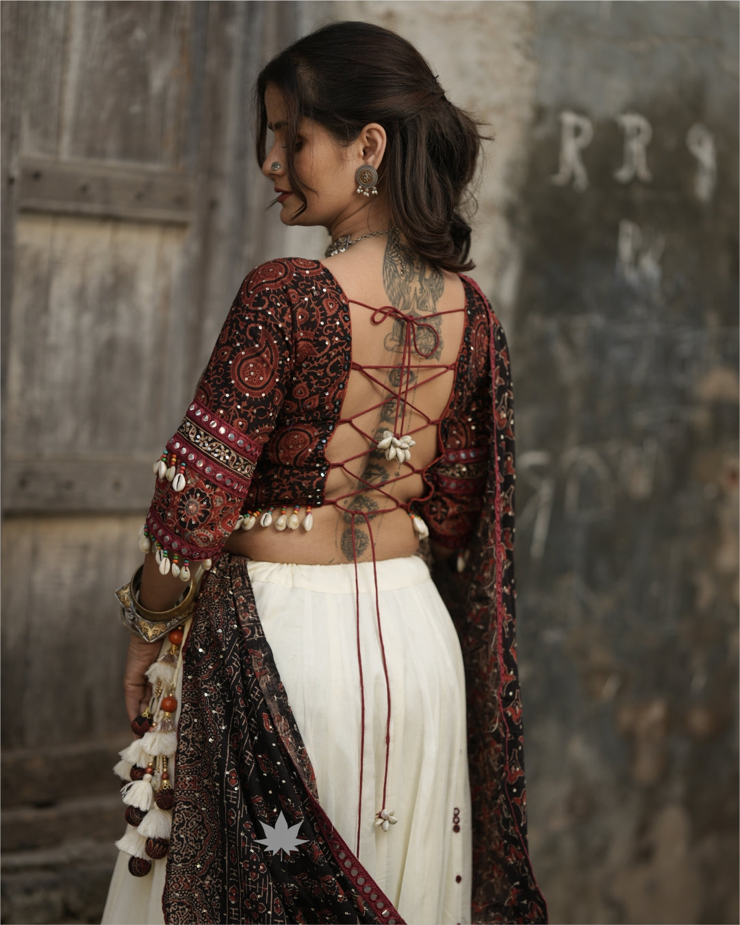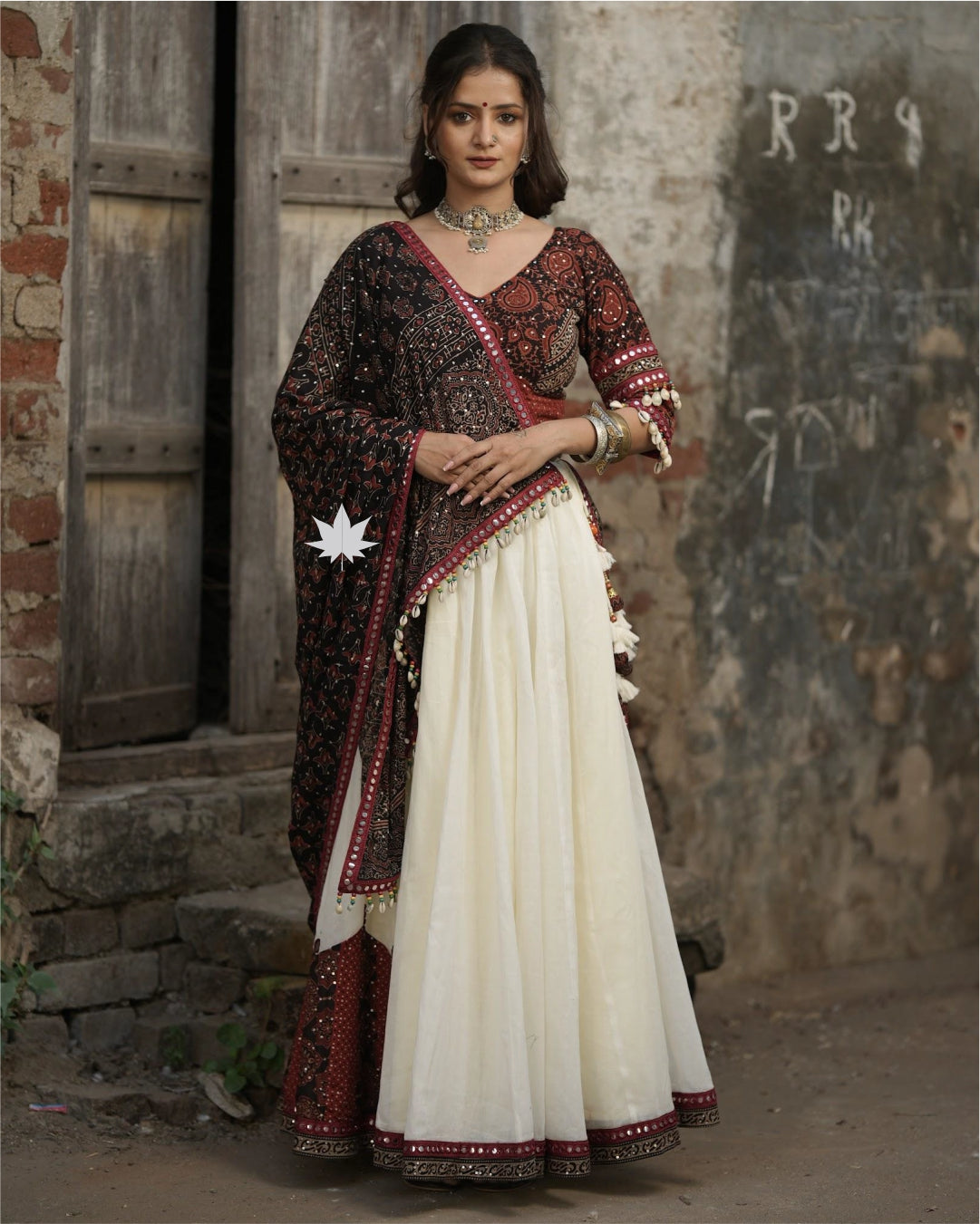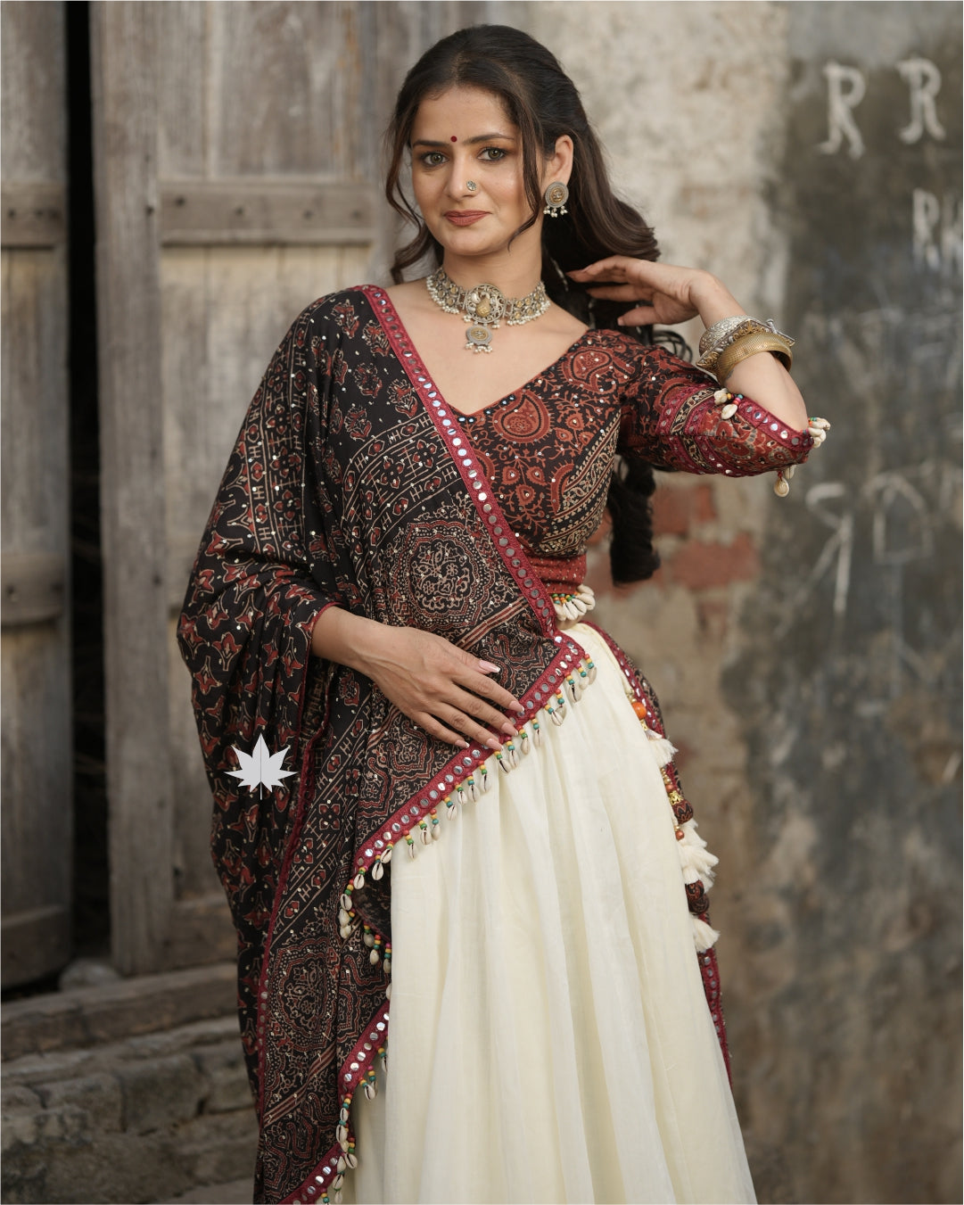 This white cotton chaniya features maroon and black patchwork along with a mirror work lace border. It is paired with a maroon and black Ajrakh print blouse featuring mirror work and shell detailing. The matching Ajrakh print dupatta is also adorned with mirror work and shell accents—making it a perfect pick for Navratri and festive celebrations.