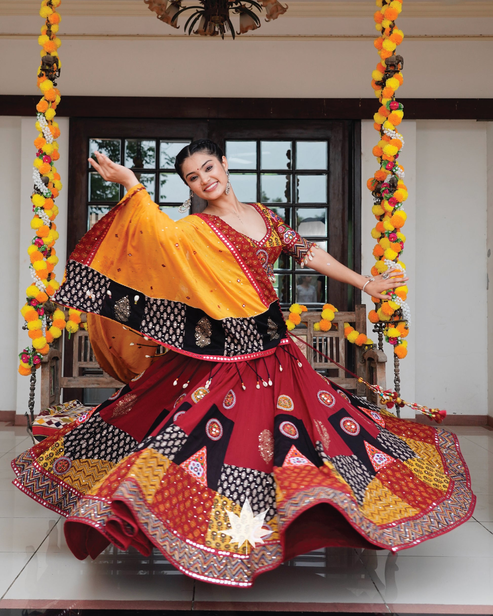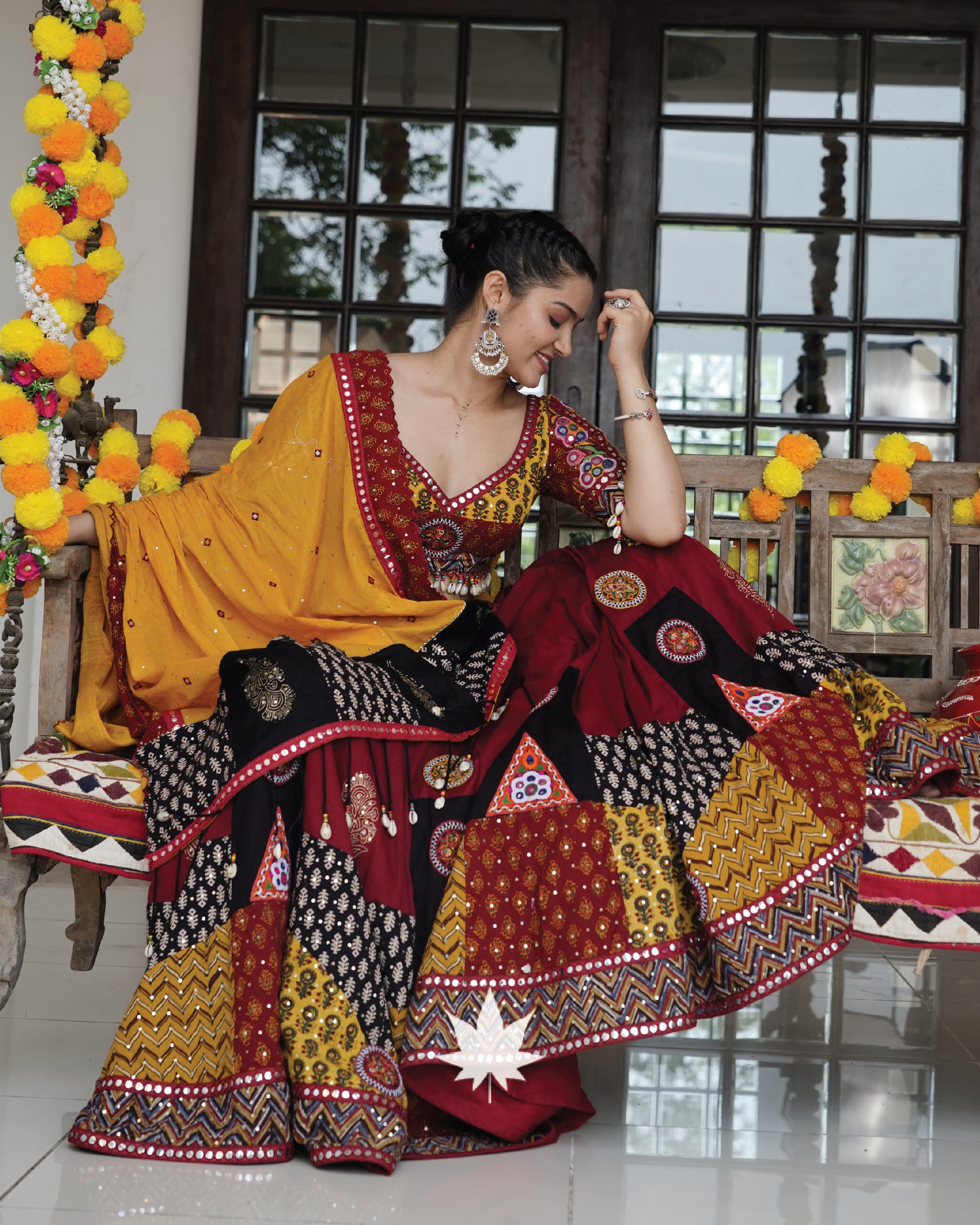 Maroon Patchwork Gamthi Chaniya Paired With Yellow Patchwork And Mirror Work Dupatta And Patchwork Gamthi Blouse