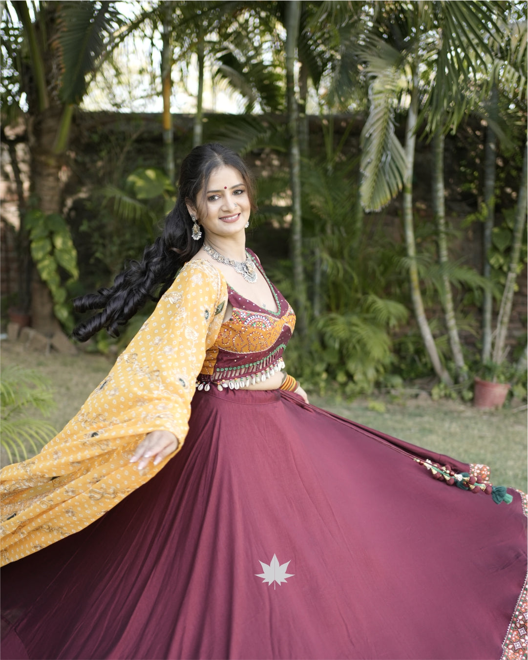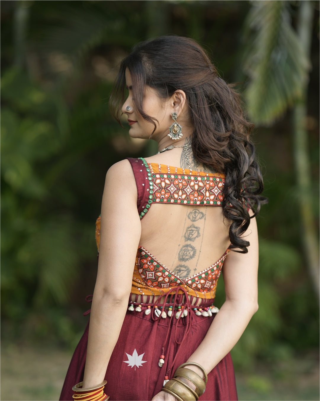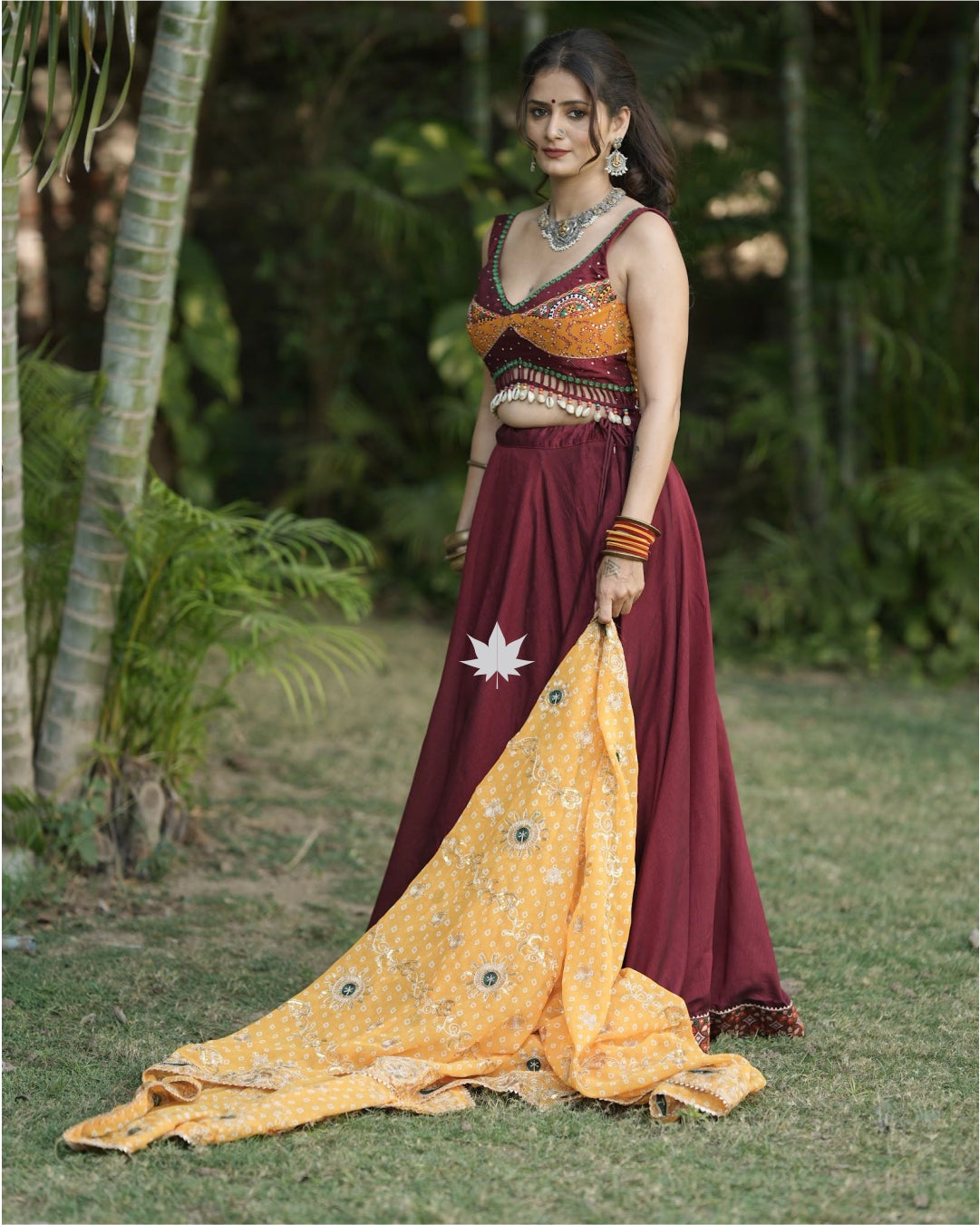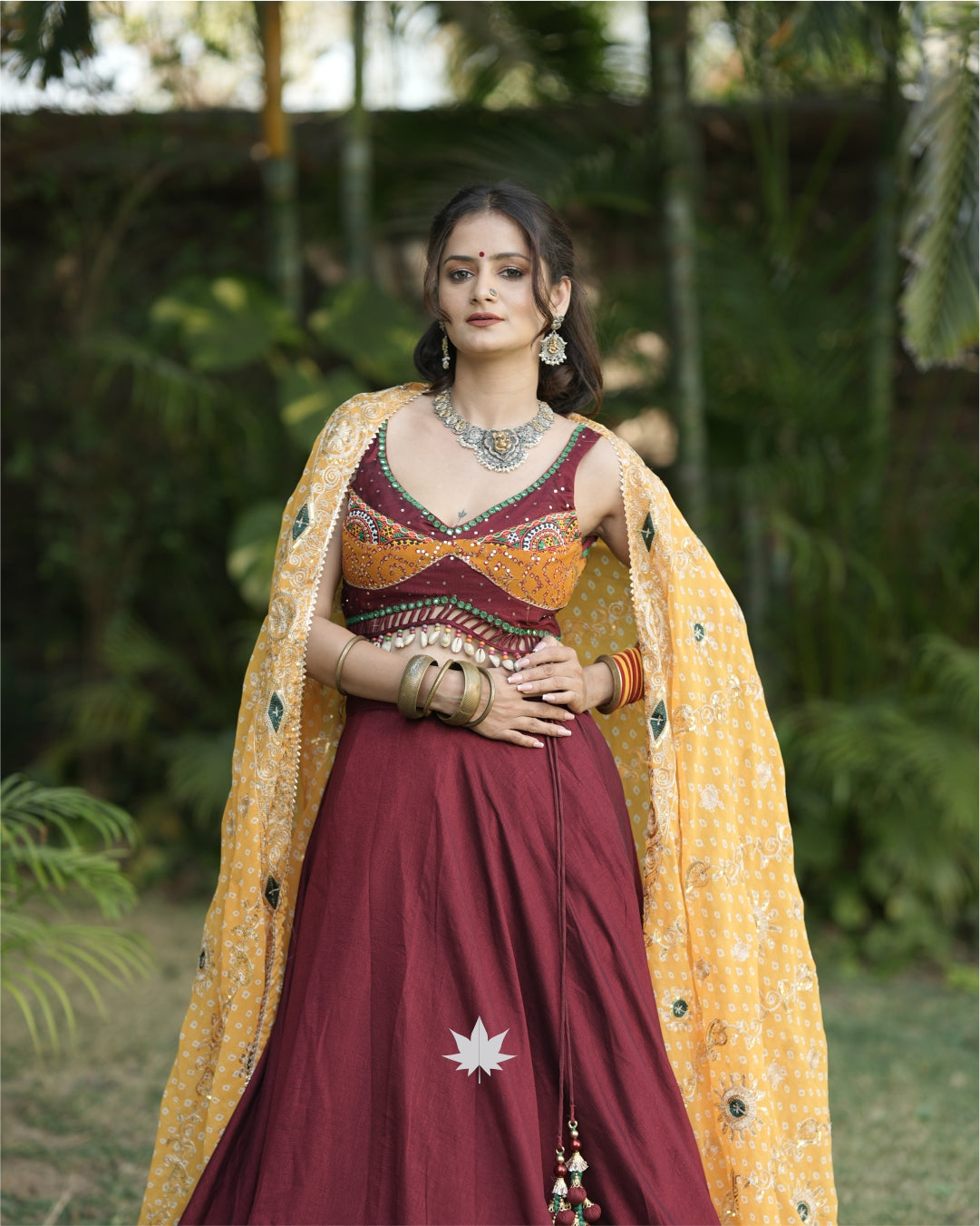 This maroon cotton chaniya choli is paired with a vibrant yellow Bandhani dupatta and a maroon blouse featuring Bandhani patchwork, subtle mirror work, and a flattering cut. A perfect outfit for Navratri, Garba nights, and festive occasions.