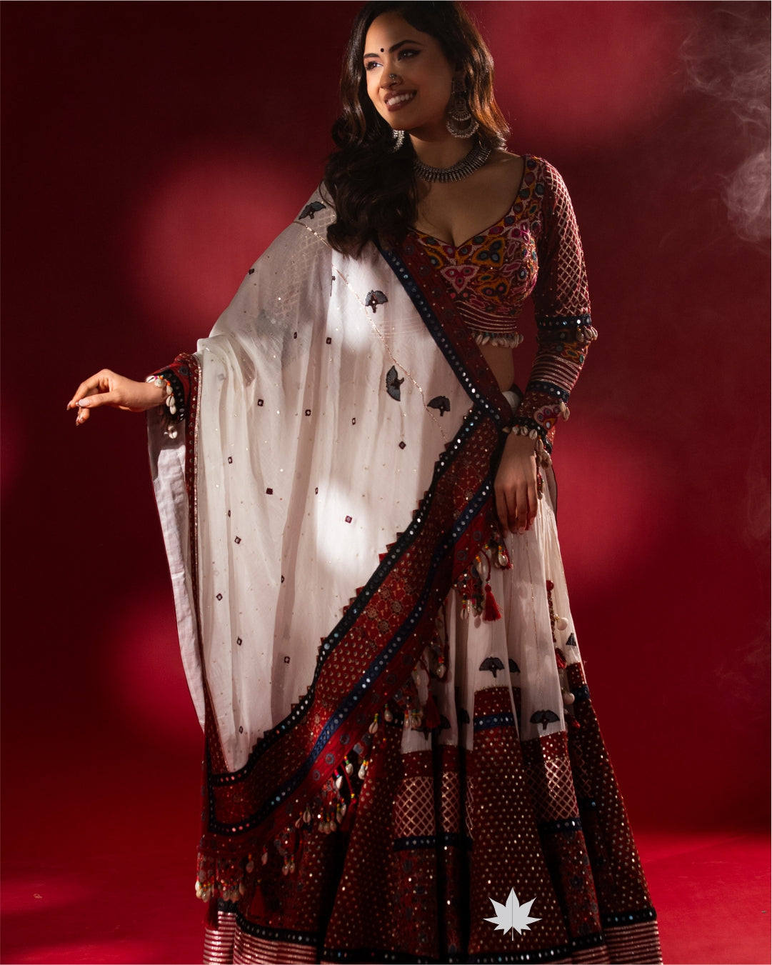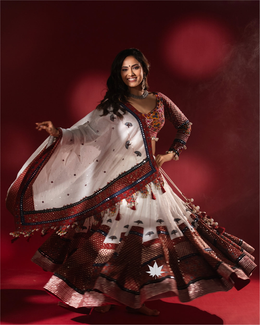 Celebrate tradition with our Maroon & White Gamthi Work Cotton Chaniya Choli, a masterpiece of vibrant craftsmanship. Designed in pure cotton fabric for all-day comfort, this outfit features detailed Gamthi embroidery that showcases the essence of Gujarati artistry. The rich maroon choli and lehenga paired with a crisp white base strike the perfect harmony of boldness and elegance, making it an ideal pick for Navratri, festive functions, and cultural events.