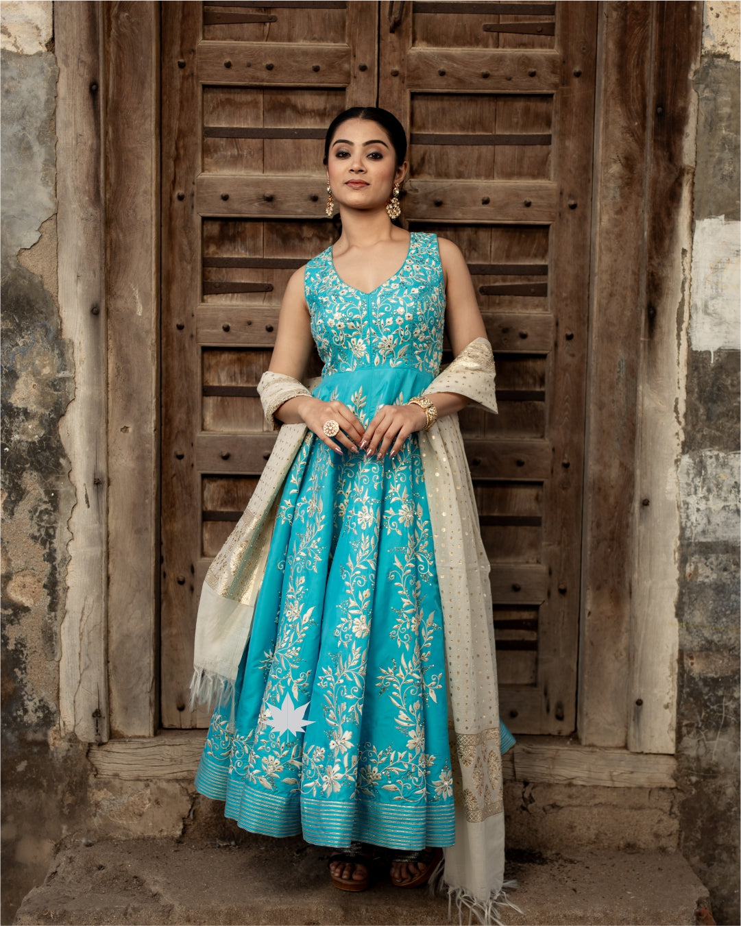 Moonlit Mirage – Aqua Blue Anarkali with Ivory Dupatta
