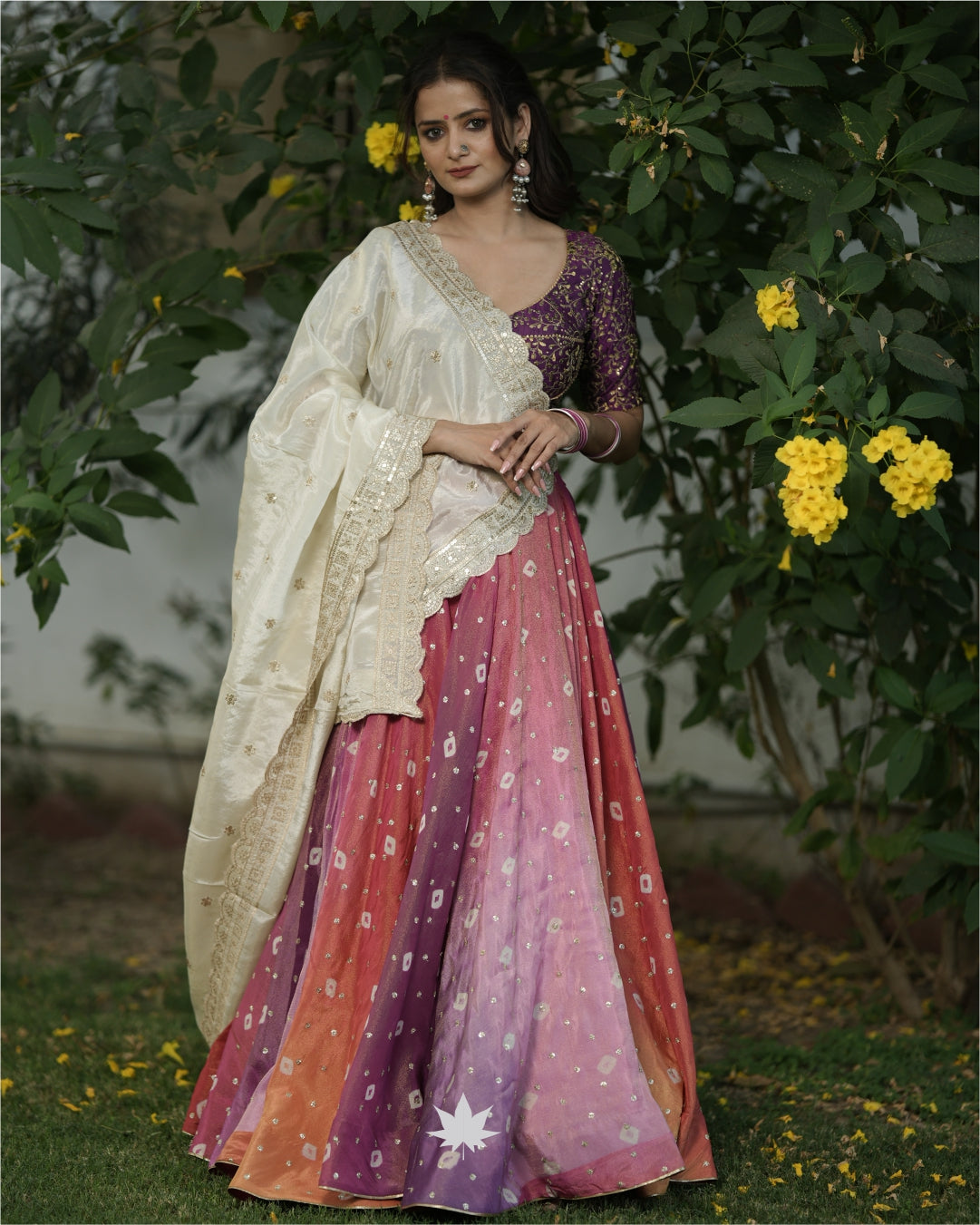 This multicolour ombré Bandhani lehenga choli is crafted in rich silk and paired with a purple silk blouse adorned with intricate embroidery work, and a soft ivory silk dupatta featuring delicate gold embroidery — a perfect choice for Navratri, festive celebrations, or traditional weddings.