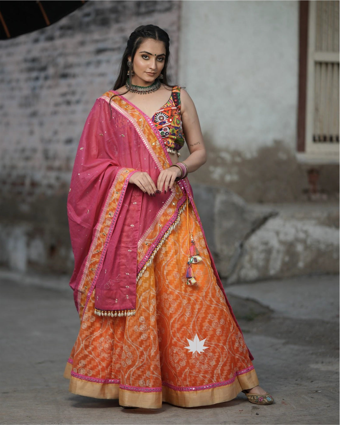 This vibrant orange chaniya choli set is crafted in rich Chanderi fabric, featuring a floral pattern and detailed with mirror work and a Gota Patti border. It’s paired with a Gamthi-style Kutchi work blouse and a soft pink dupatta highlighted with a shell lace border.