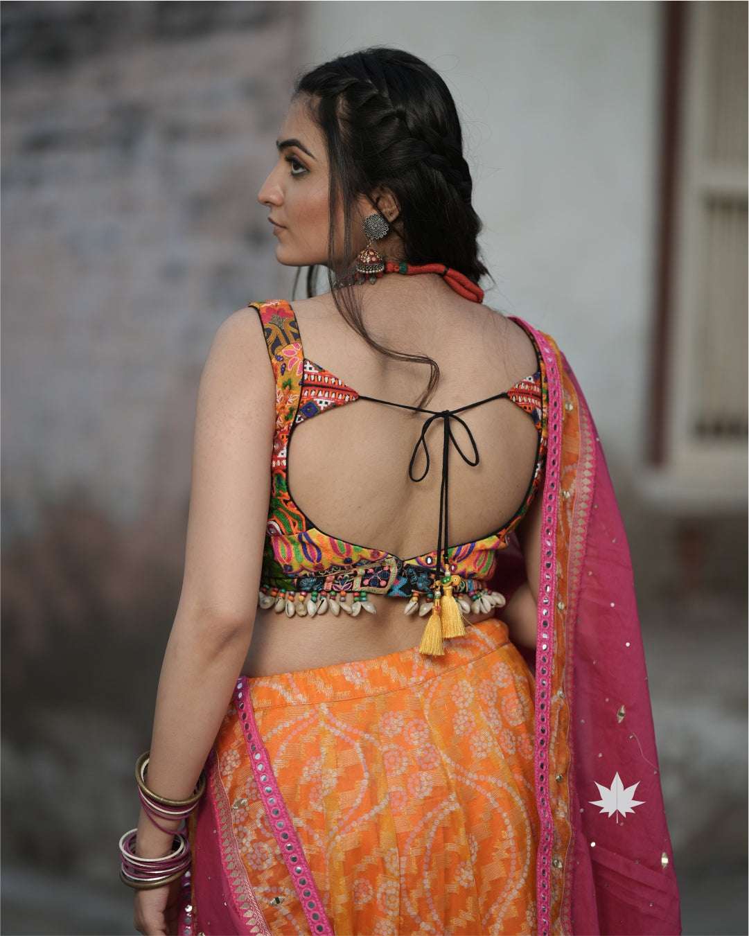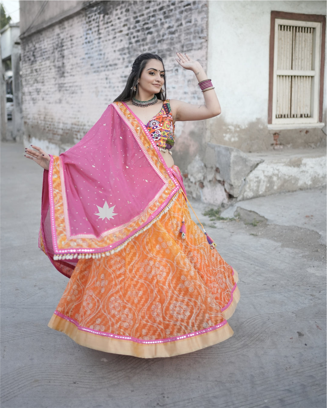 Orange And Pink Chaniya Choli Set With Gamthi Work Blouse