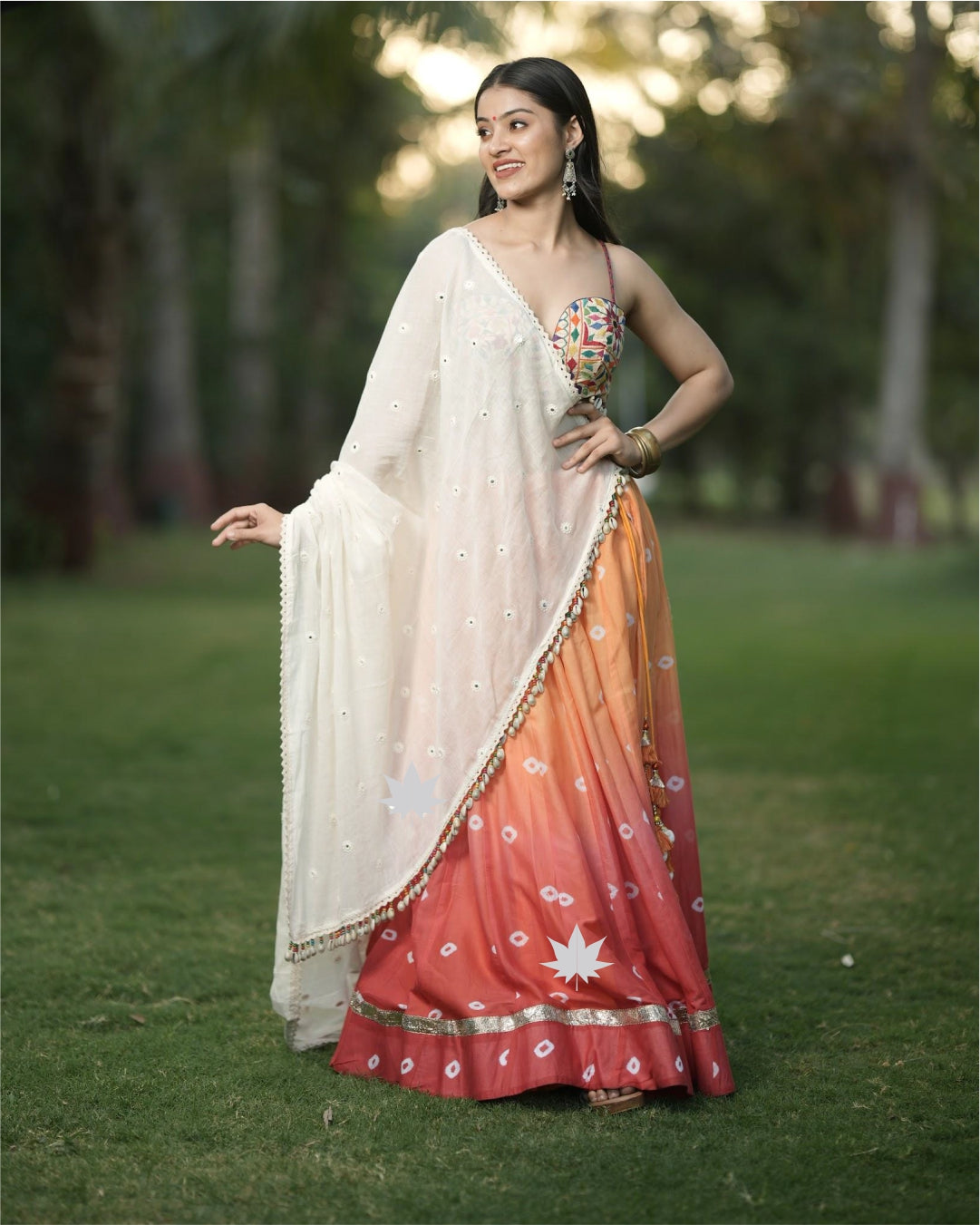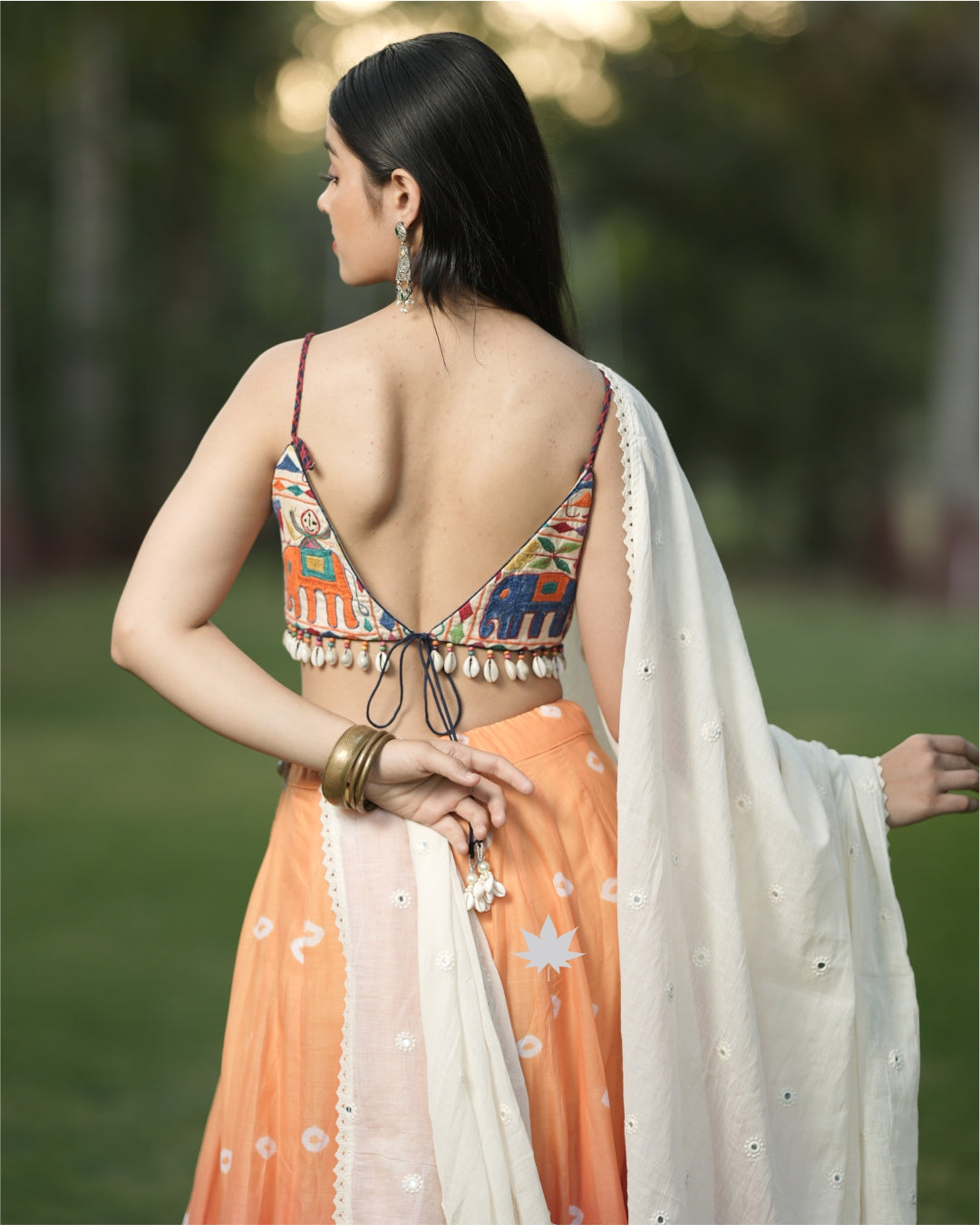 This orange ombré Bandhani lehenga choli is crafted in soft silk and paired with a traditional Kutchi embroidered blouse. It comes with a white cotton dupatta featuring delicate mirror work and a shell lace border, making it a perfect pick for Navratri, festive gatherings, or cultural celebrations.