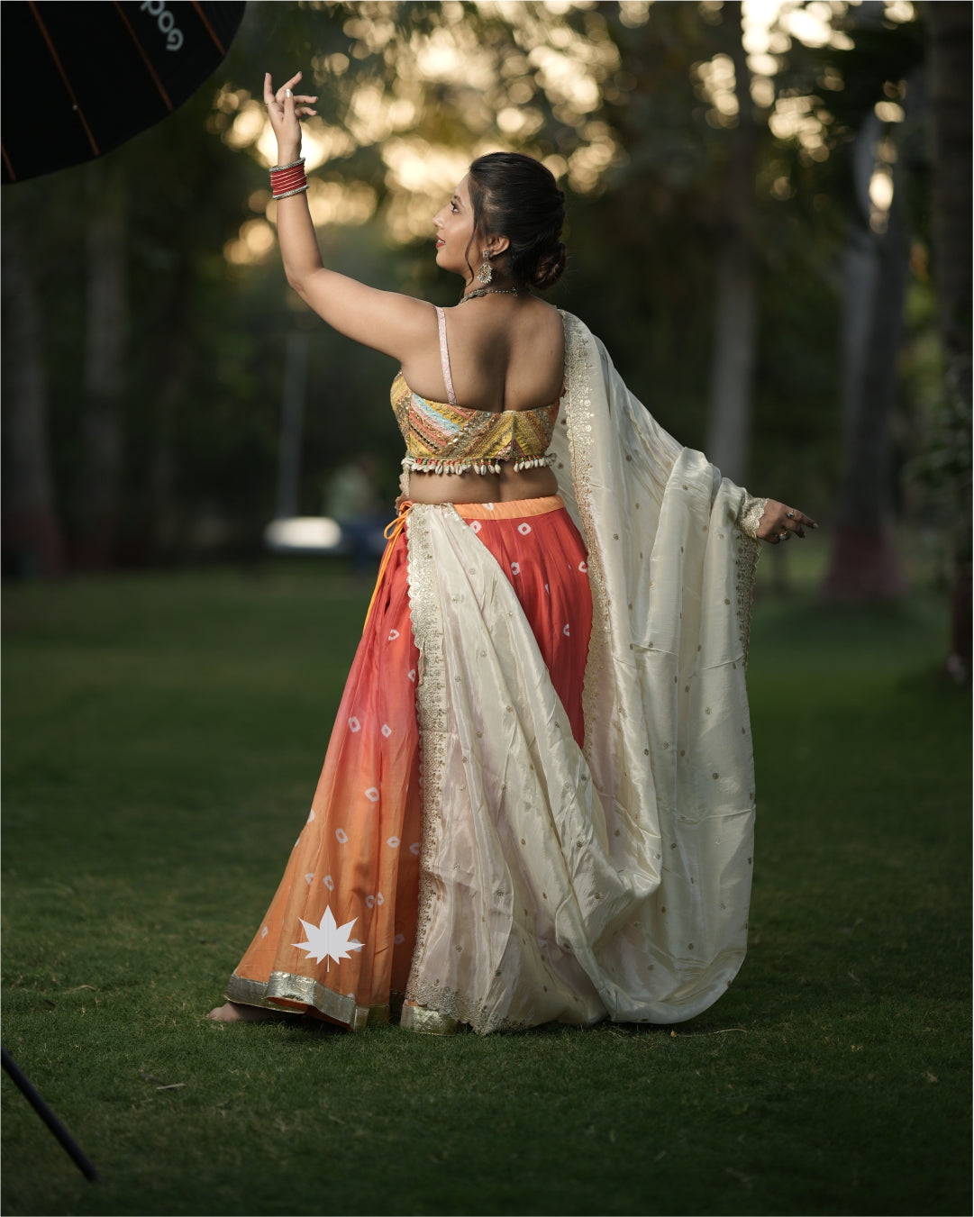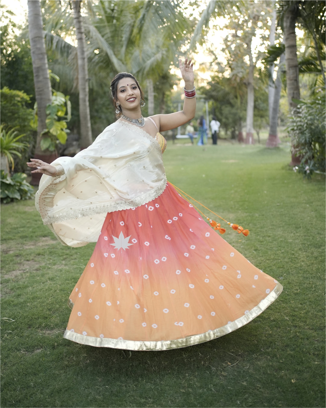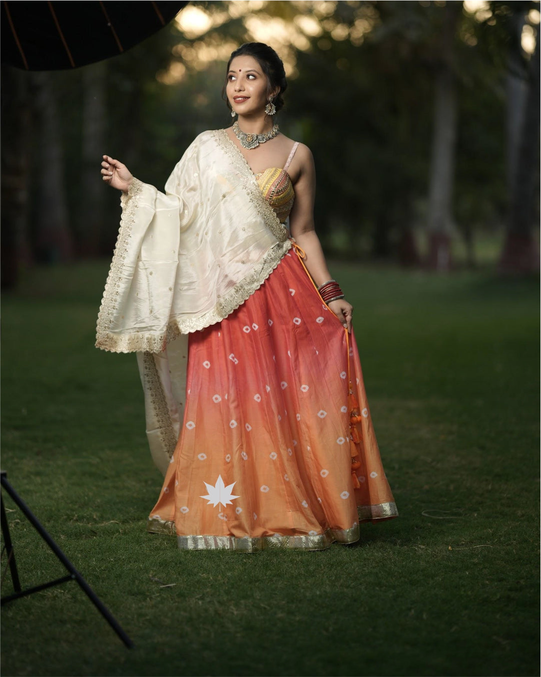 This orange ombré Bandhani lehenga choli is crafted in rich silk and detailed with traditional Gota Patti border. It’s paired with a patchwork blouse and a soft ivory silk dupatta finished with delicate gold embroidery. A perfect choice for Navratri, festive events, or traditional weddings.