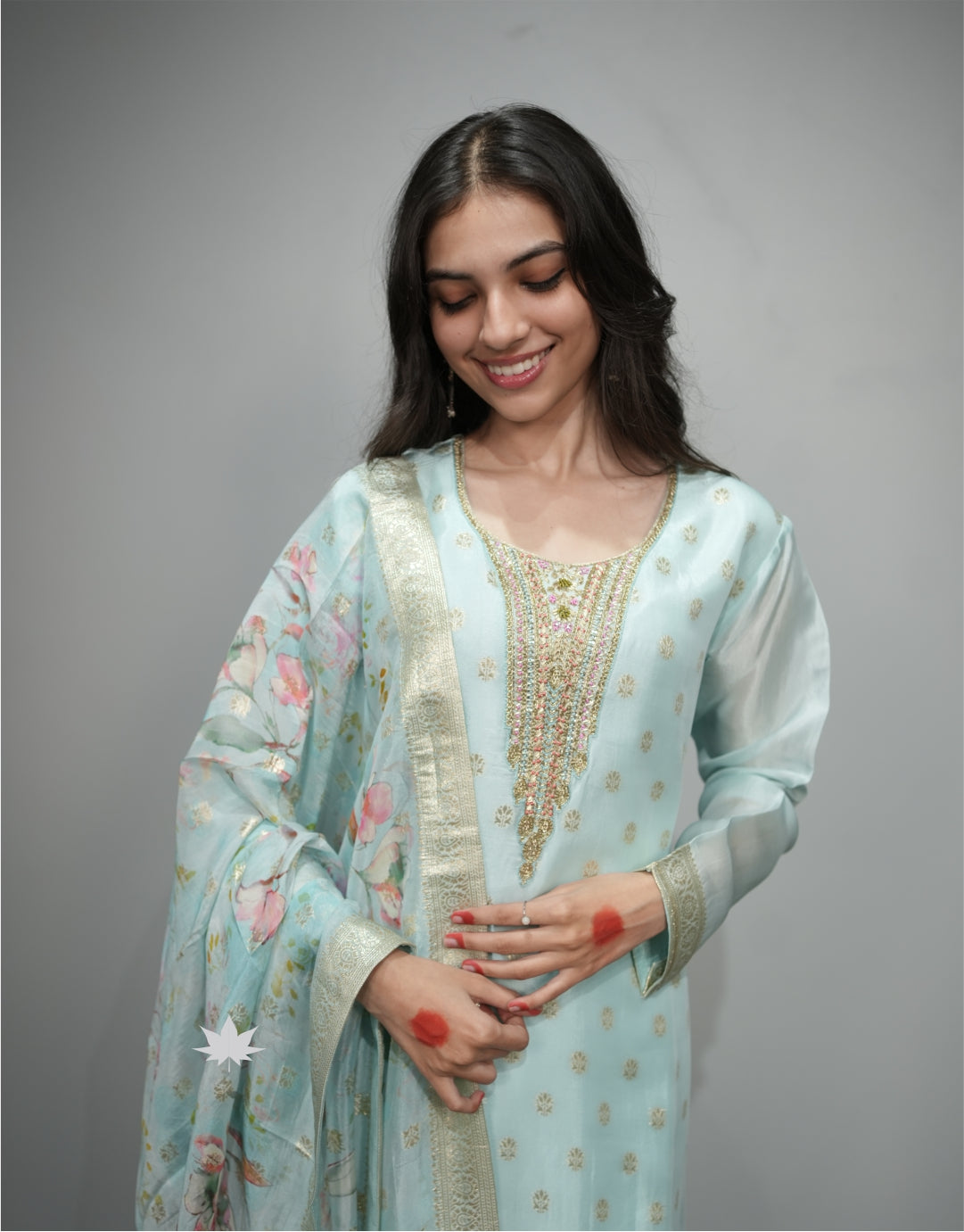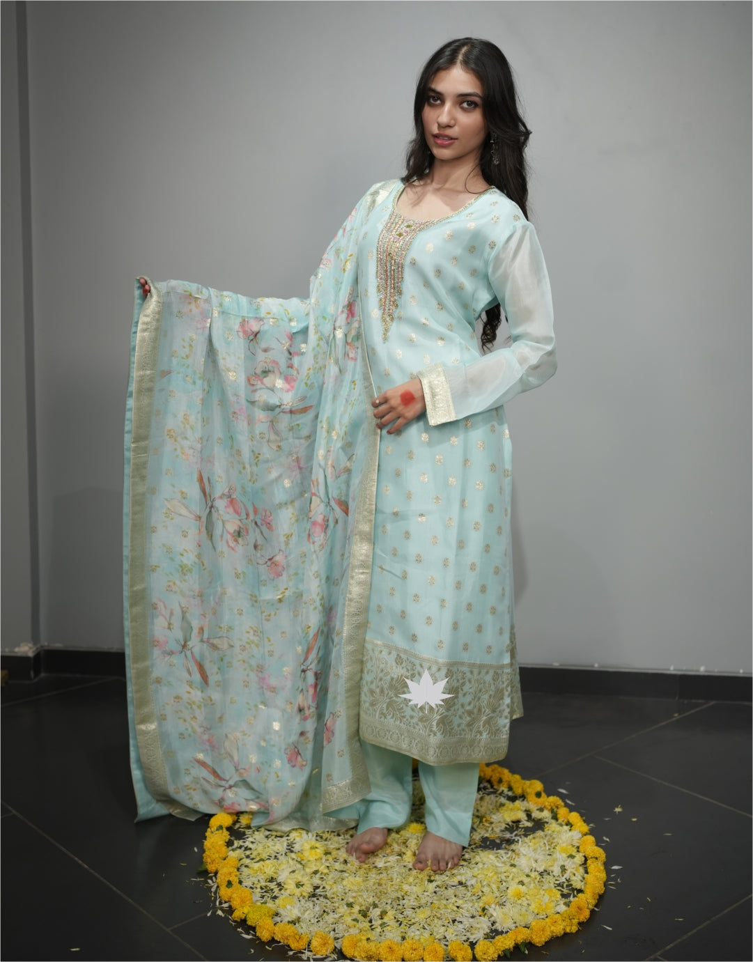 This Pastel Blue Banarasi Kurta Has Delicately Woven Motifs With A Heavy Border Paired With A Beautiful Matchin Dupatta And Staright Pants
