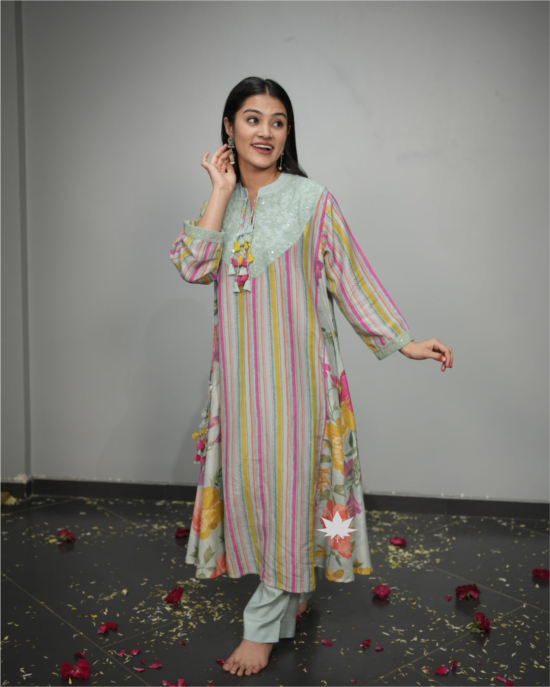This Pastel Green Kurta Has A Delicate Embroidery On The Neckline Enhanced With Tassels And A Unique Printed Design All Over It Paired With Staright Fit Pants