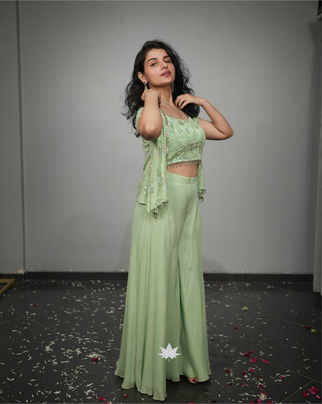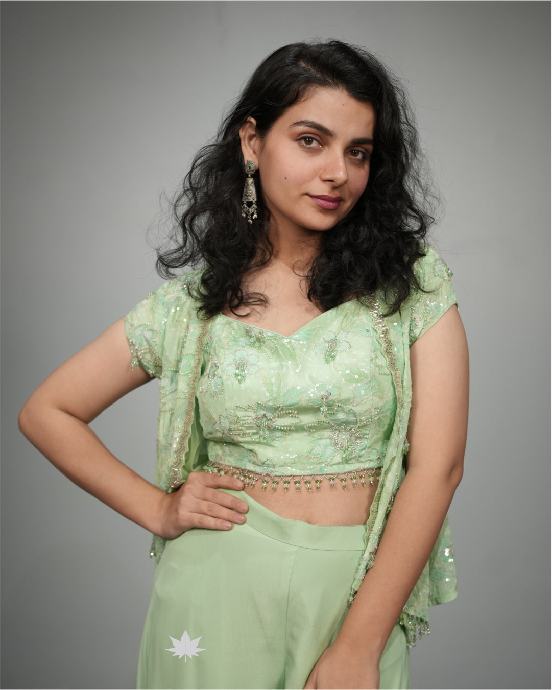 This Pastel Green Set Has A Handwork Blouse Paired With Flowy Pants And A Shrug With Hand Work Detailings On It
