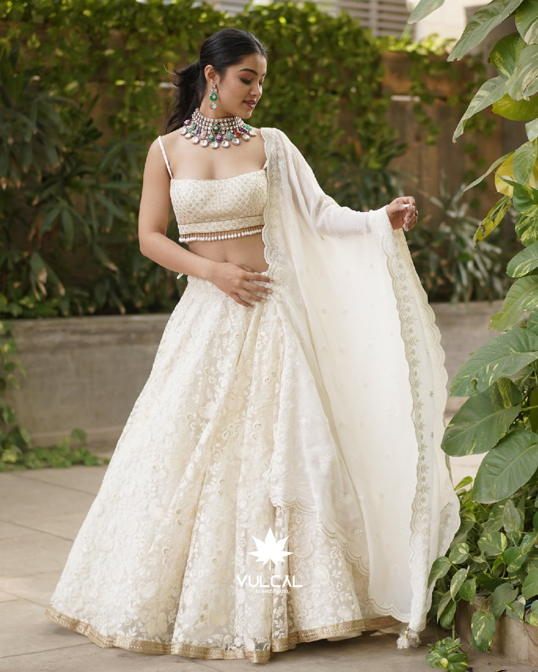 Our Pearl Lehenga Set is a beautiful choice for a day wedding or sangeet ceremony, featuring a pearl white silk lehenga adorned with delicate thread work that resembles the beauty of pearls. The matching sequence work blouse complements the lehenga, while the georgette dupatta adds a delicate finishing touch. The golden lace at the bottom of the lehenga adds a touch of elegance and sophistication to the ensemble. Whether it's a traditional pre-wedding event or a festive celebration, our Pearl Lehenga Set is sure to captivate with its timeless beauty and understated allure