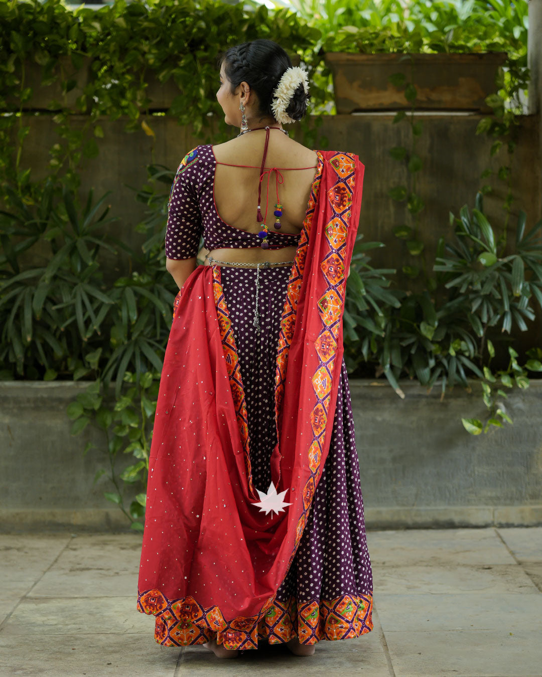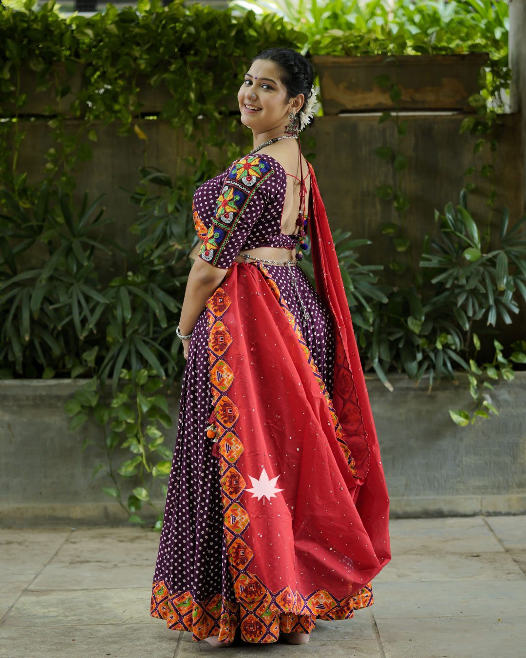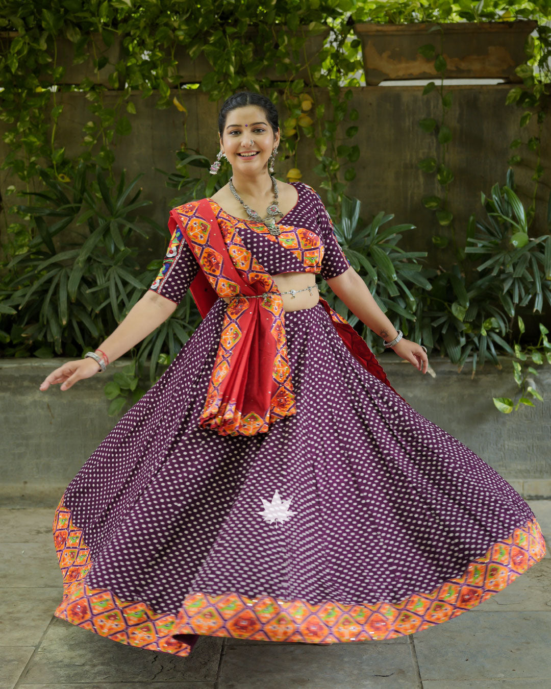 This Purple Bandhani Chaniya Has A Contrasting Patola Border To It Paired With A Matching Patchwork Blouse And A Contrasting Red Dupatta