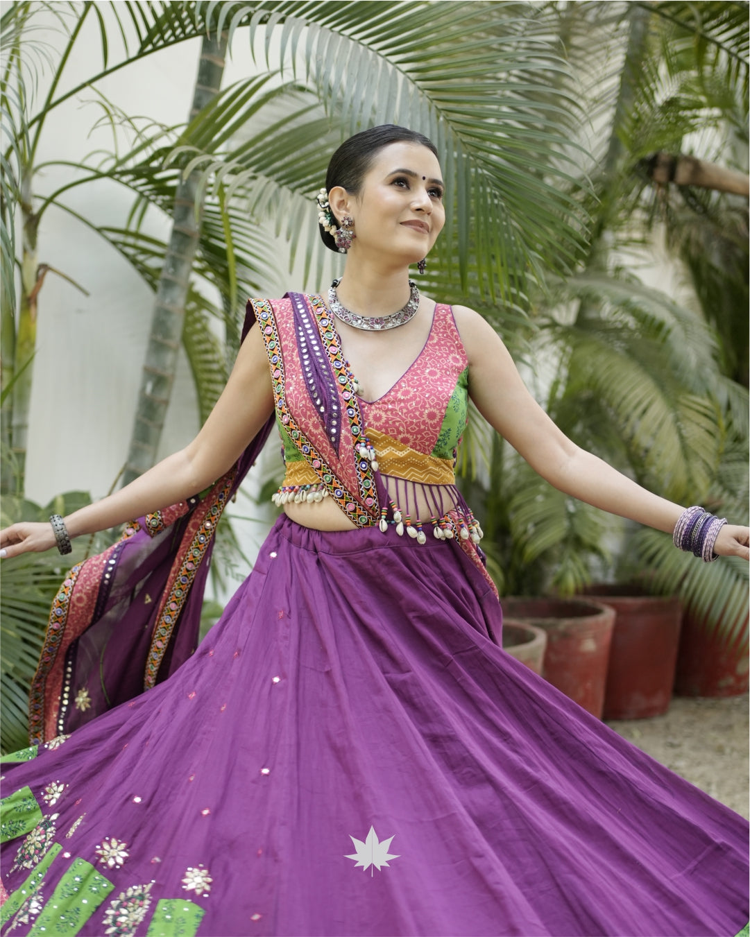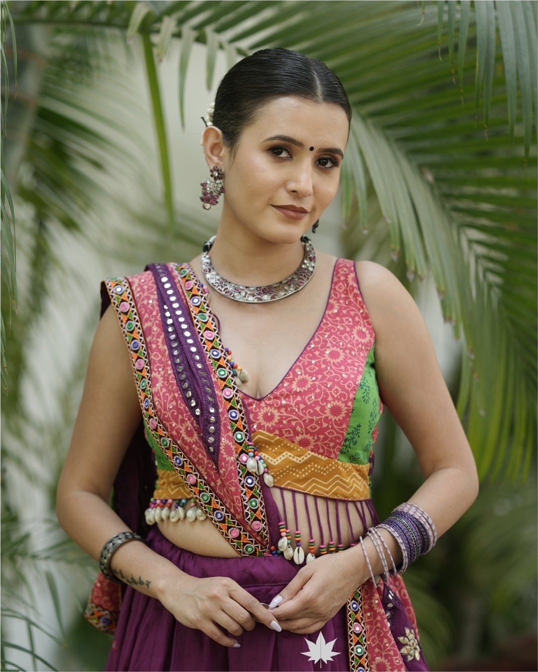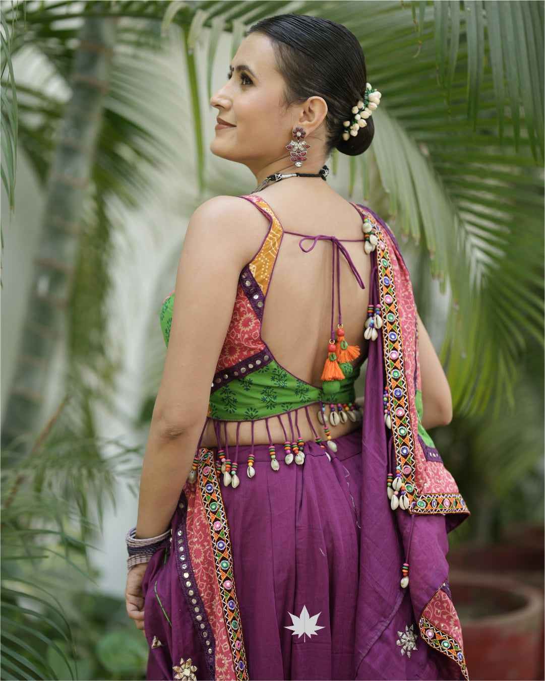 This purple cotton chaniya and a multicolor block print blouse featuring shell tassels. Paired with a beautifully crafted dupatta, highlighted with mirror work borders and thread embroidery. A perfect pick for Navratri, Garba nights, or festive celebrations.