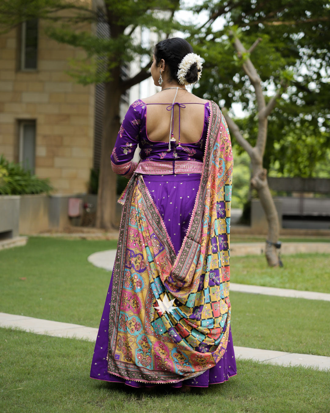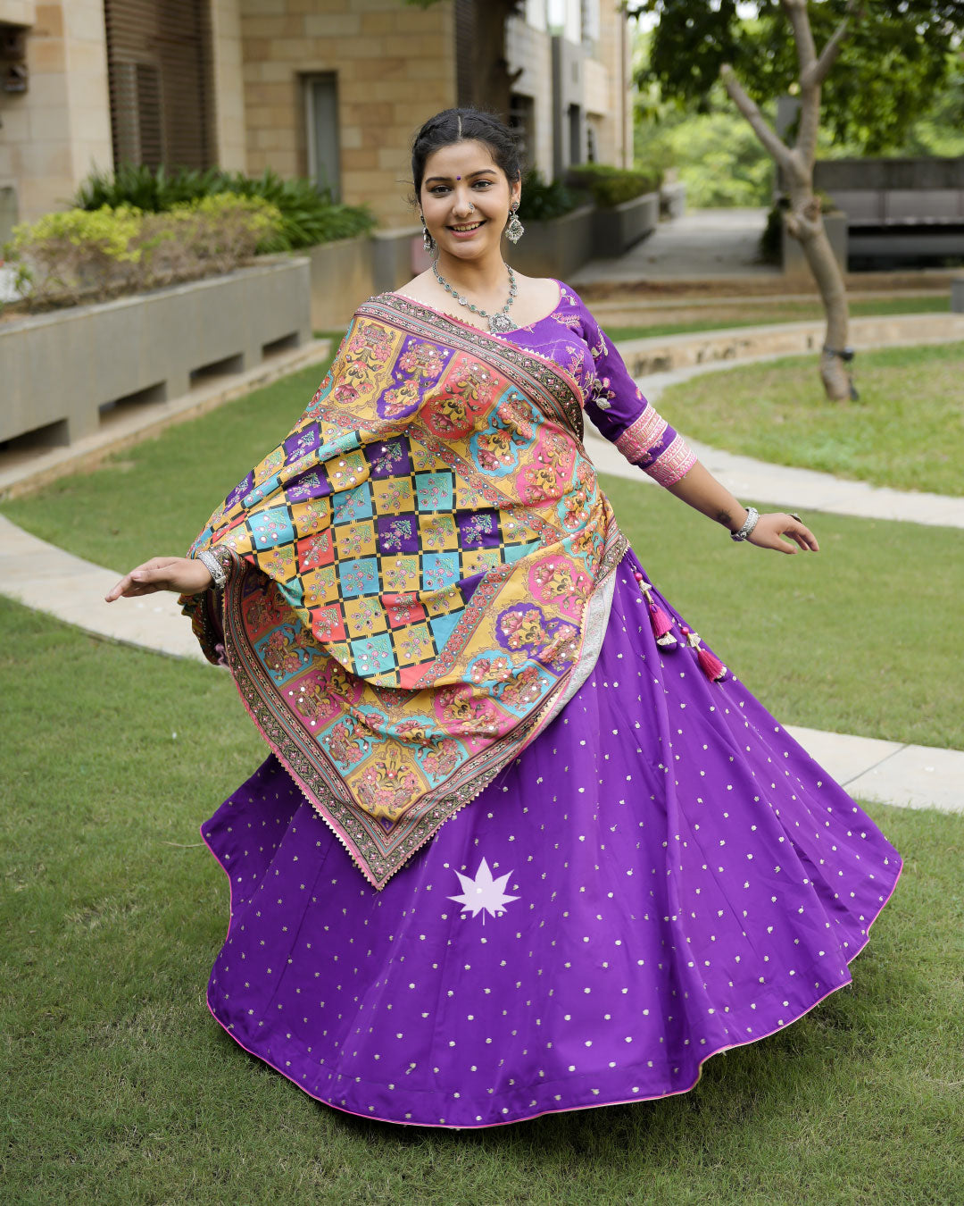 This Vibrant Purple Chaniya Has Embellishments All Over It Paired With A Matching Floal Work Blouse And A Multicolor Mirror Work Dupatta