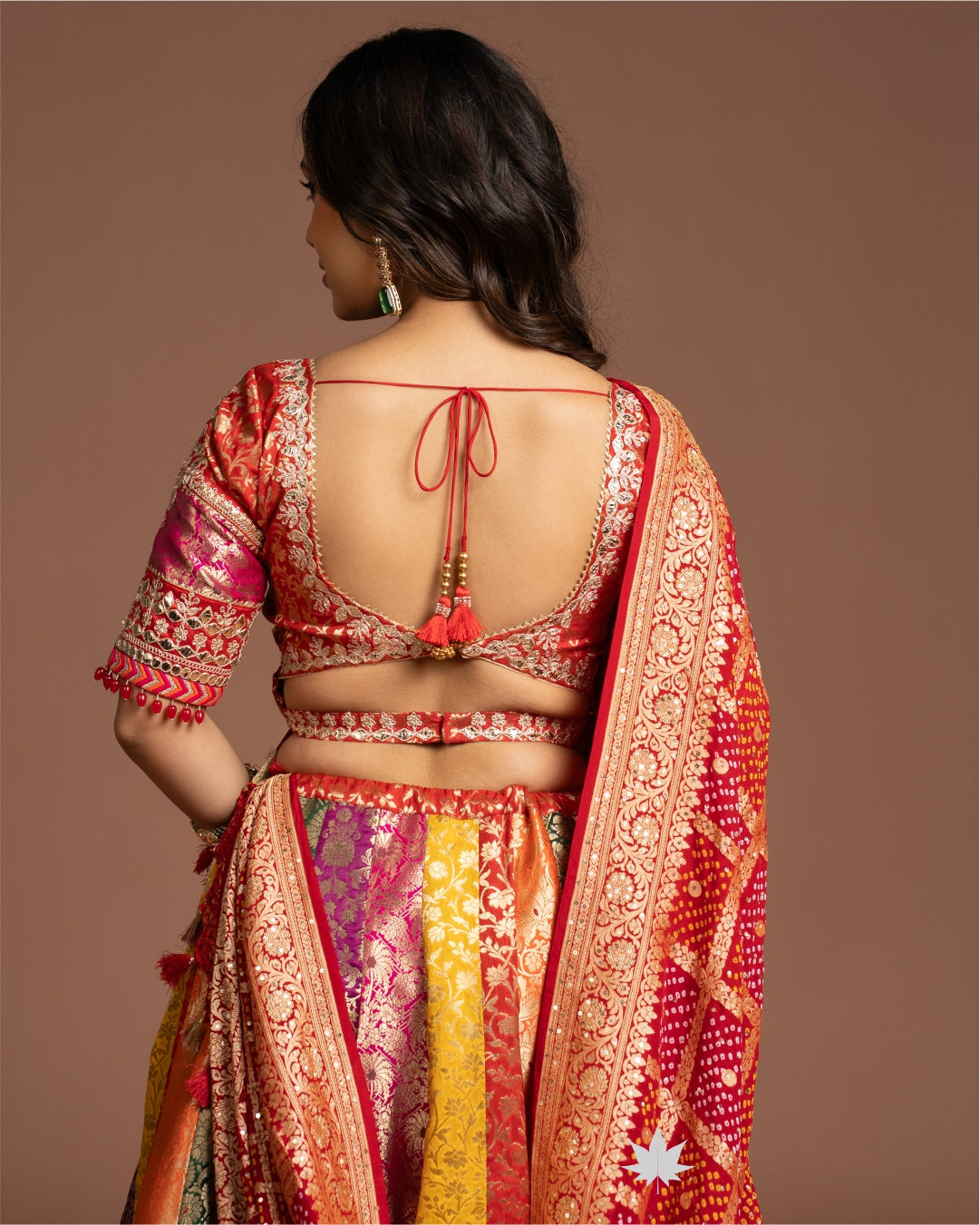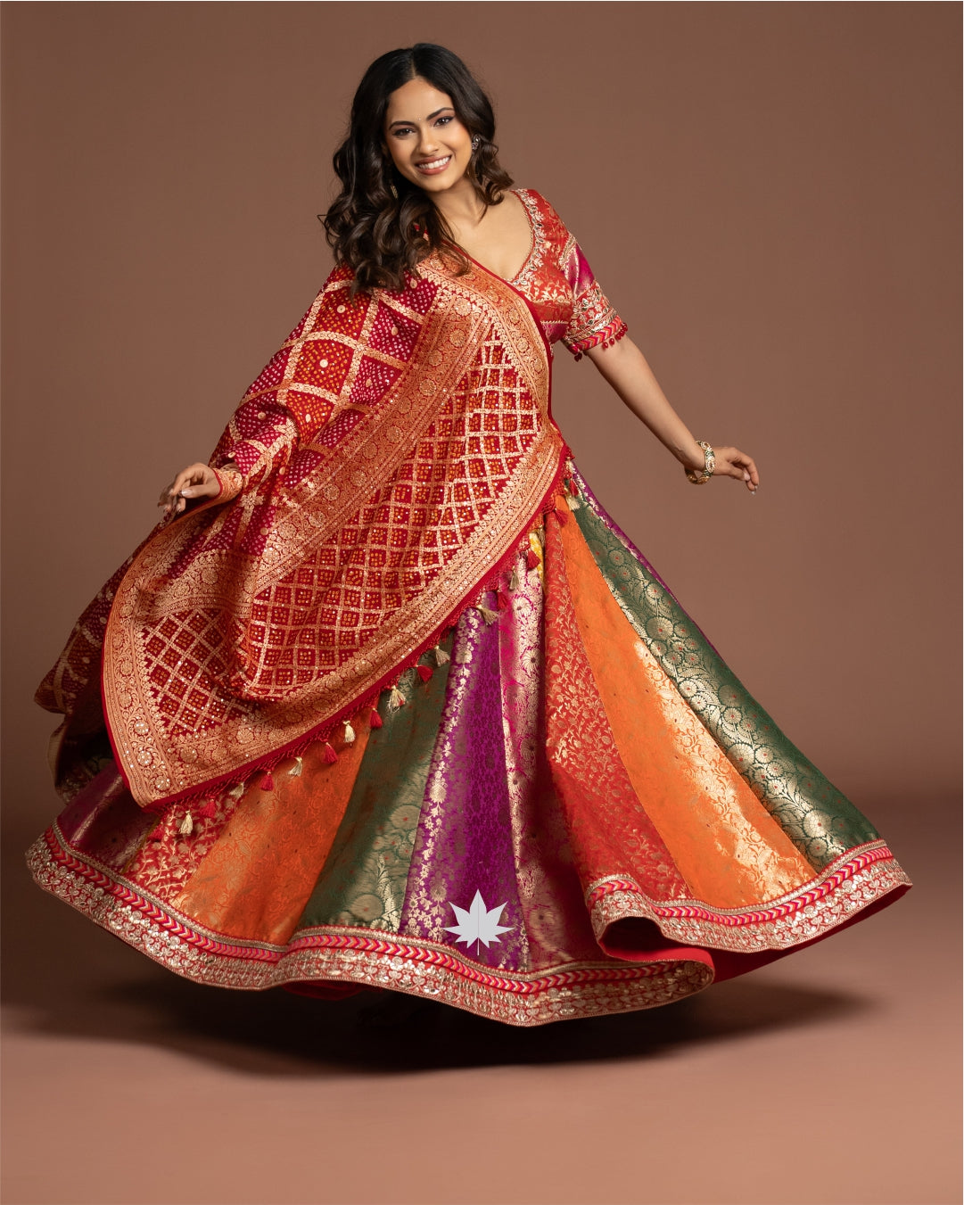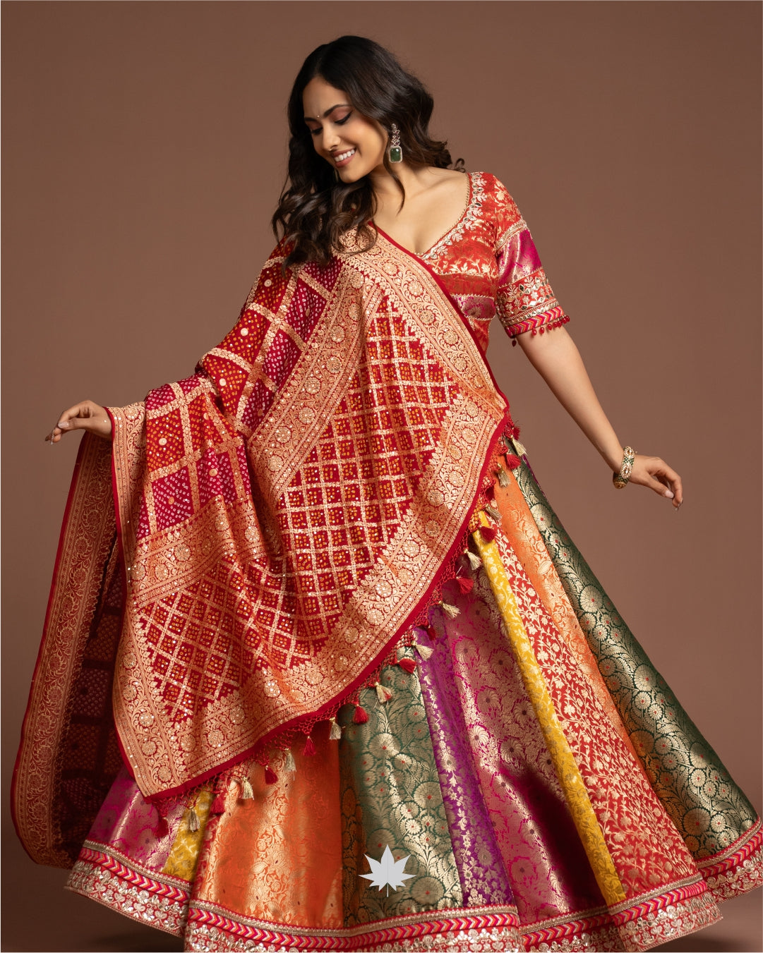 Make a bold festive statement with our RangManjari Brocade Chaniya Choli. Featuring a vibrant multicolor chaniya paired with a rich red brocade blouse, this ensemble exudes traditional charm and luxury. The premium brocade fabric of the blouse adds a subtle sheen and elegance, while the multicolor chaniya brings lively energy to your celebrations. Perfect for Navratri nights, weddings, and cultural gatherings, this set is designed to make you stand out with grace and style.