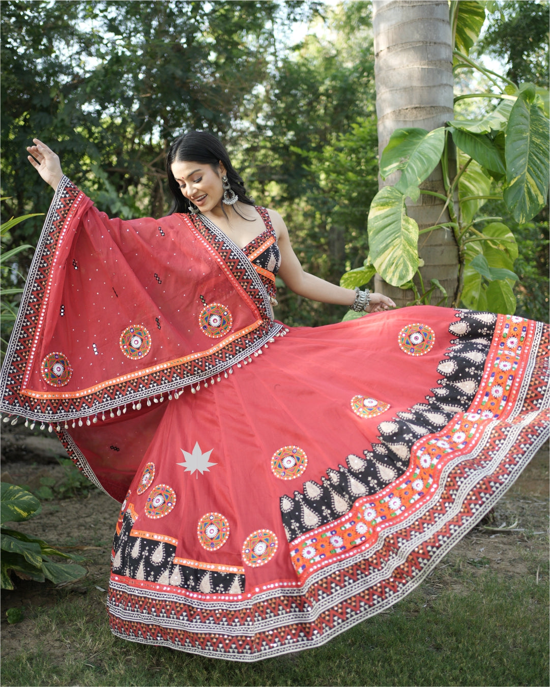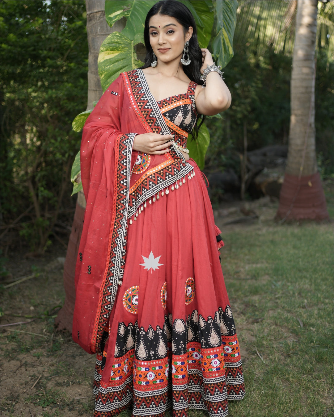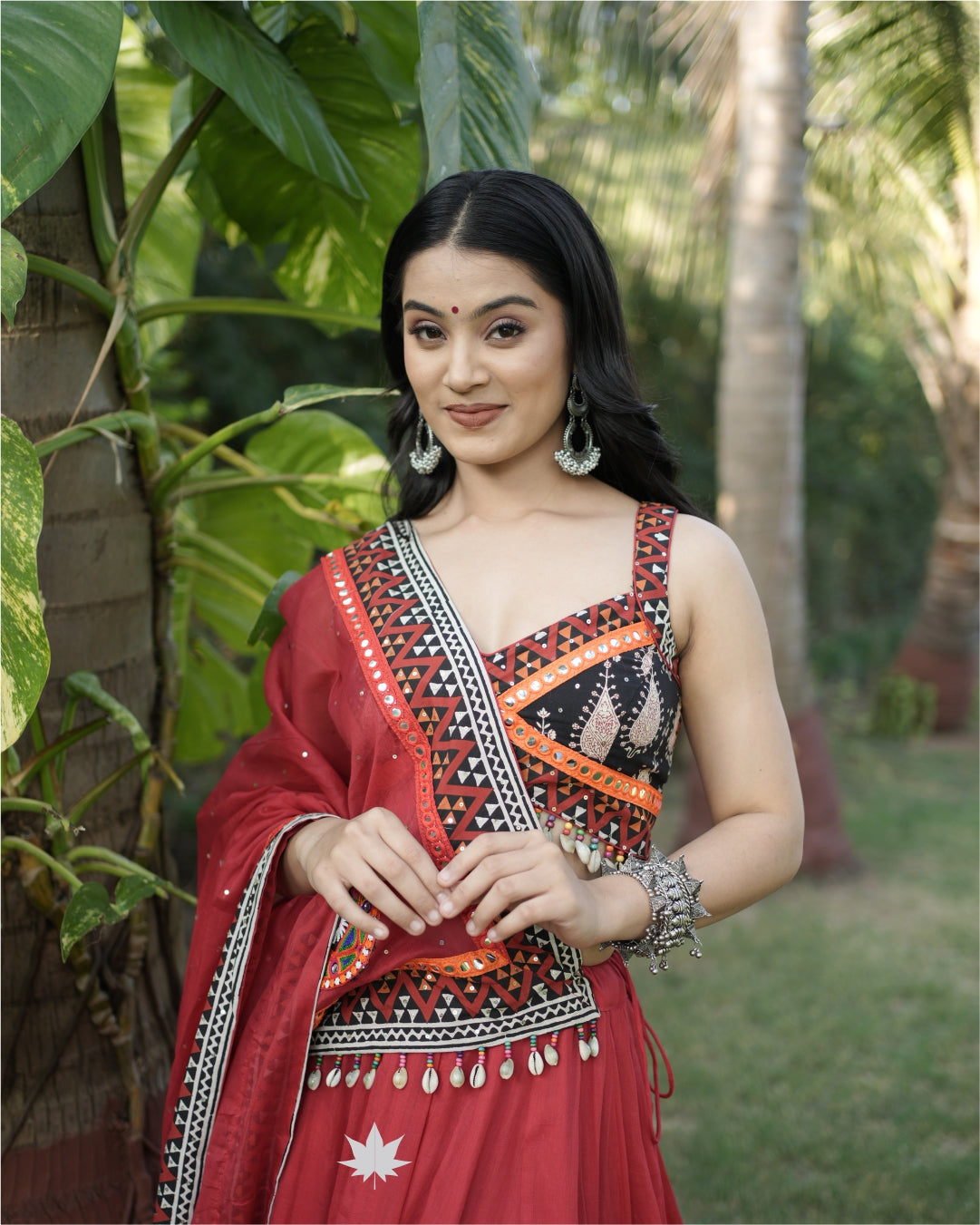 This vibrant red cotton chaniya choli set features a flared skirt with traditional mirror work and Gamthi-style embroidered patches. The sleeveless blouse is designed with classic block prints. Paired with a matching red dupatta finished with mirror work and printed borders. Perfect for Navratri, folk dances, and festive celebrations.