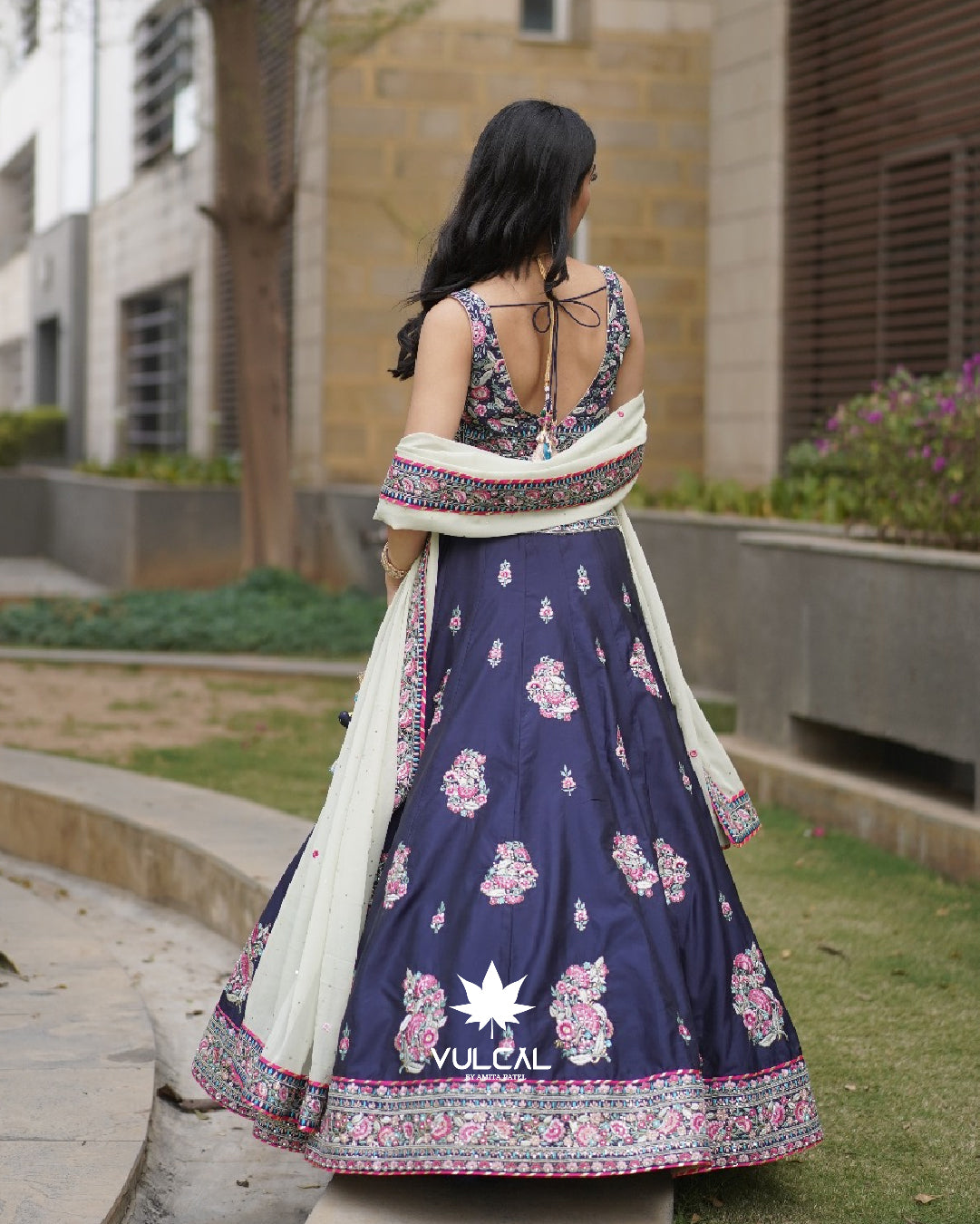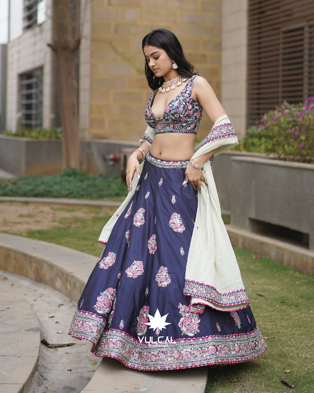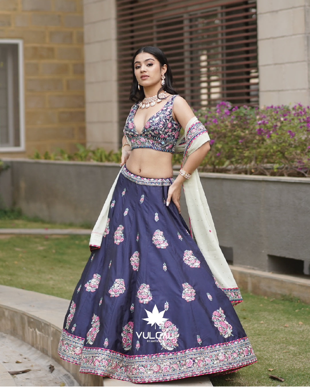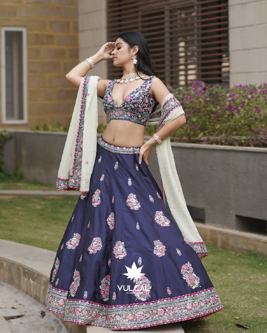 Introducing our Royal Amethyst Lehenga Set, a stunning ensemble crafted for elegance and grace. This exquisite set features a rich blue silk lehenga adorned with a heavy border, exuding regal charm and sophistication. Paired with an organza dupatta, the ensemble strikes a perfect balance of opulence and purity. Whether it's a wedding, a festive celebration, or a special event, the Royal Amethyst Lehenga Set is sure to captivate all eyes with its timeless beauty and allure.