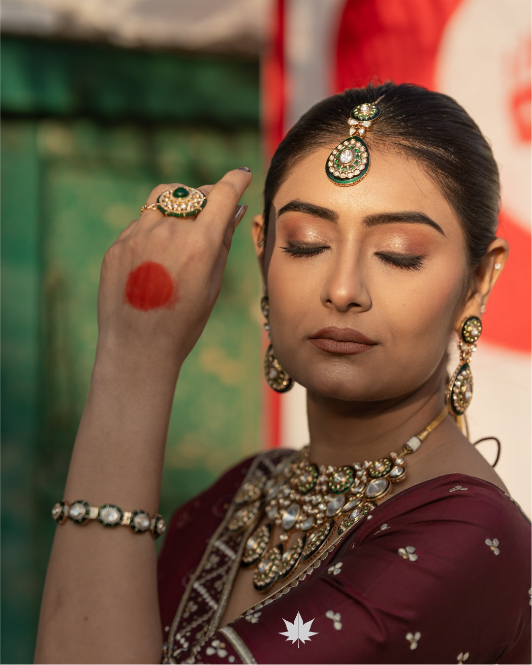 Embrace regal elegance with this stunning Royal Ember Maroon Lehenga, intricately adorned with golden threadwork that reflects the richness of heritage craftsmanship. The deep maroon hue, symbolizing grandeur and sophistication, is complemented by elaborate floral and Georgette metric embroidery, making this lehenga a perfect choice for brides and wedding celebrations.