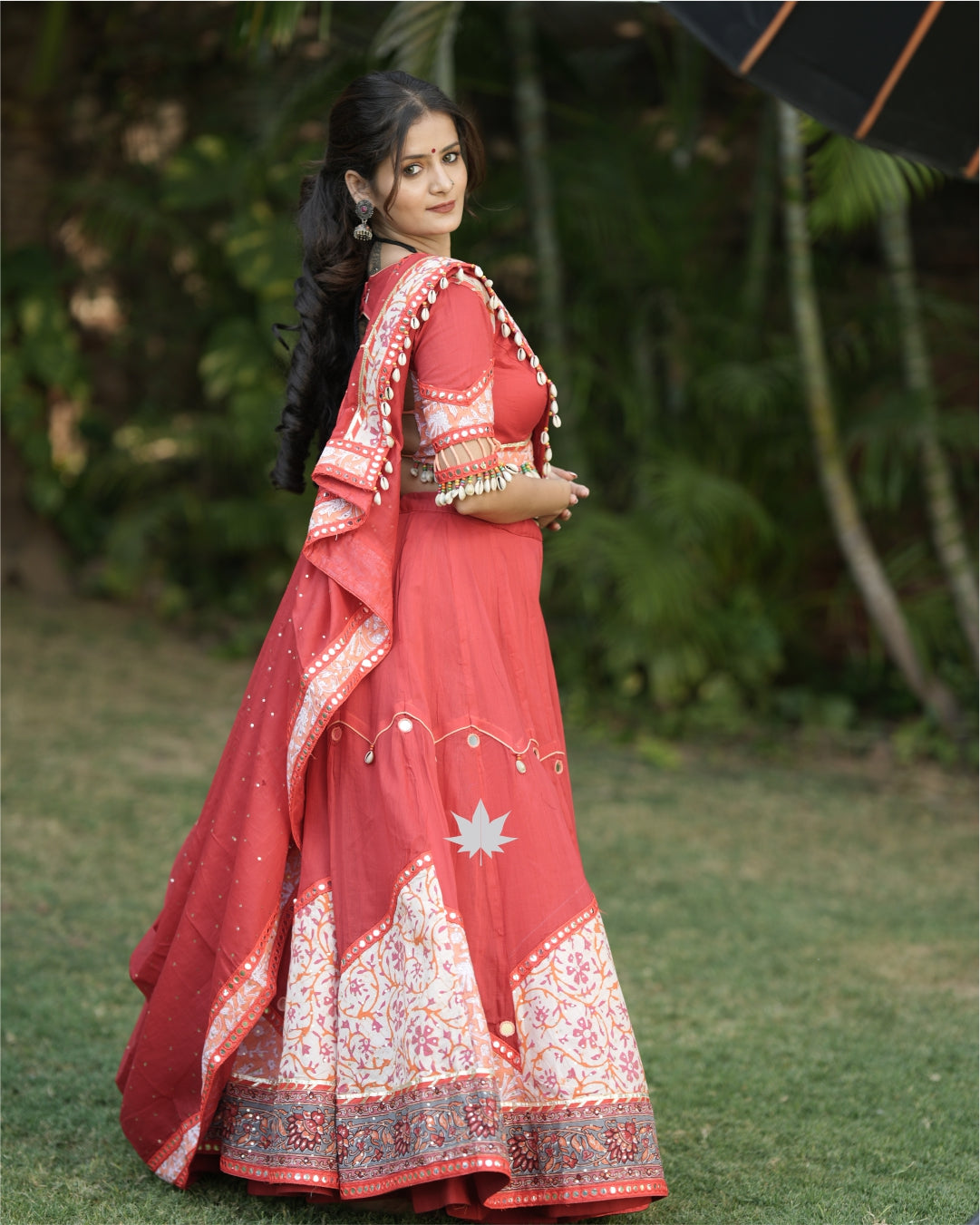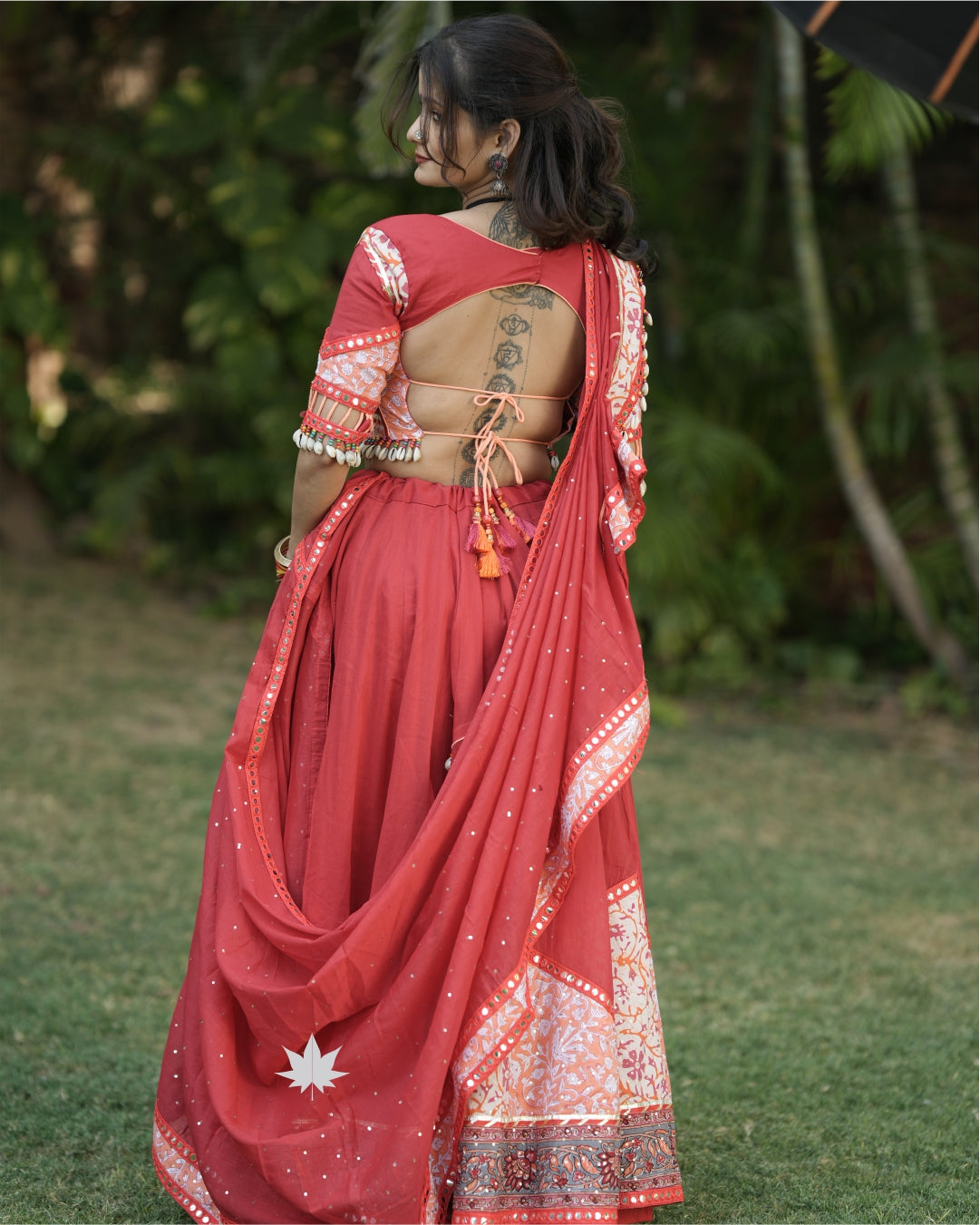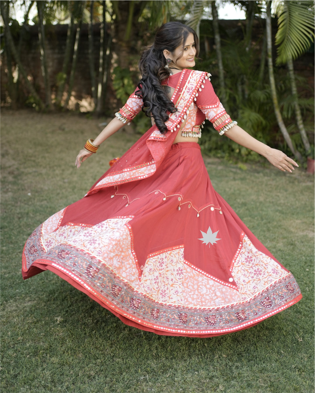 This rust red chaniya choli set features a flared skirt with intricate mirror work. The matching blouse is detailed with shell embellishments and delicate stitching. Paired with a printed dupatta, this ensemble blends folk charm with elegance — ideal for Navratri, weddings, and festive gatherings.