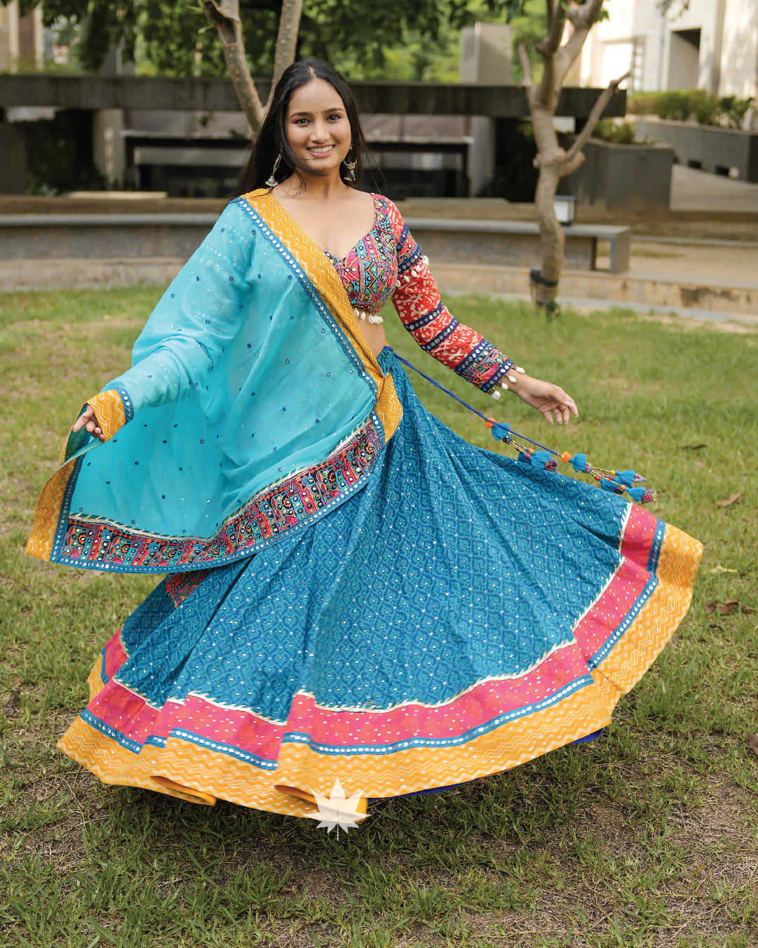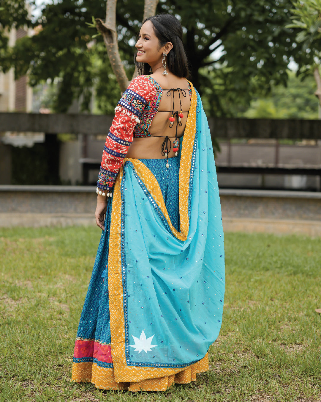This turquoise chaniya has a contrasting pink and yellow border to it paired with a Gamthi patchwork blouse and a blue dupatta
