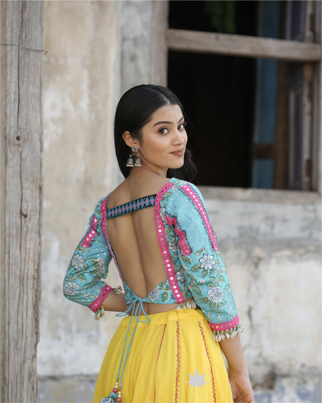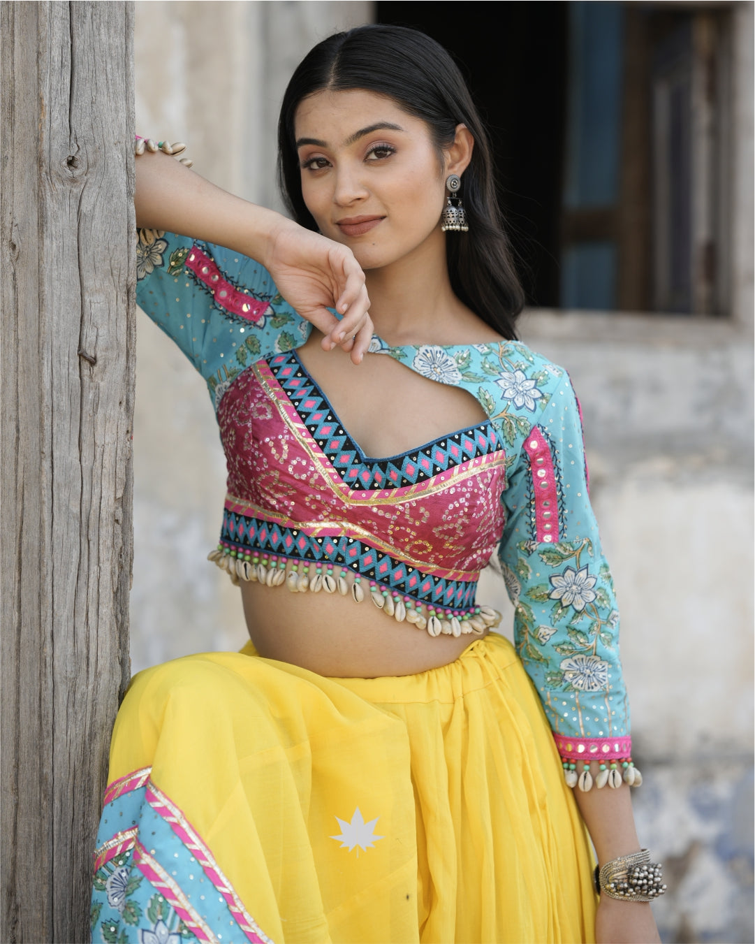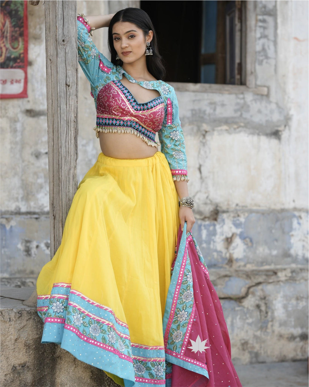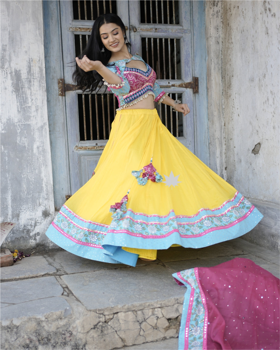 This vibrant cotton chaniya choli set features a flared yellow skirt finished with turquoise and pink floral print borders. The blouse, crafted on a pink bandhani base, is richly embellished with mirror work, intricate thread embroidery, and shell tassel detailing. It is paired with a pink dupatta highlighted with deity mirror work and cowrie tassels. A bright and joyful ensemble for Garba nights, festive celebrations, and traditional gatherings.