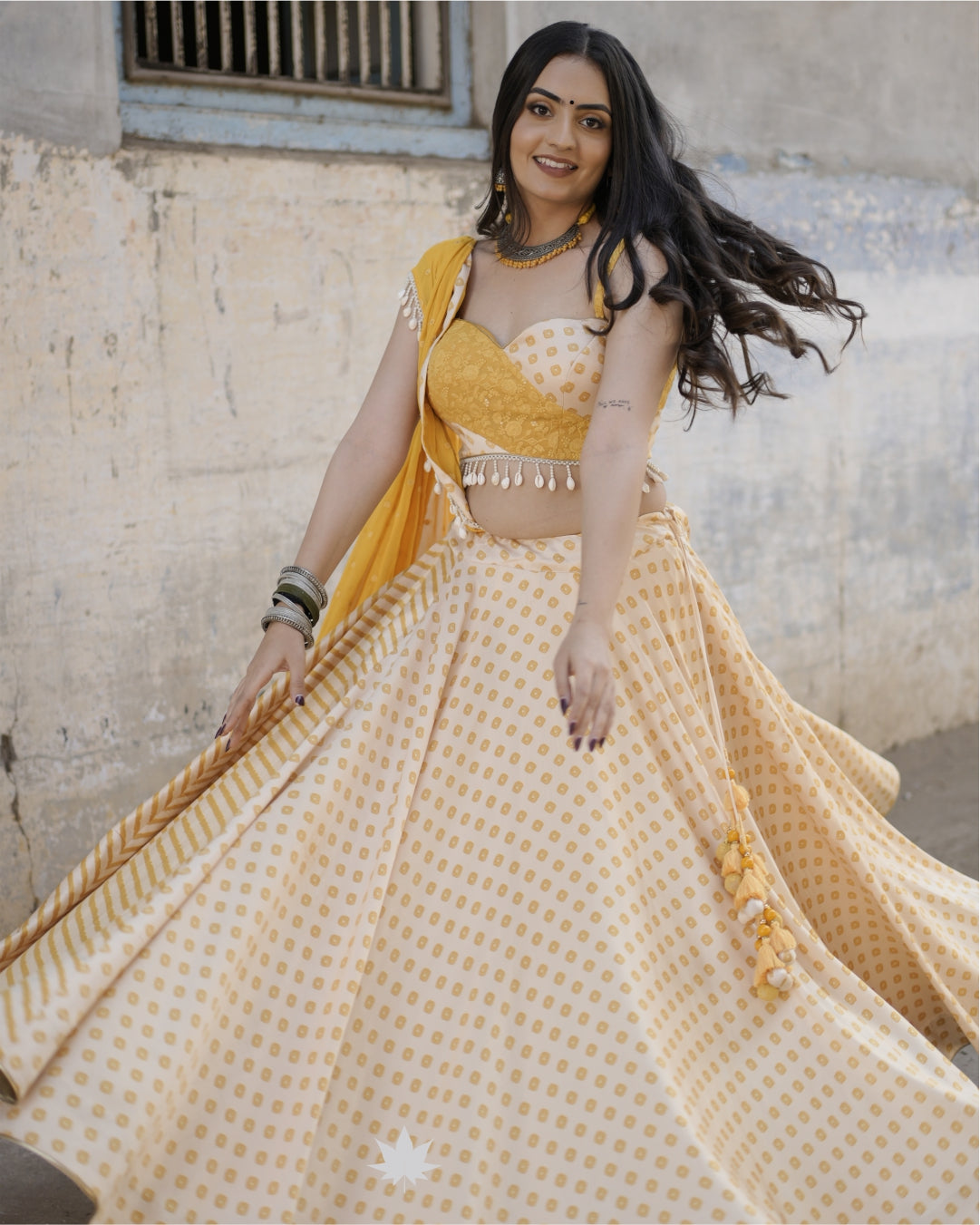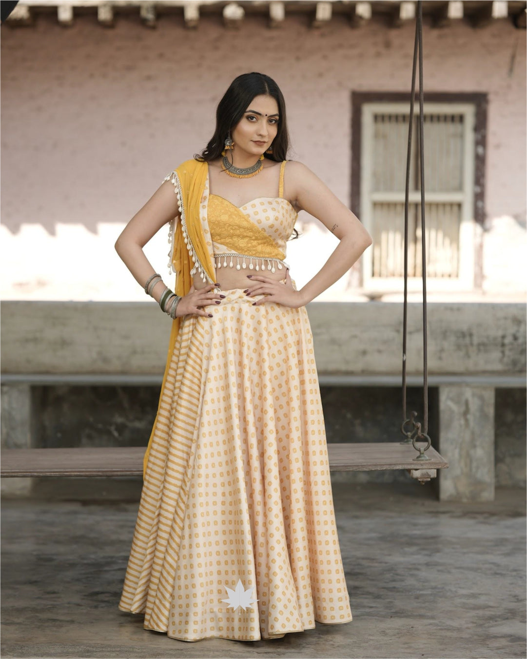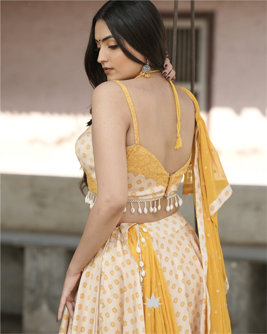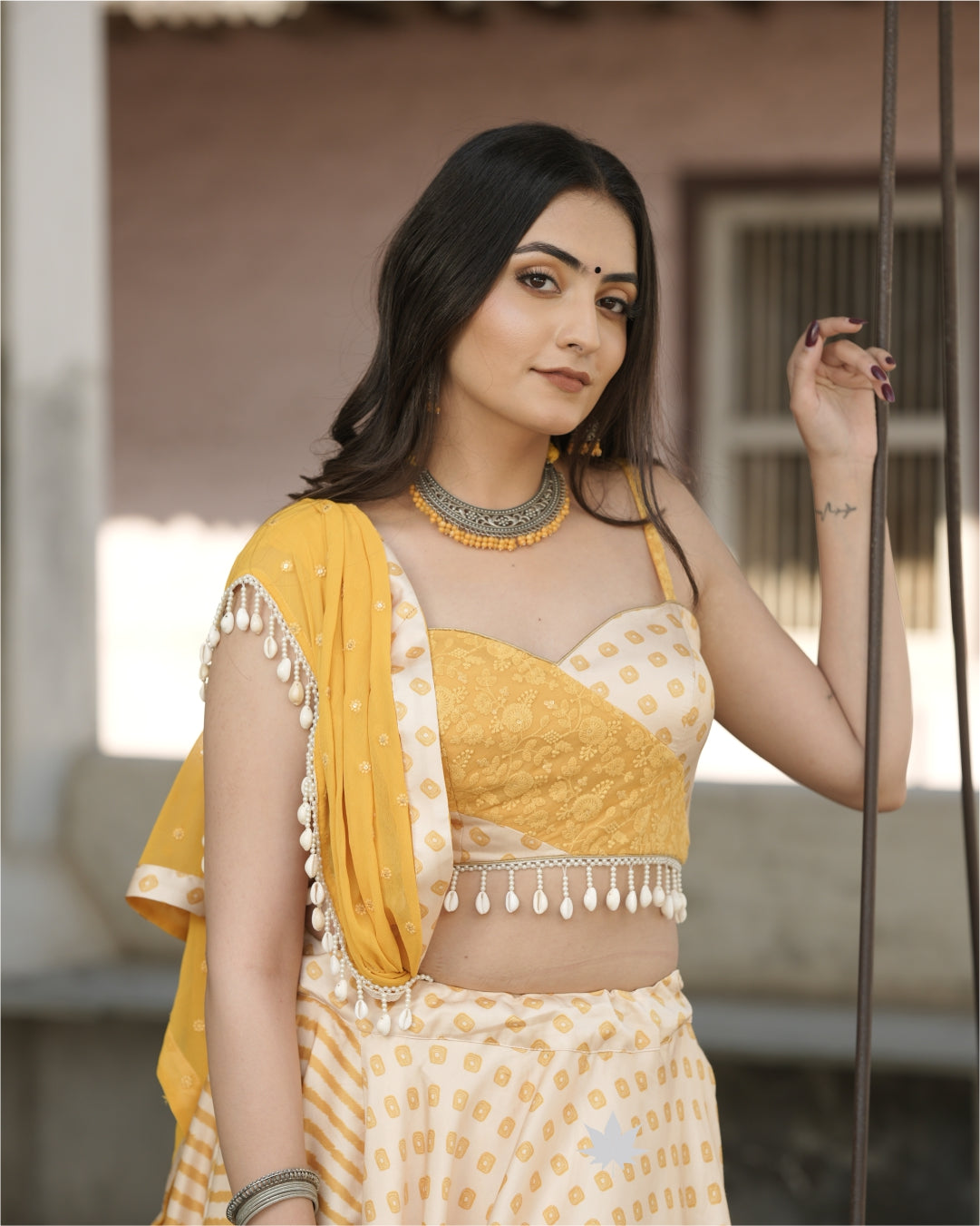 This vibrant silk chaniya choli set features a flowy skirt with a mix of leheriya and bandhani-inspired prints. The asymmetrical blouse is made with solid mustard silk and bandhani print, decorated with mirror work and shell tassels. It is paired with a mustard dupatta detailed with thread work and shell tassels. A light and cheerful choice for Garba nights, haldi ceremonies, and festive summer celebrations.